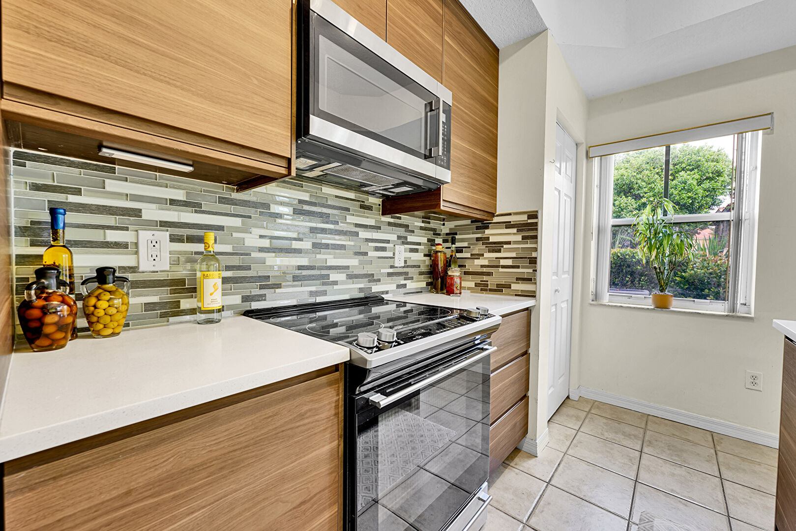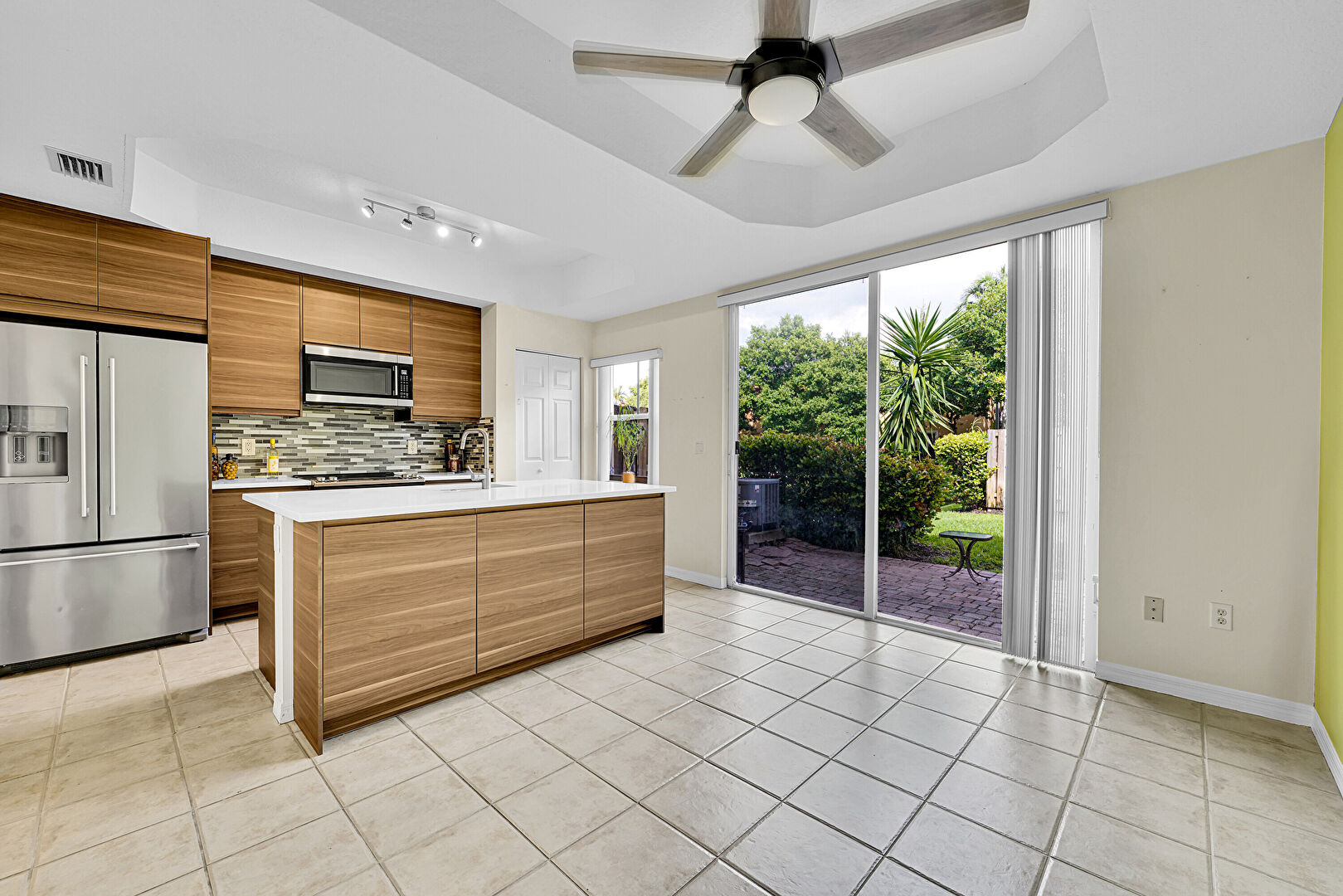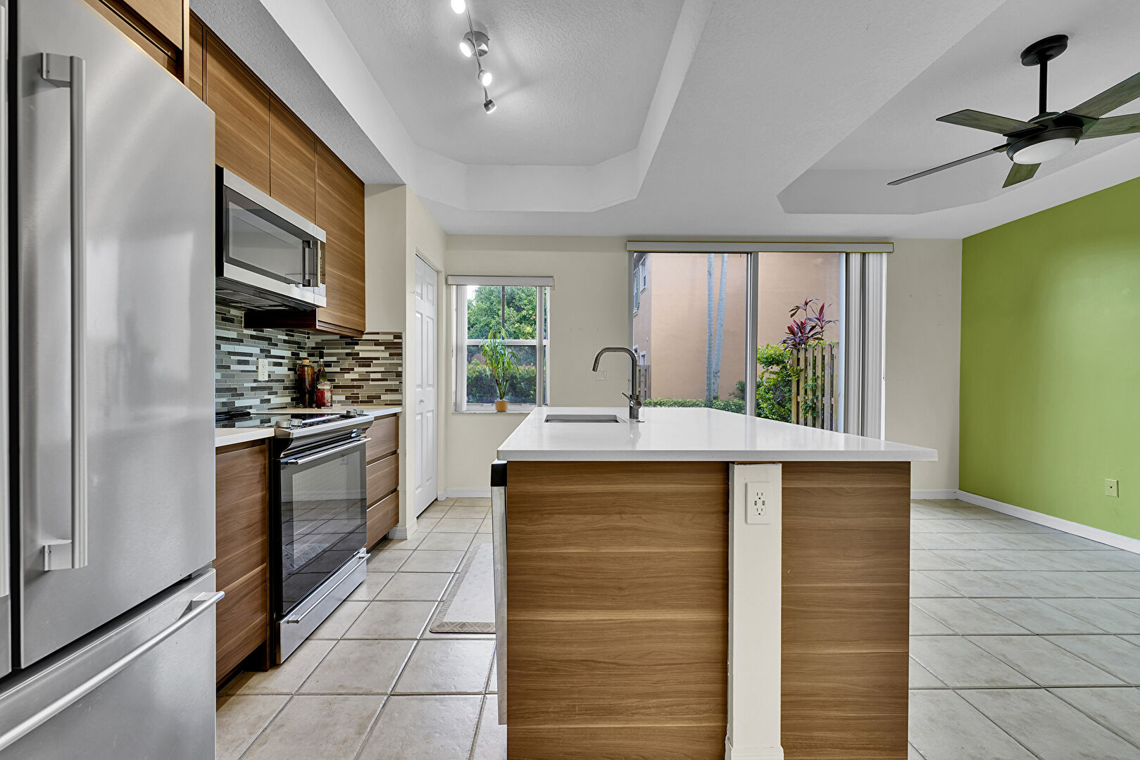 Arched Walkways, Baseboards Wall, Ceiling Fan, Drywall, Flat Panel Cabinets, Floor Ceiling Windows, Kitchen Island, Laundry, Medium Brown Cabinets, Natural Light, One Wall Kitchen, Opens To Living Area, Stone Countertops, Tile Floor, Track Lighting, Tray Ceiling, Vent, Washer Dryer, Drywall, Medium Brown Cabinets, Natural Light, Stone Countertops