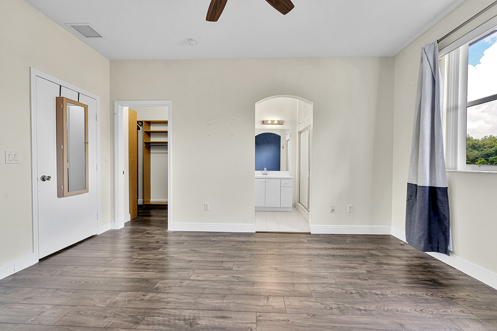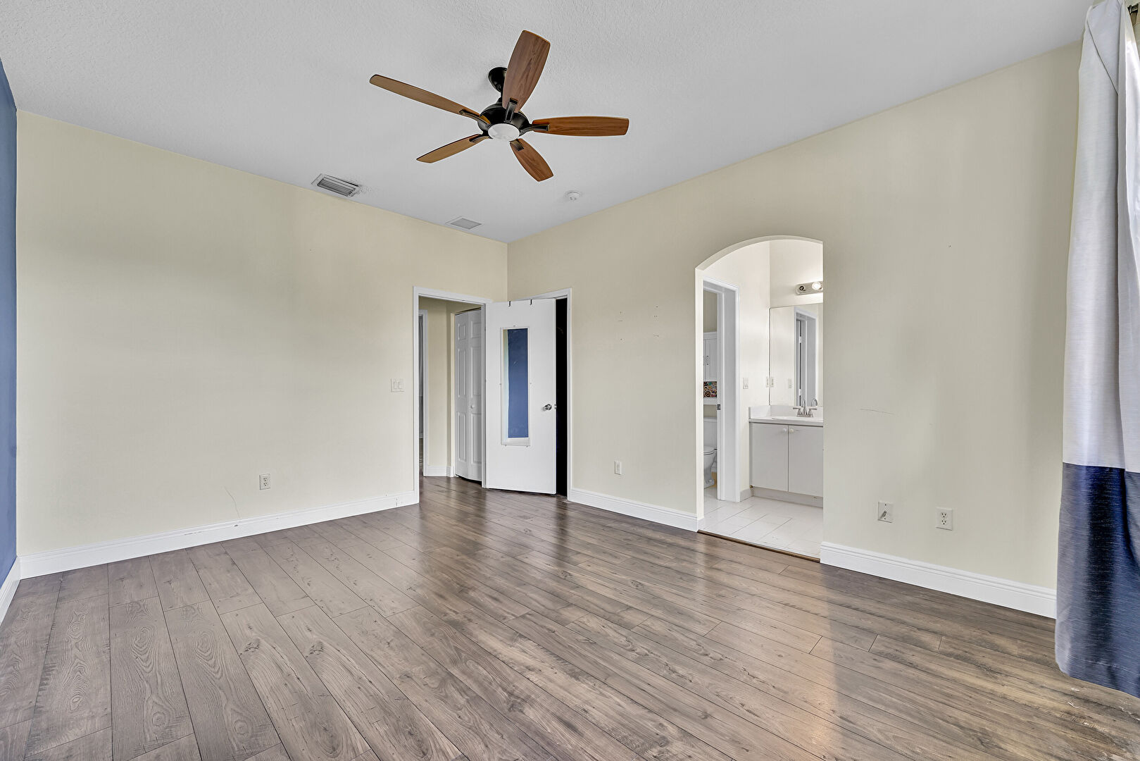 Arched Walkways, Baseboards Wall, Ceiling Fan, Closet, Drywall, Ensuite Bathroom, Natural Light, Textured Ceiling, Vent, Walk In Closet, Wood Finish Floor, Baseboards Wall, Ceiling Fan, Drywall, Wood Finish Floor