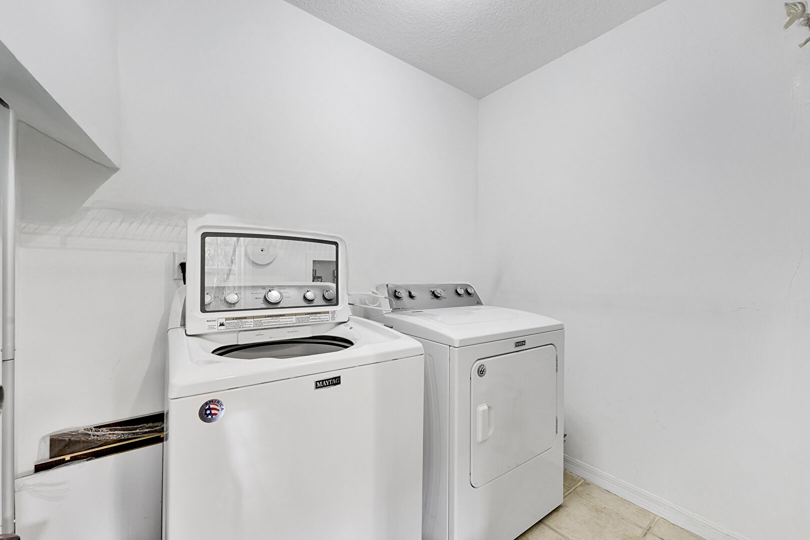 Drywall, Laundry, Textured Ceiling, Tile Floor, Washer Hookup, Baseboards Wall