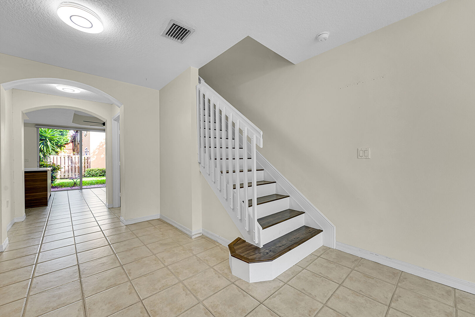 Arched Walkways, Drywall, Natural Light, Smoke Carbon Monoxide Detector, Stairs, Textured Ceiling, Tile Floor, Vent, Baseboards Wall