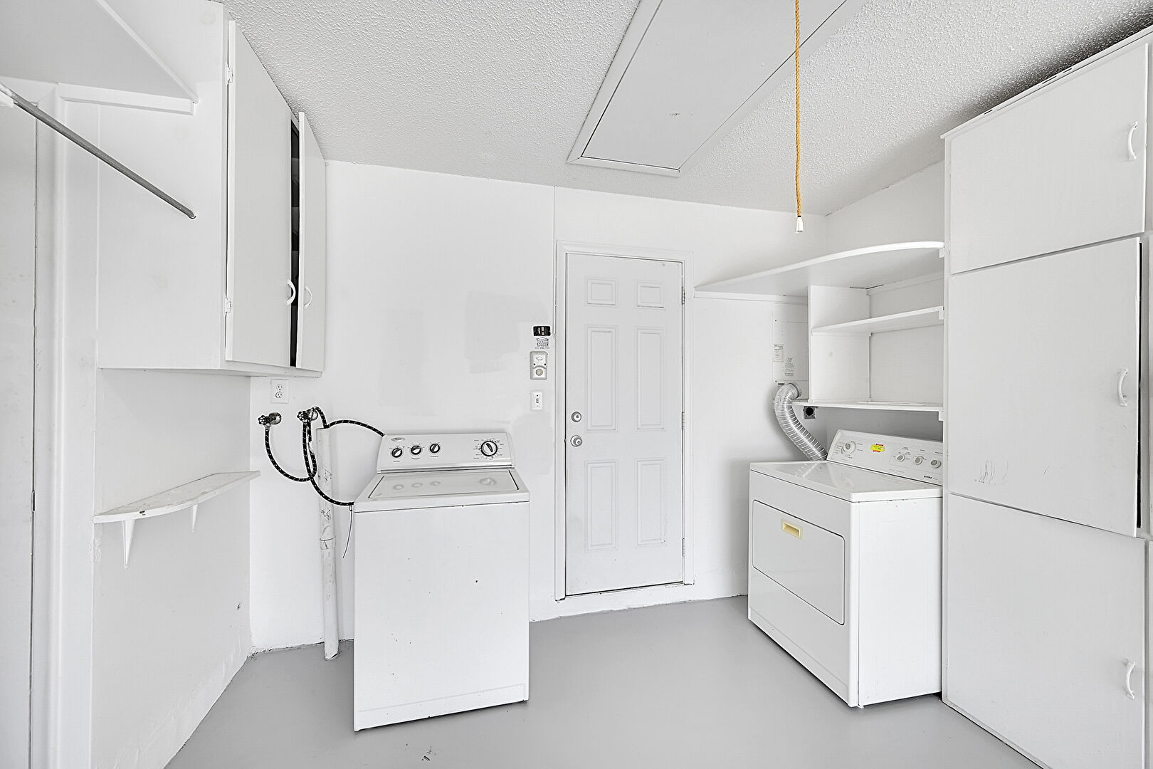 Concrete Floor, Drywall, Laundry, Textured Ceiling, Washer Hookup, Drop Stairs
