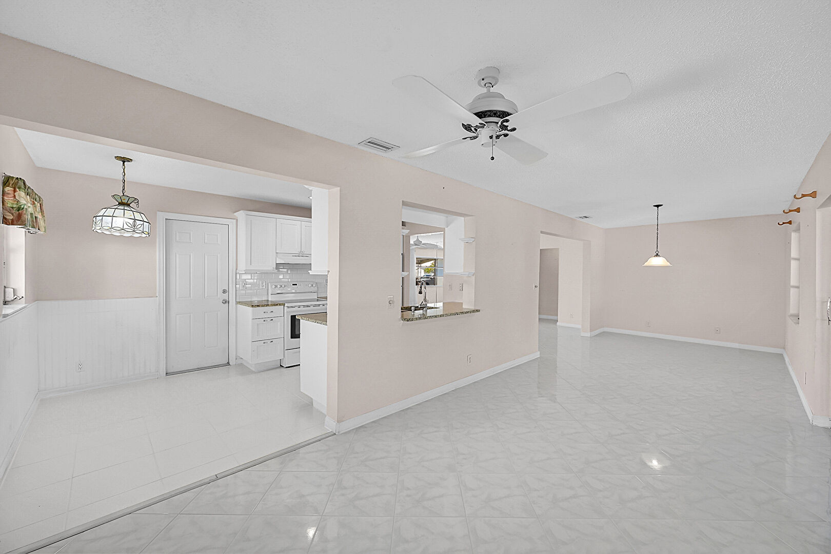 Baseboards Wall, Ceiling Fan, Drywall, Natural Light, Textured Ceiling, Tile Floor, Vent, Wainscot Wall, Ceiling Fan, Textured Ceiling, Vent