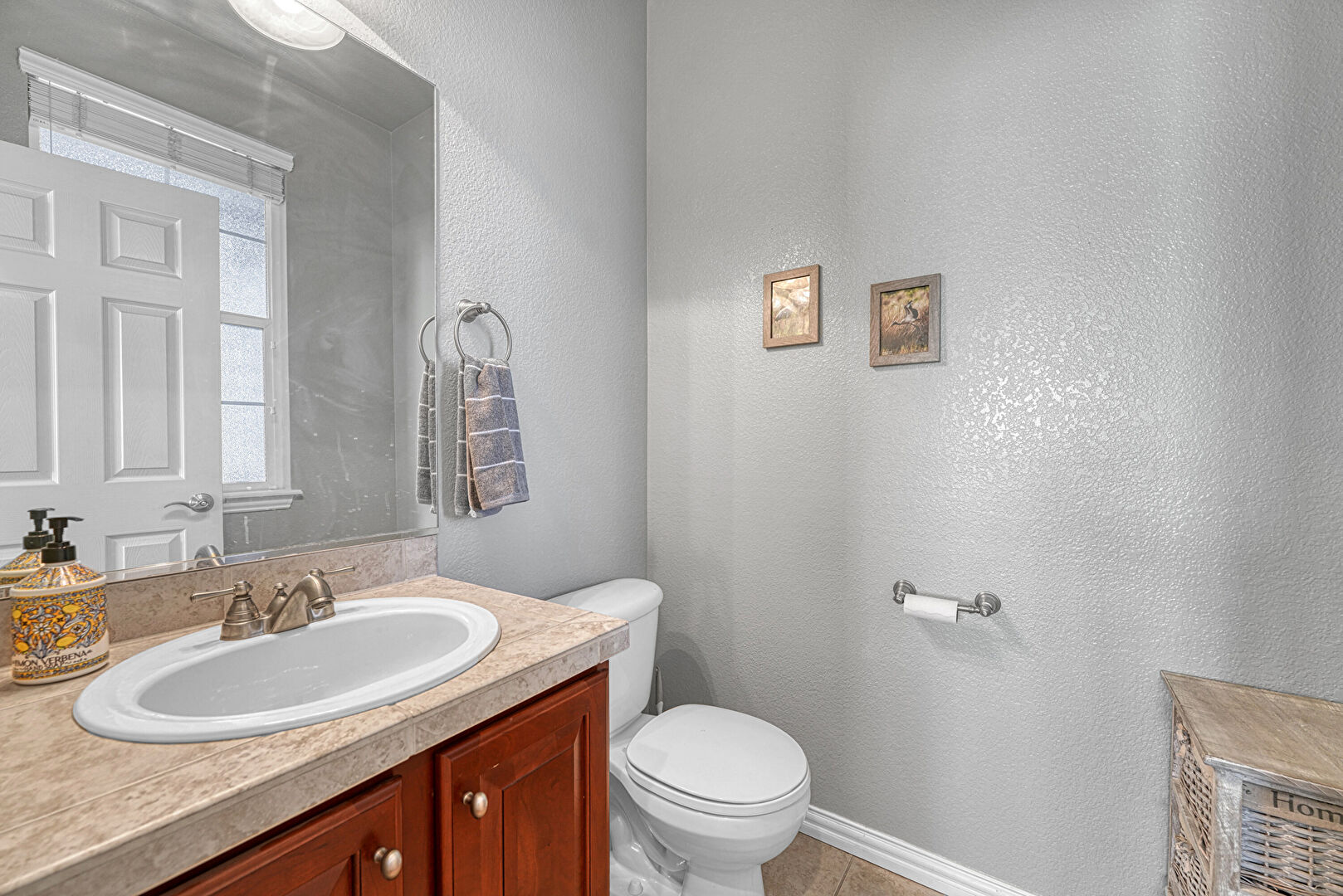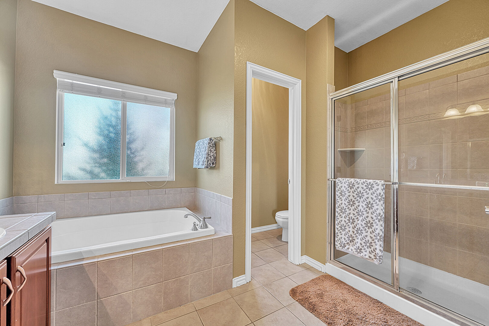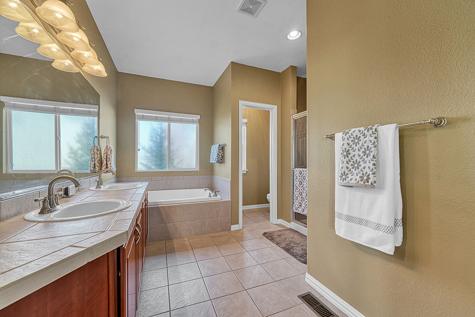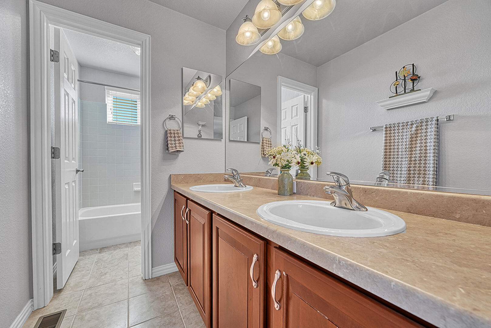 Baseboards Wall, Double Vanity, Drywall, Full Bathroom, Natural Light, Recessed Lighting, Textured Wall, Tile Floor, Vanity, Vent, Water Closet, Full Bathroom, Water Closet
