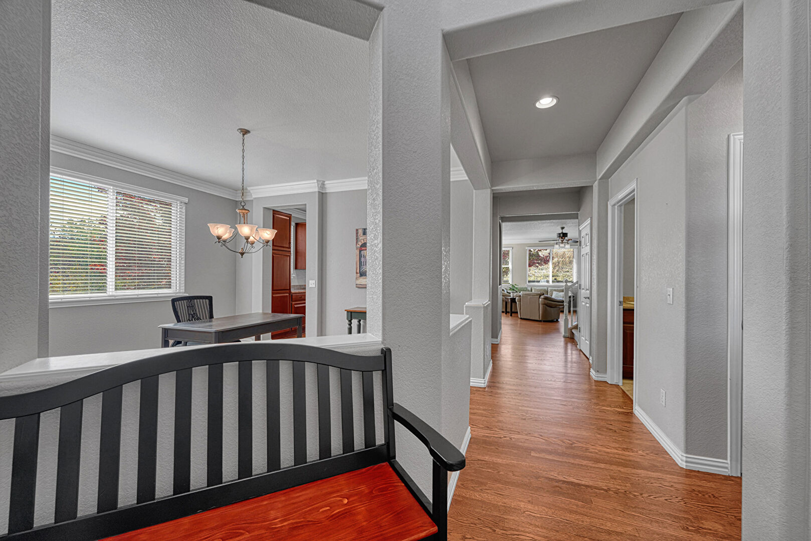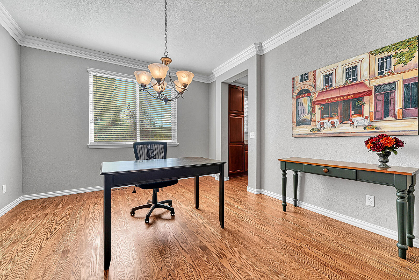 Baseboards Wall, Crown Molding, Drywall, Natural Light, Notable Chandelier, Office Area, Recessed Lighting, Textured Ceiling, Wood Finish Floor, Textured Wall, Vent