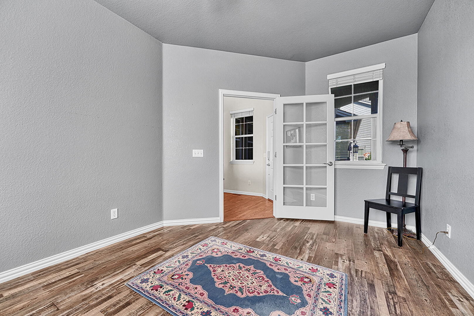 Baseboards Wall, Ceiling Fan, French Doors, Natural Light, Office Area, Textured Ceiling, Textured Wall, Wood Finish Floor, Natural Light, Textured Ceiling