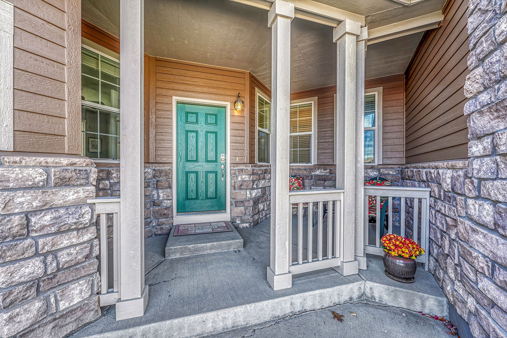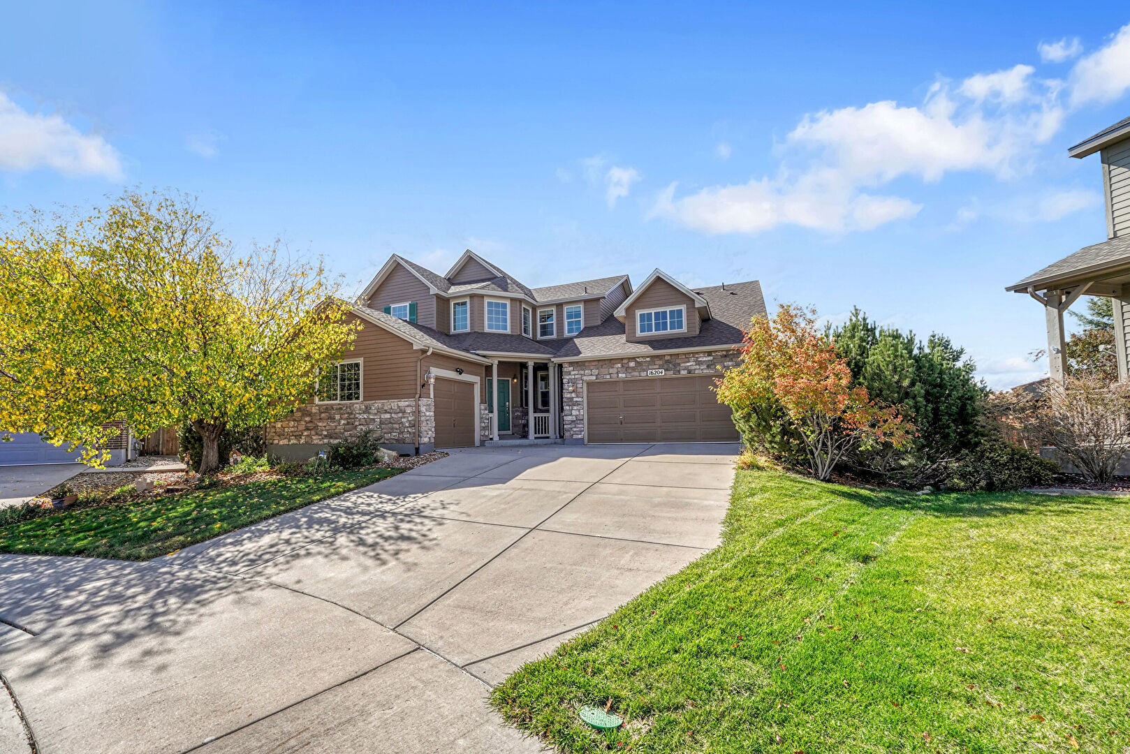 Concrete Foundation, Dormer Roof, Downspout, Driveway, Garage, Gutters, Horizontal Siding, Lawn, Stone Siding, Dormer Roof, Driveway, Stone Siding