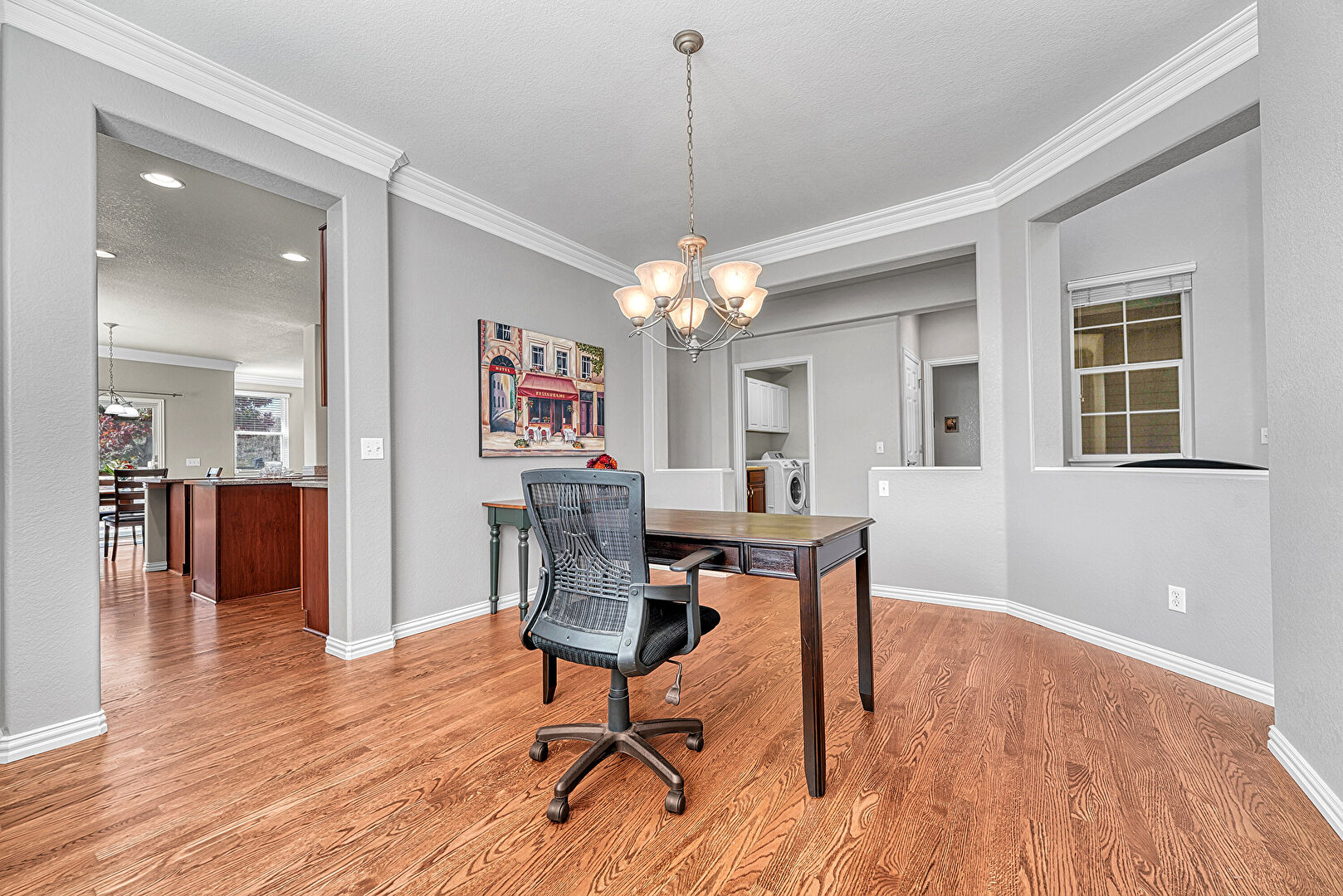 Baseboards Wall, Crown Molding, Drywall, Laundry, Natural Light, Notable Chandelier, Office Area, Textured Ceiling, Textured Wall, Wood Finish Floor, Natural Light, Notable Chandelier