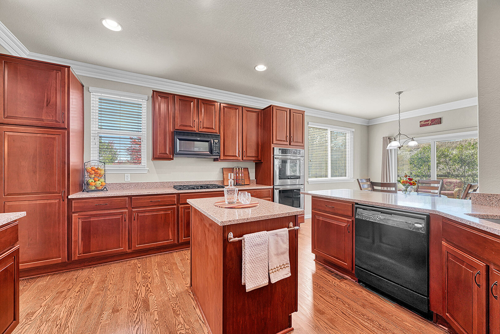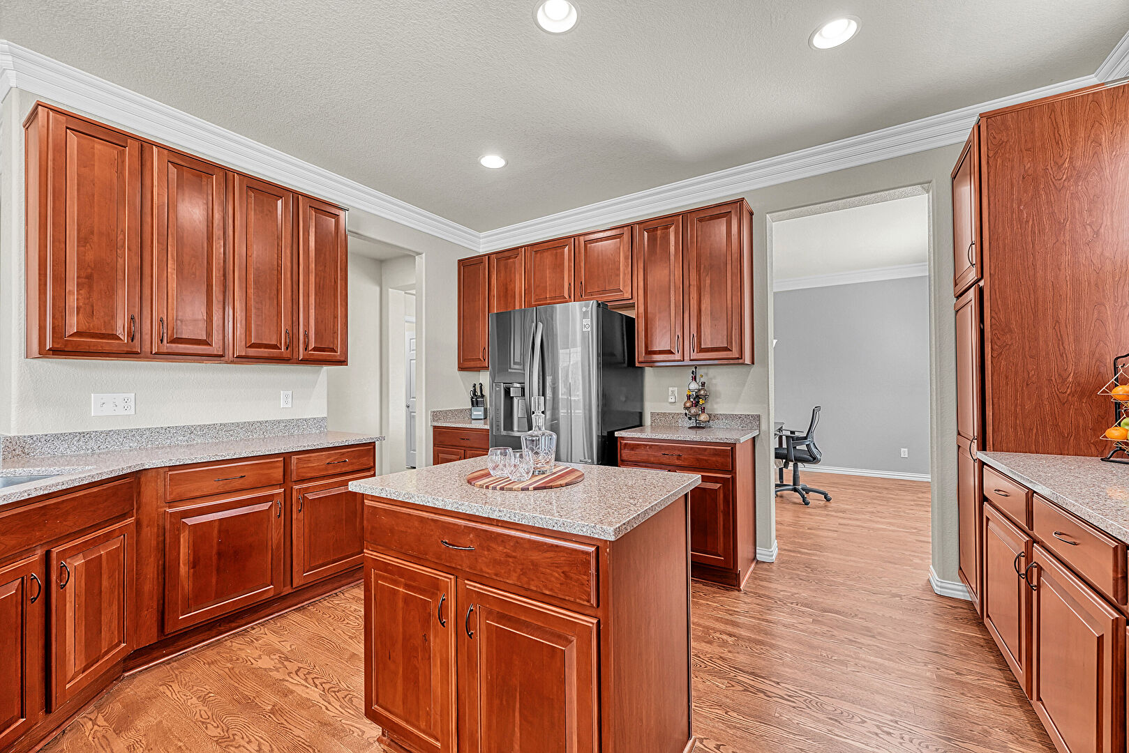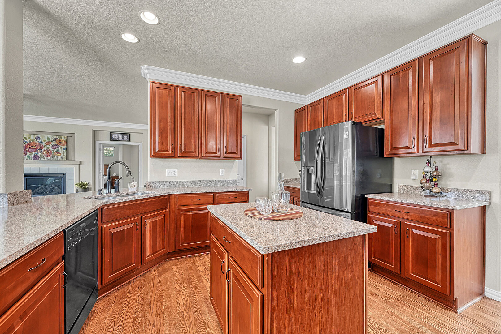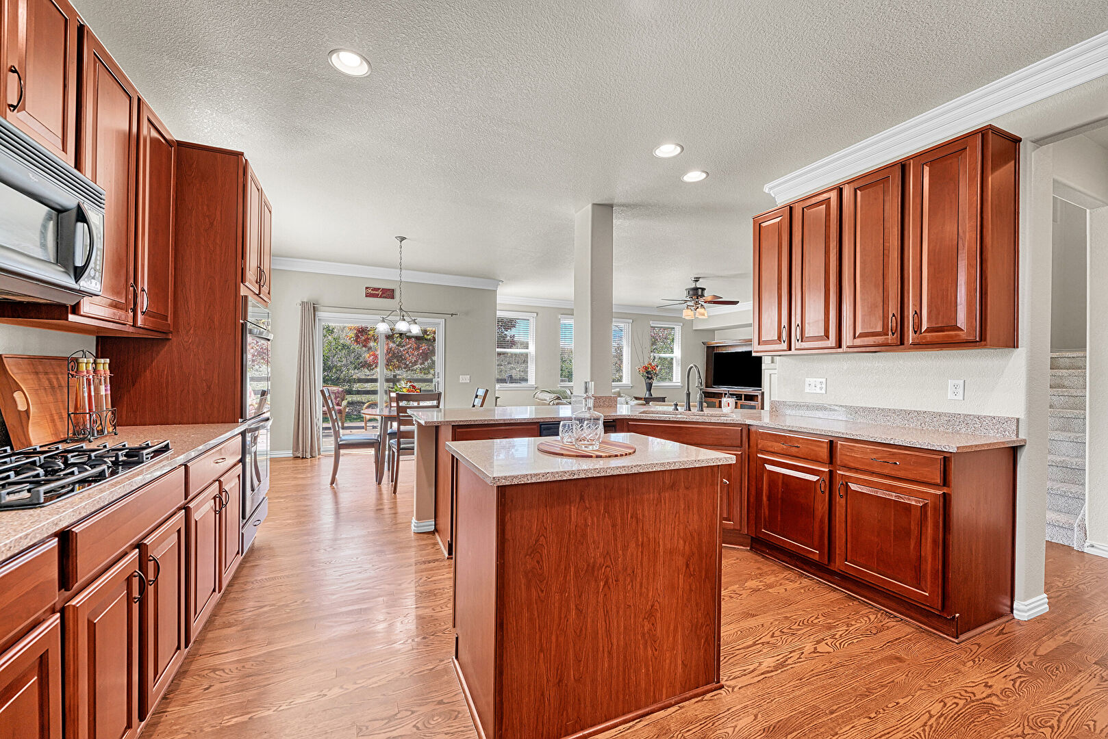 Baseboards Wall, Built In Desk, Ceiling Fan, Crown Molding, Double Oven, Drywall, Fireplace, Kitchen Island, Kitchen Peninsula, Medium Brown Cabinets, Natural Light, Notable Chandelier, Office Area, Pass Through Window, Pendant Lighting, Raised Cabinets, Recessed Lighting, Stone Countertops, Textured Ceiling, Wood Finish Floor, Baseboards Wall, Double Oven, Raised Cabinets, Wood Finish Floor