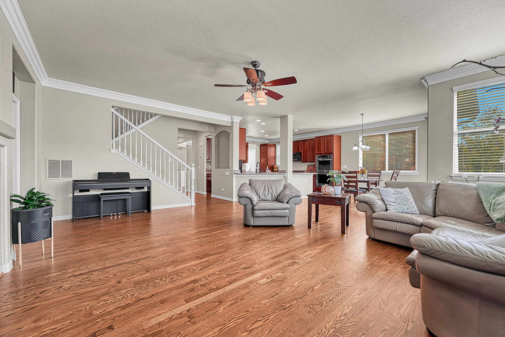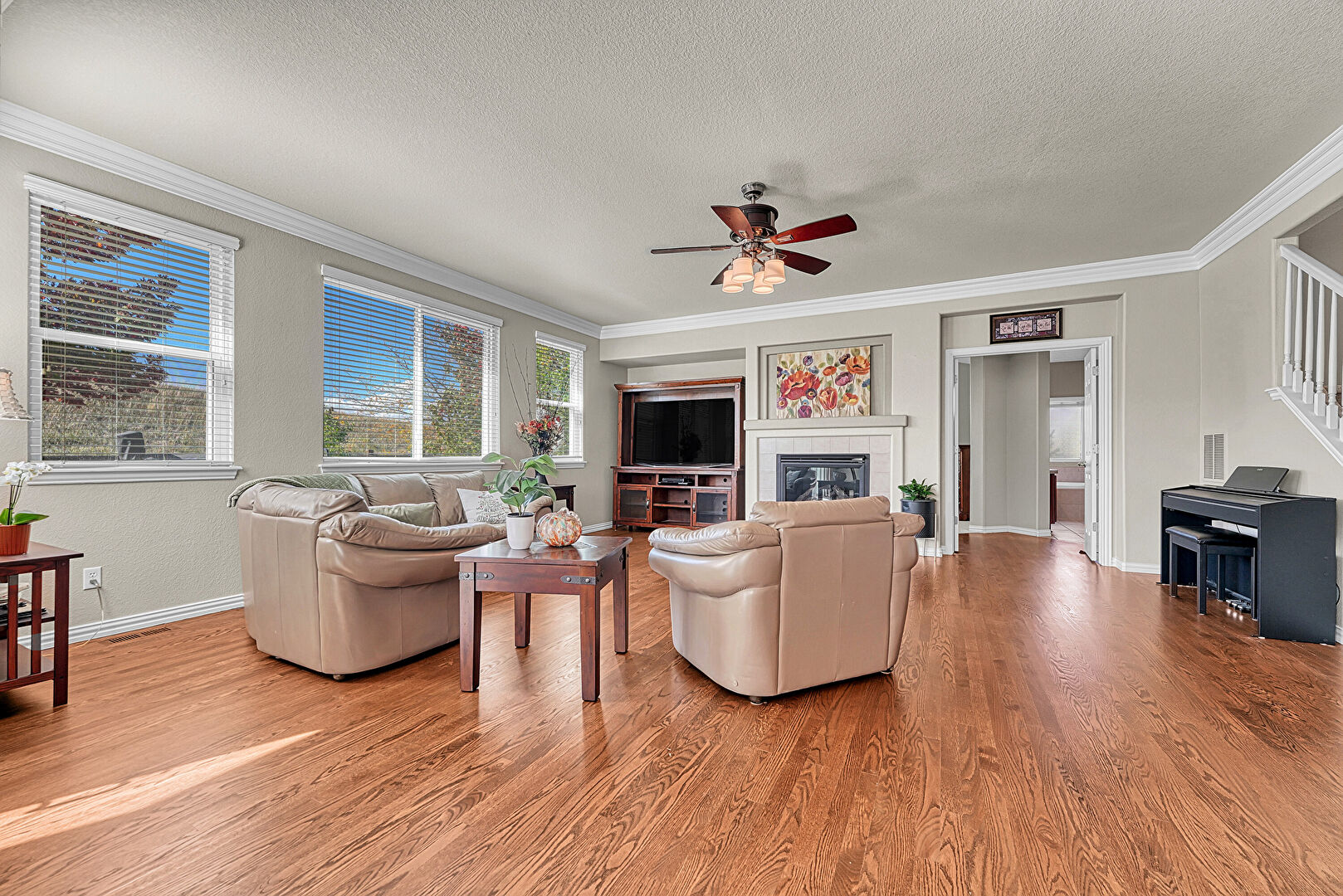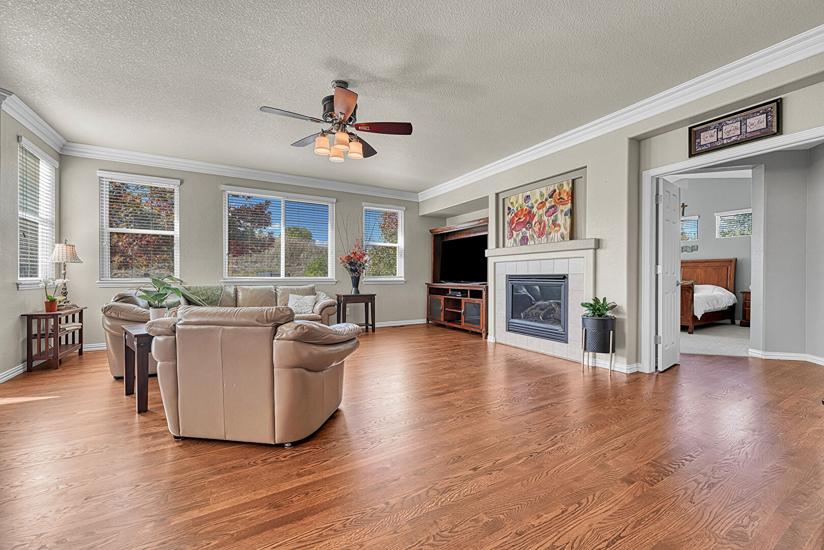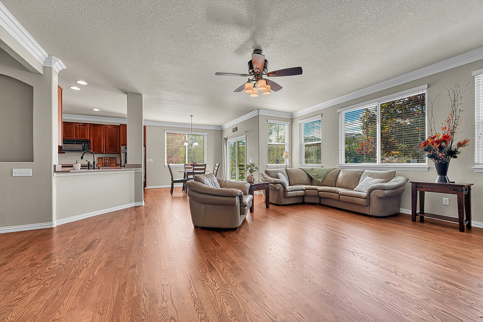 Baseboards Wall, Crown Molding, Double Oven, Drywall, Fireplace, Natural Light, Notable Chandelier, Textured Ceiling, Textured Wall, Wood Finish Floor, Ceiling Fan, Textured Ceiling