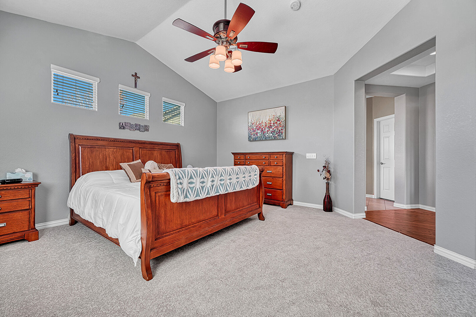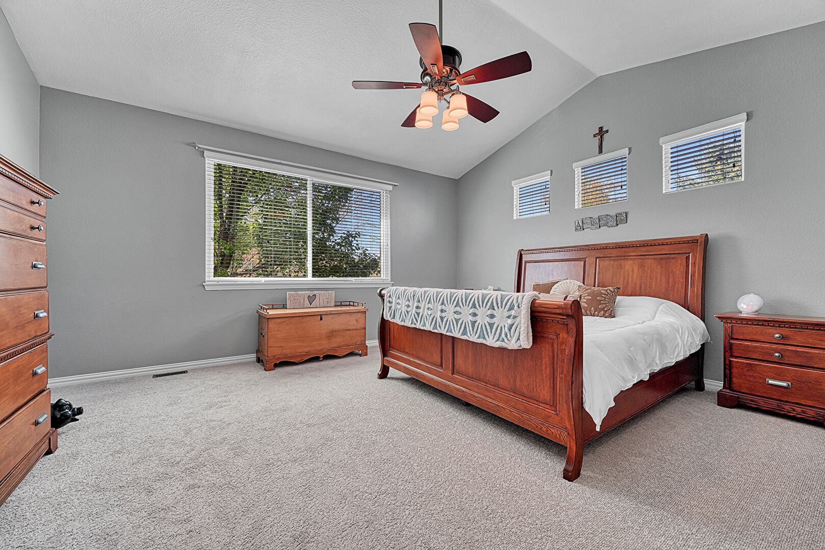 Baseboards Wall, Carpet, Cathedral Ceiling, Ceiling Fan, Drywall, Natural Light, Vaulted Ceiling, Vent, Baseboards Wall, Carpet