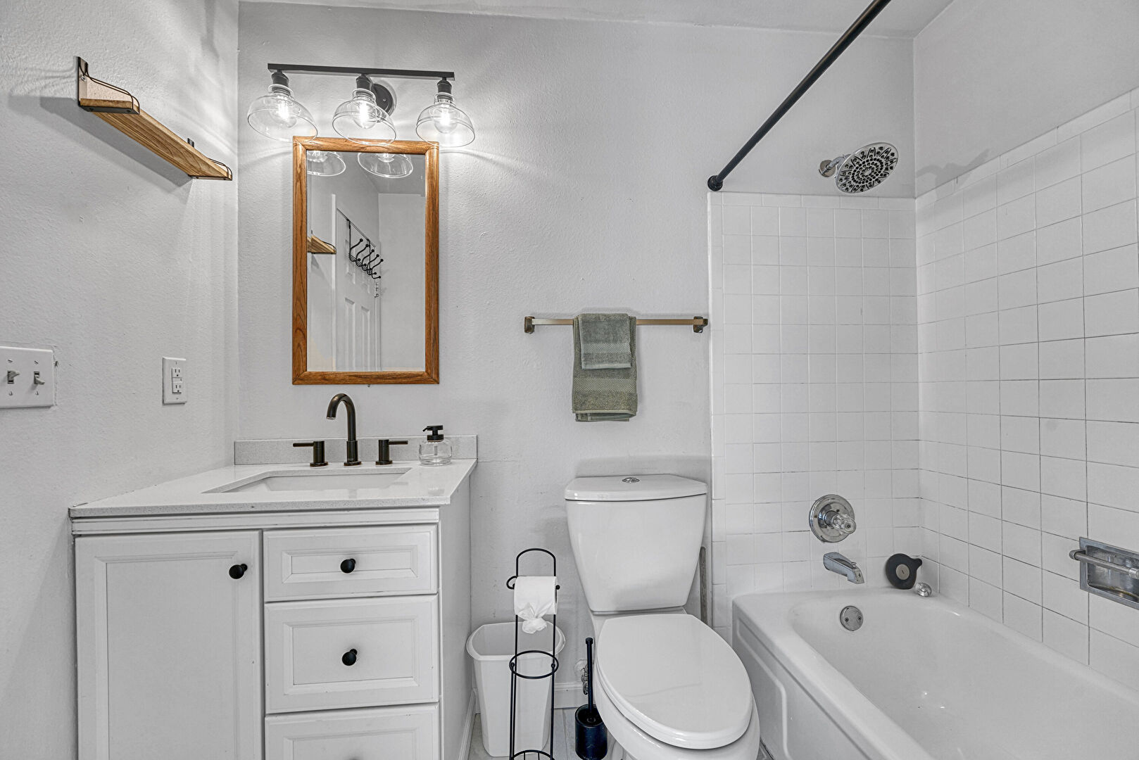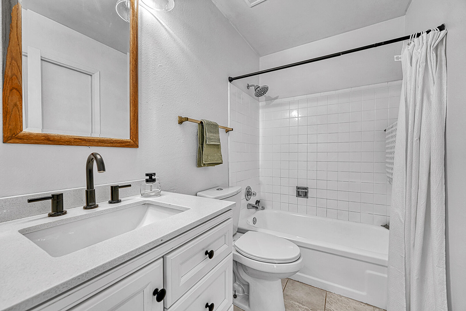 Combined Bath Shower, Full Bathroom, Textured Wall, Tile Floor, Vanity, Full Bathroom, Vanity