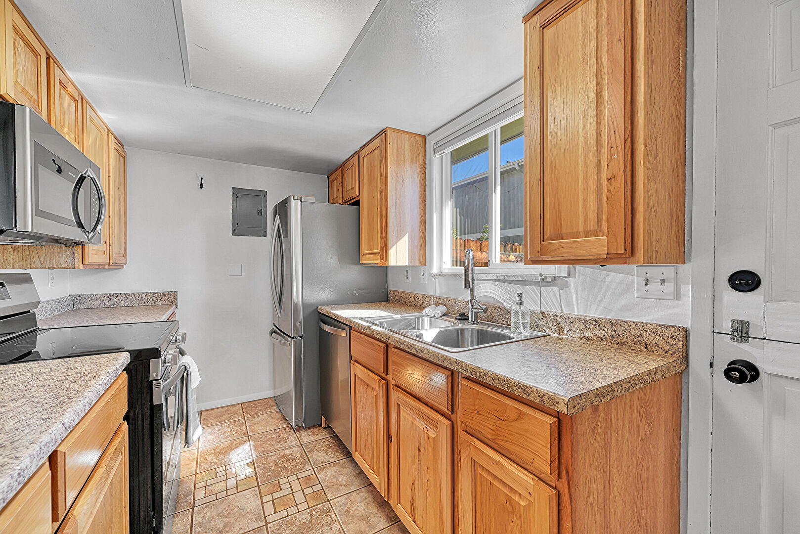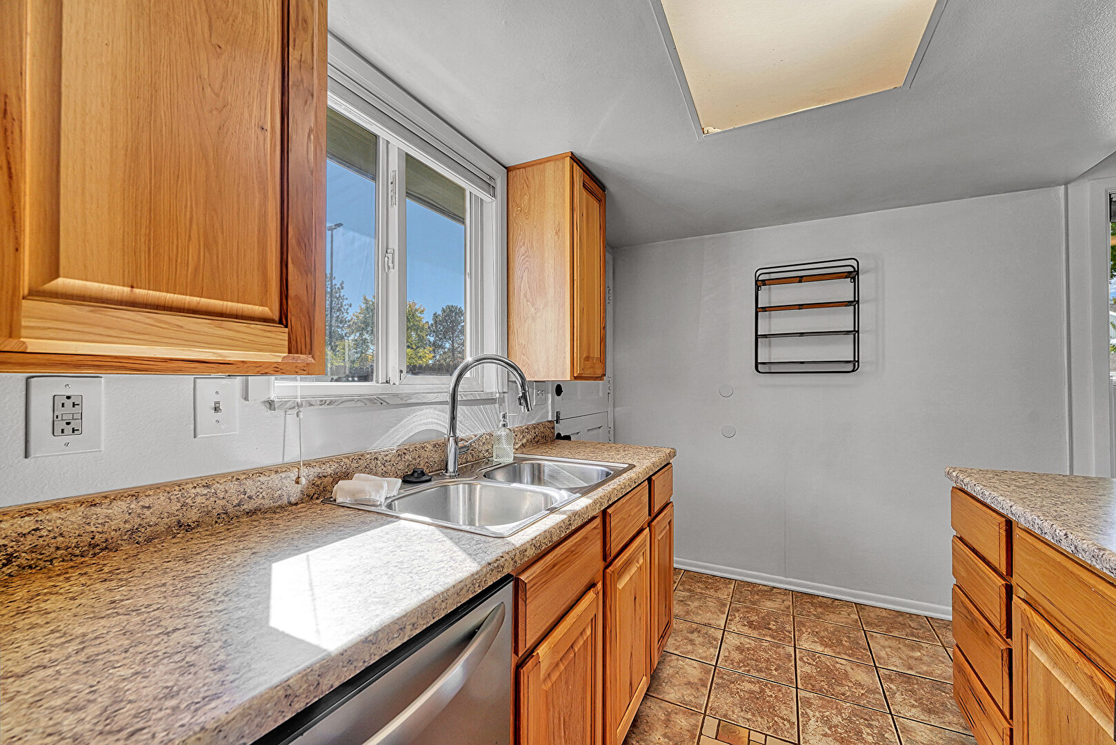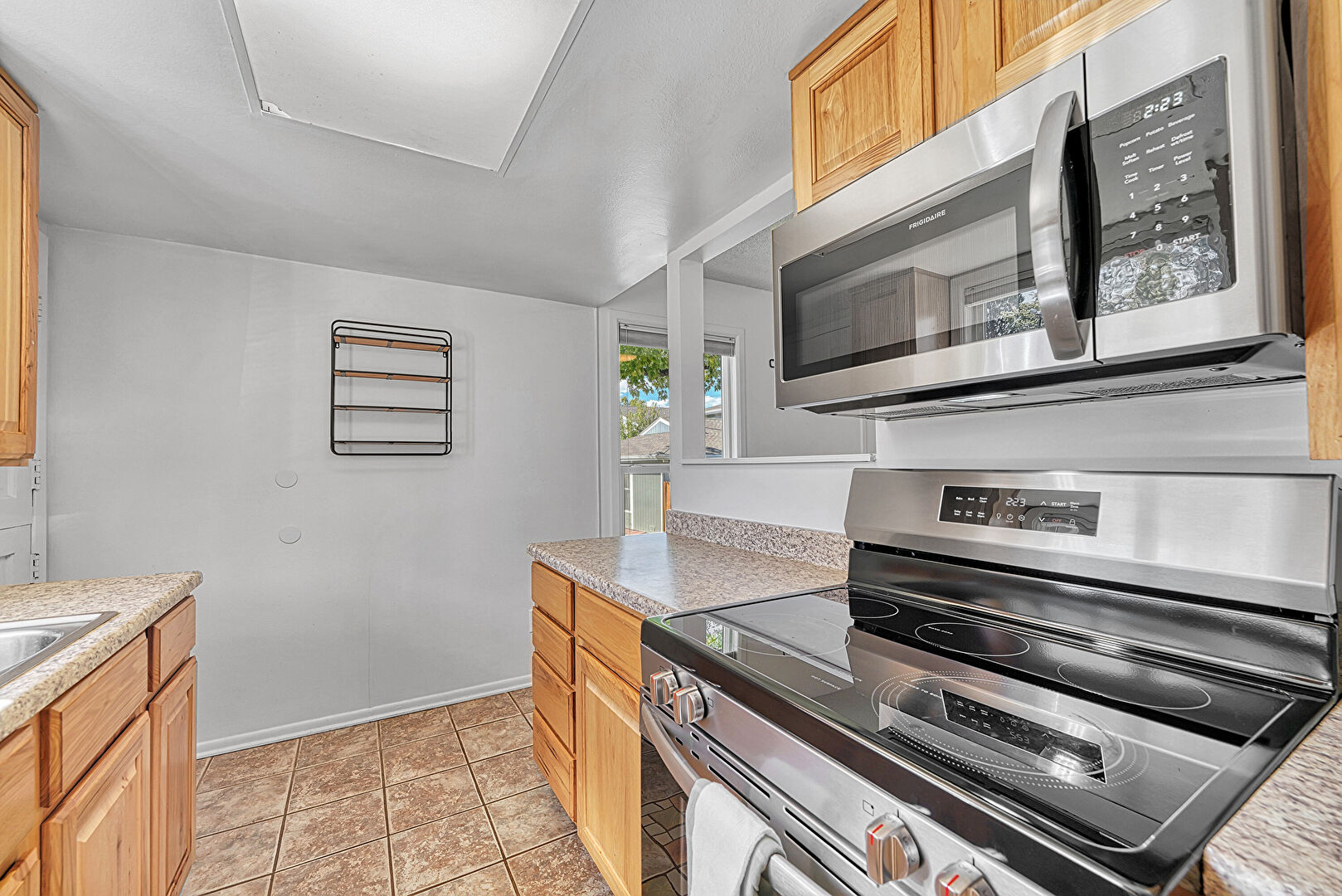 Baseboards Wall, Drywall, Electric Panel, Medium Brown Cabinets, Natural Light, Opens To Living Area, Pass Through Window, Raised Cabinets, Stone Countertops, Tile Floor, Vent, Drywall, Medium Brown Cabinets, Textured Ceiling
