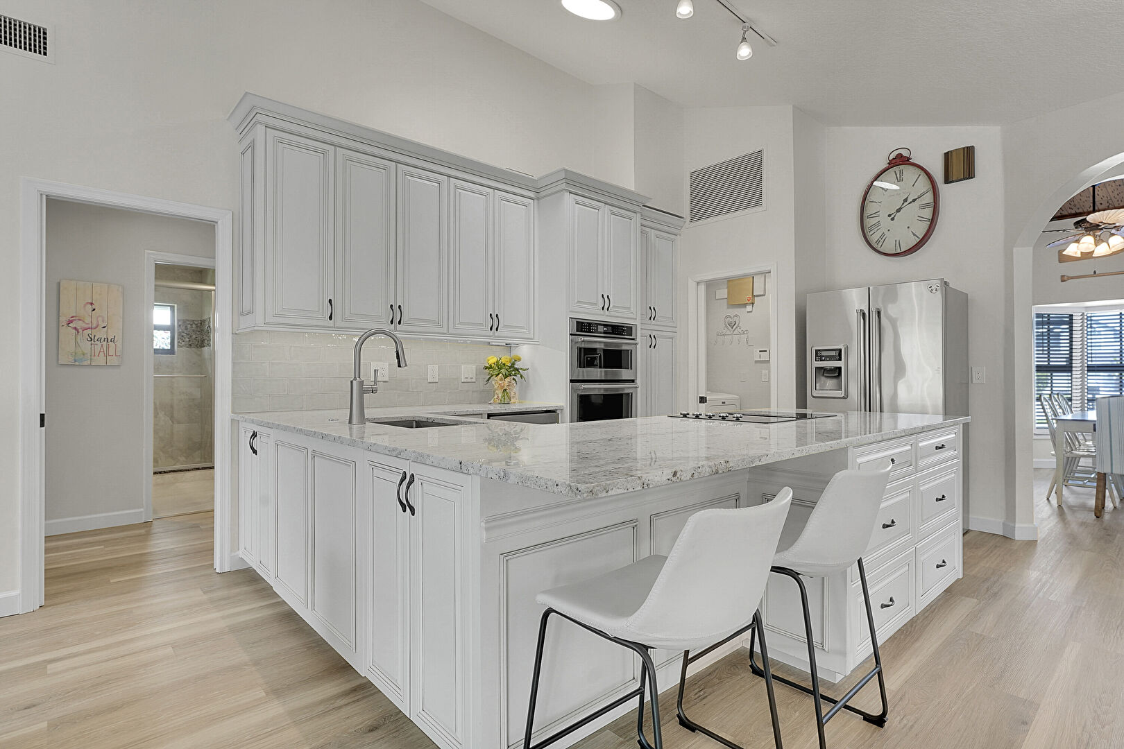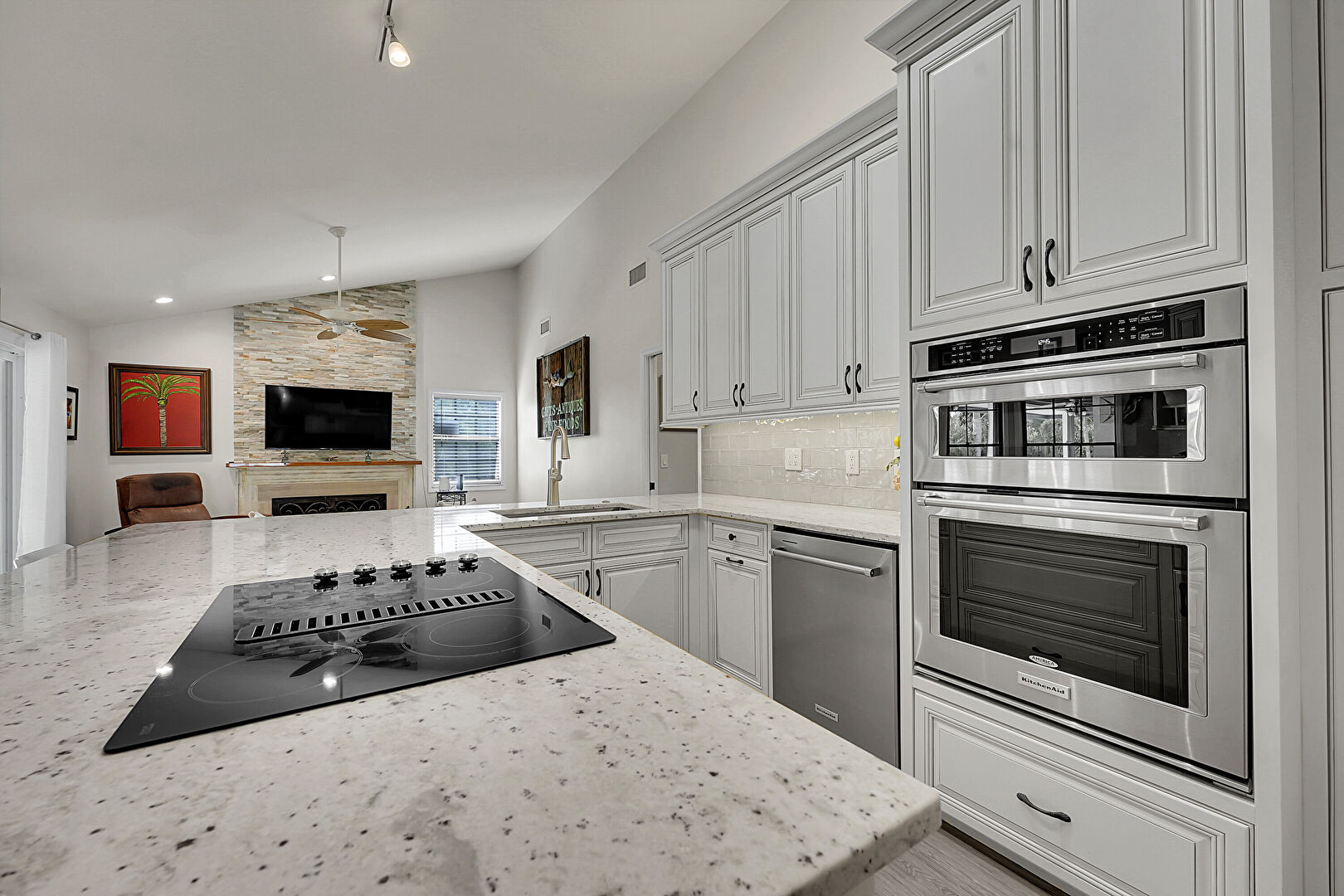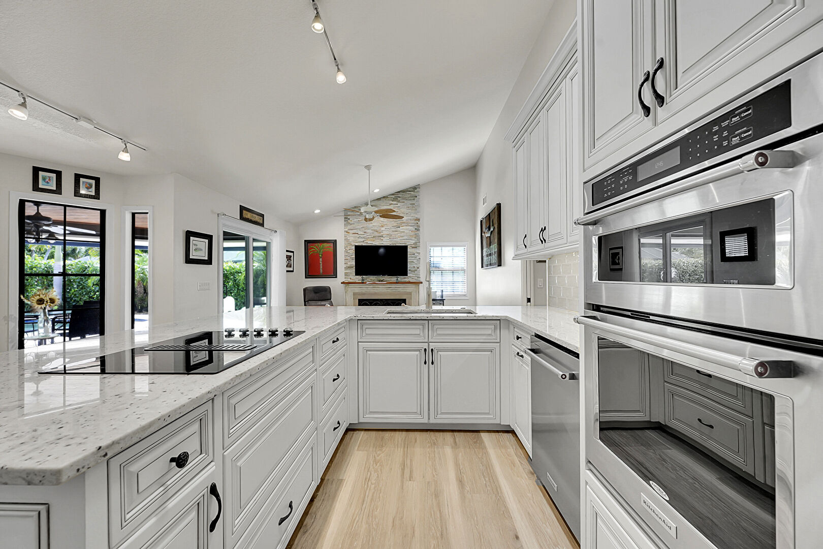 Arched Walkways, Baseboards Wall, Ceiling Fan, Crown Molding Cabinets, Double Oven, Drywall, Fireplace, G Shaped Kitchen, High Ceiling, Kitchen Bar, Kitchen Peninsula, Natural Light, Opens To Living Area, Raised Cabinets, Recessed Lighting, Stone Countertops, Textured Ceiling, Track Lighting, Vaulted Ceiling, Vent, Wood Finish Floor, Natural Light, Vaulted Ceiling, Vent