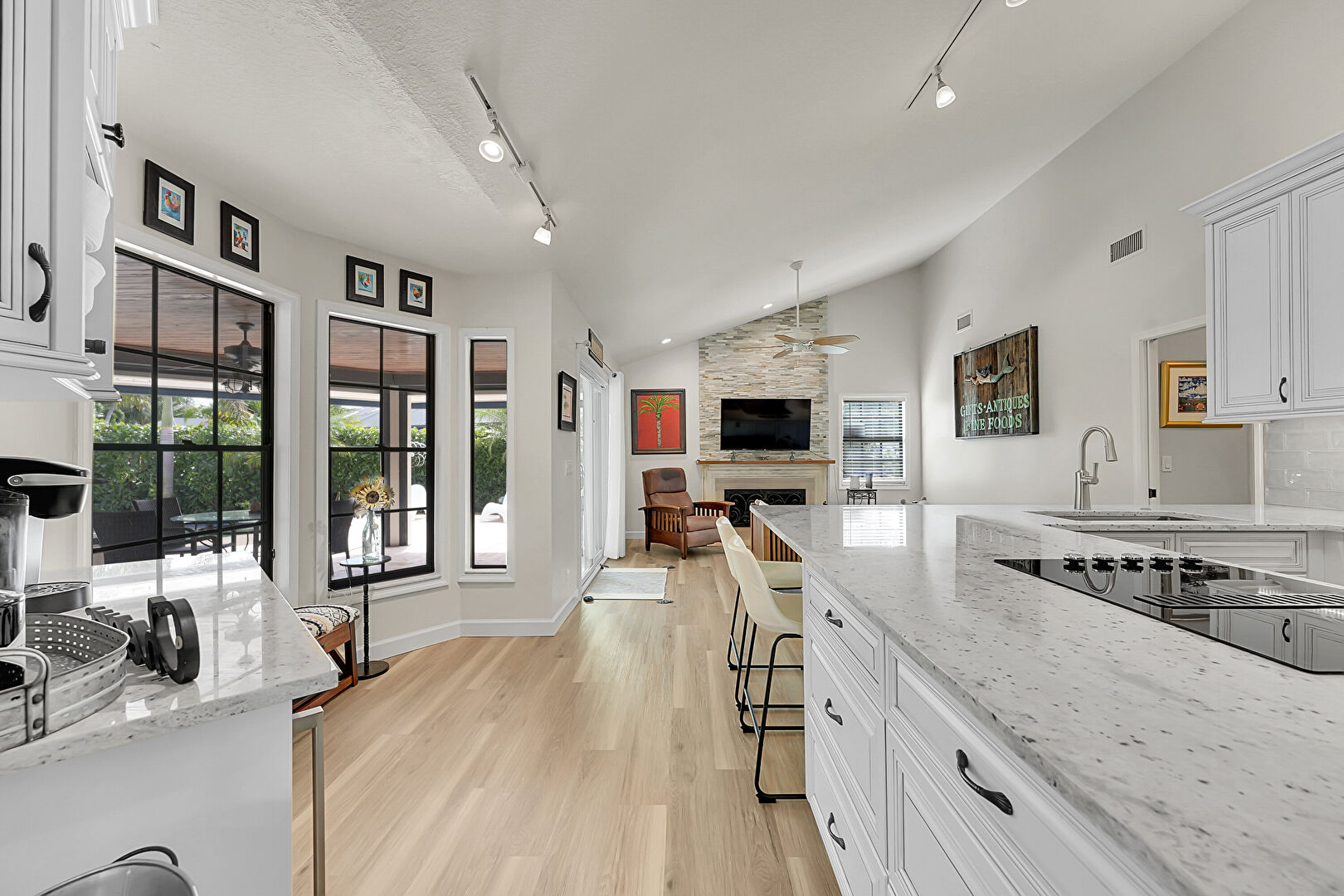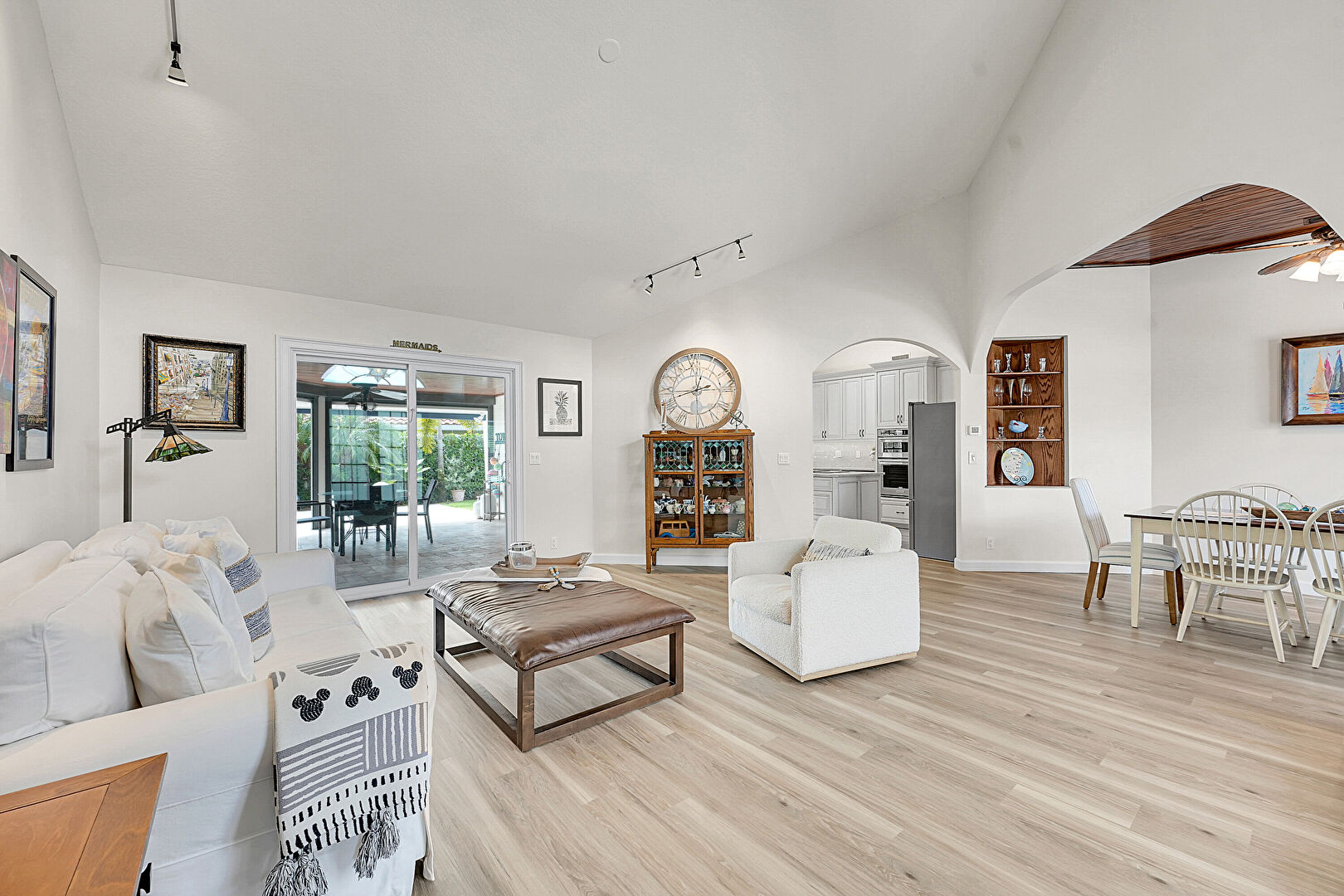 Arched Walkways, Baseboards Wall, Ceiling Fan, Drywall, Fireplace, Natural Light, Recessed Lighting, Track Lighting, Vaulted Ceiling, Vent, Wood Finish Floor, High Ceiling, Wine Cooler