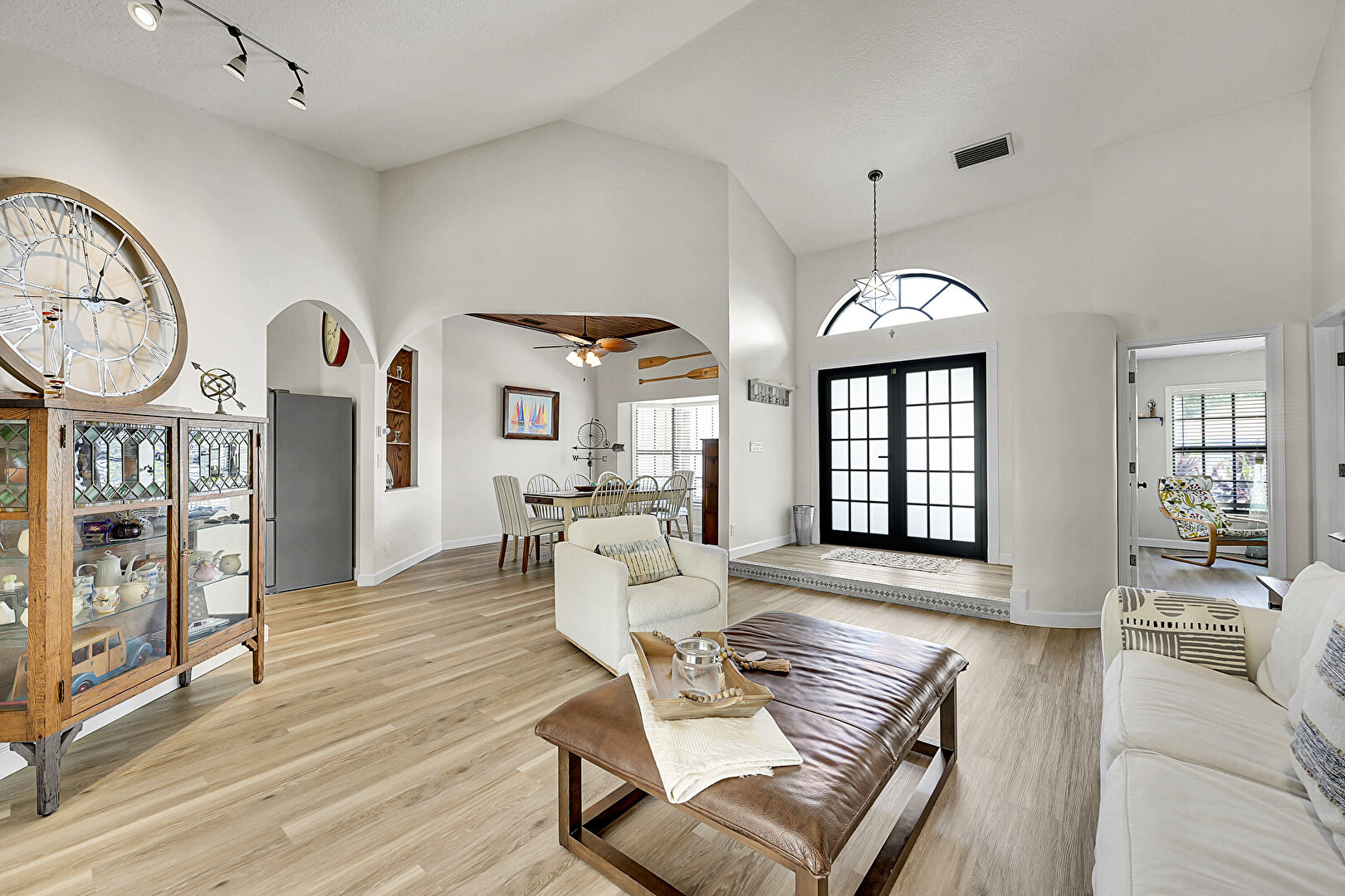 Arched Walkways, Baseboards Wall, Ceiling Fan, Double Oven, Drywall, French Doors, High Ceiling, Natural Light, Track Lighting, Vaulted Ceiling, Vent, Wood Finish Floor, Arched Walkways, High Ceiling