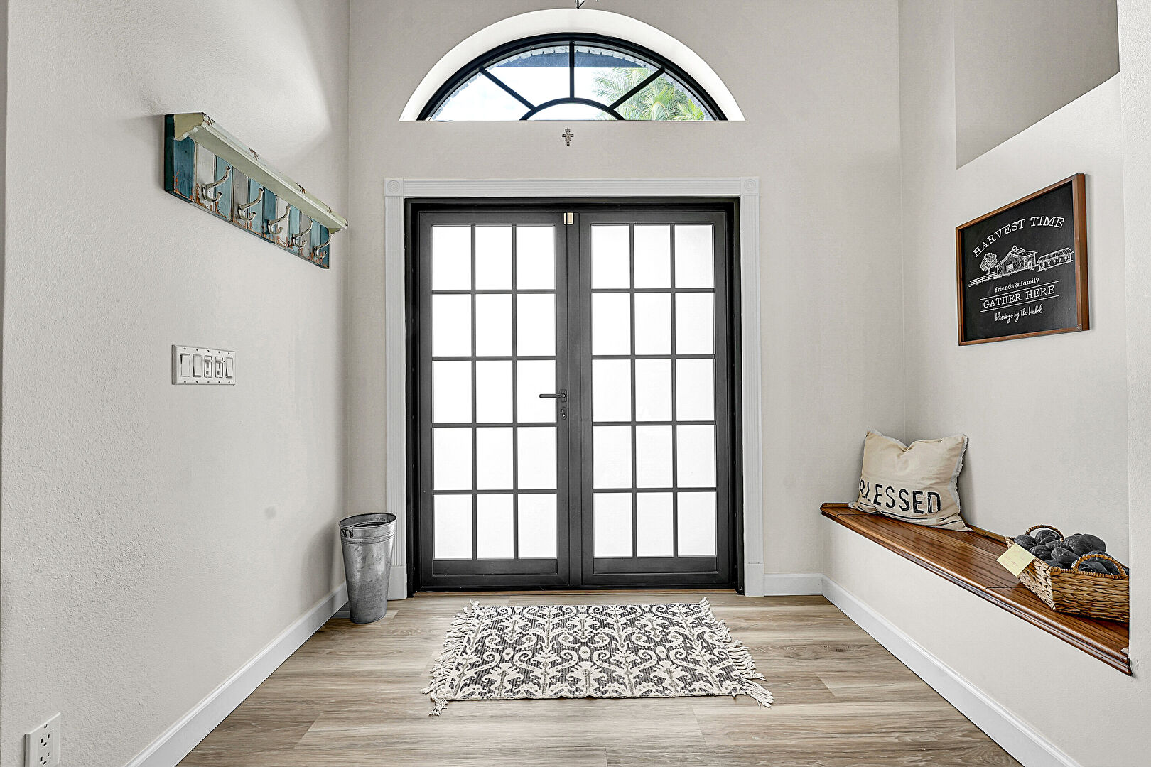 Baseboards Wall, French Doors, High Ceiling, Wood Finish Floor, Natural Light