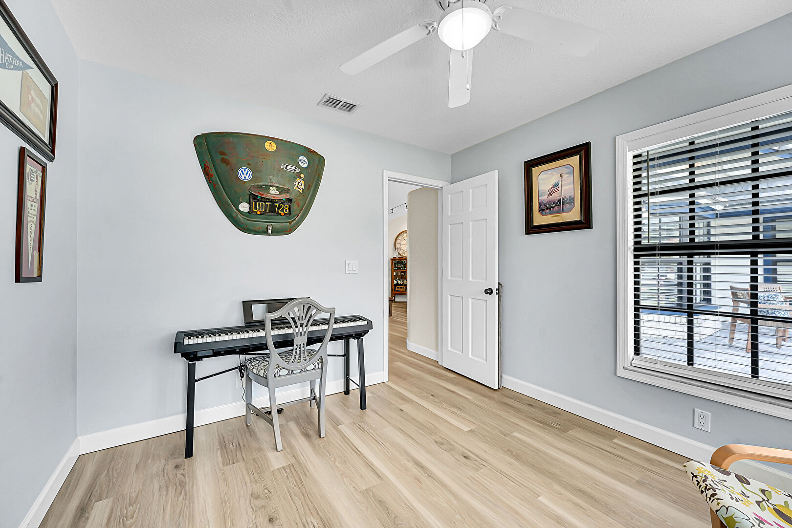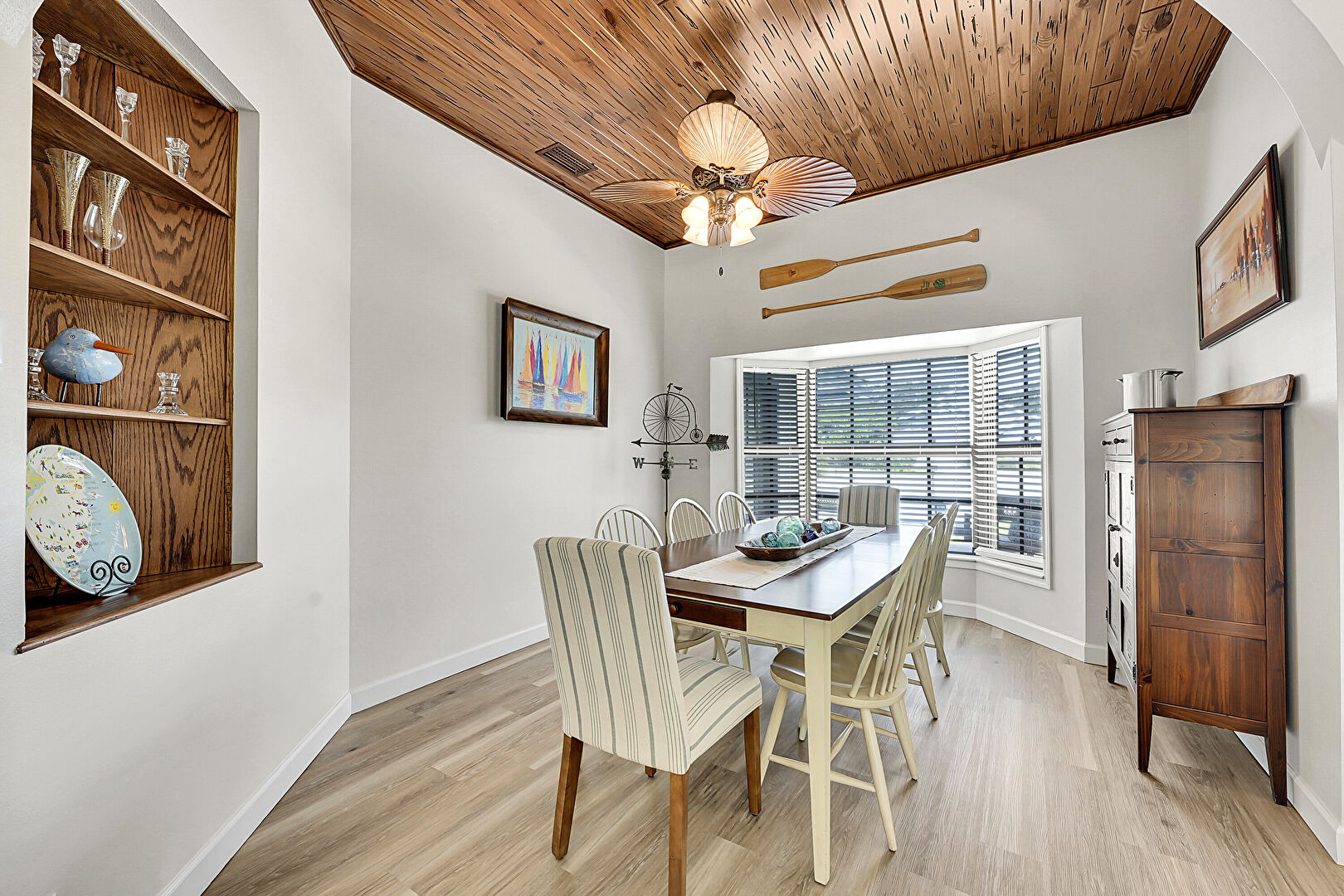 Baseboards Wall, Ceiling Fan, Crown Molding, Drywall, Natural Light, Wood Ceiling, Wood Finish Floor, Vent