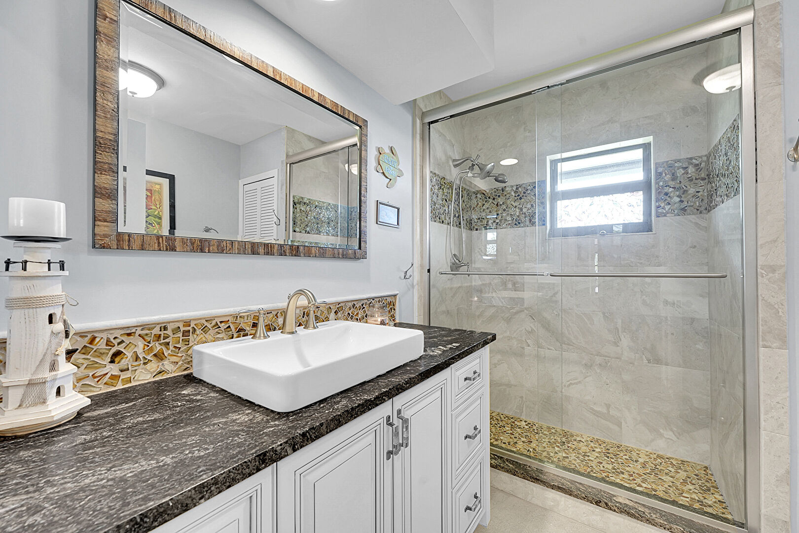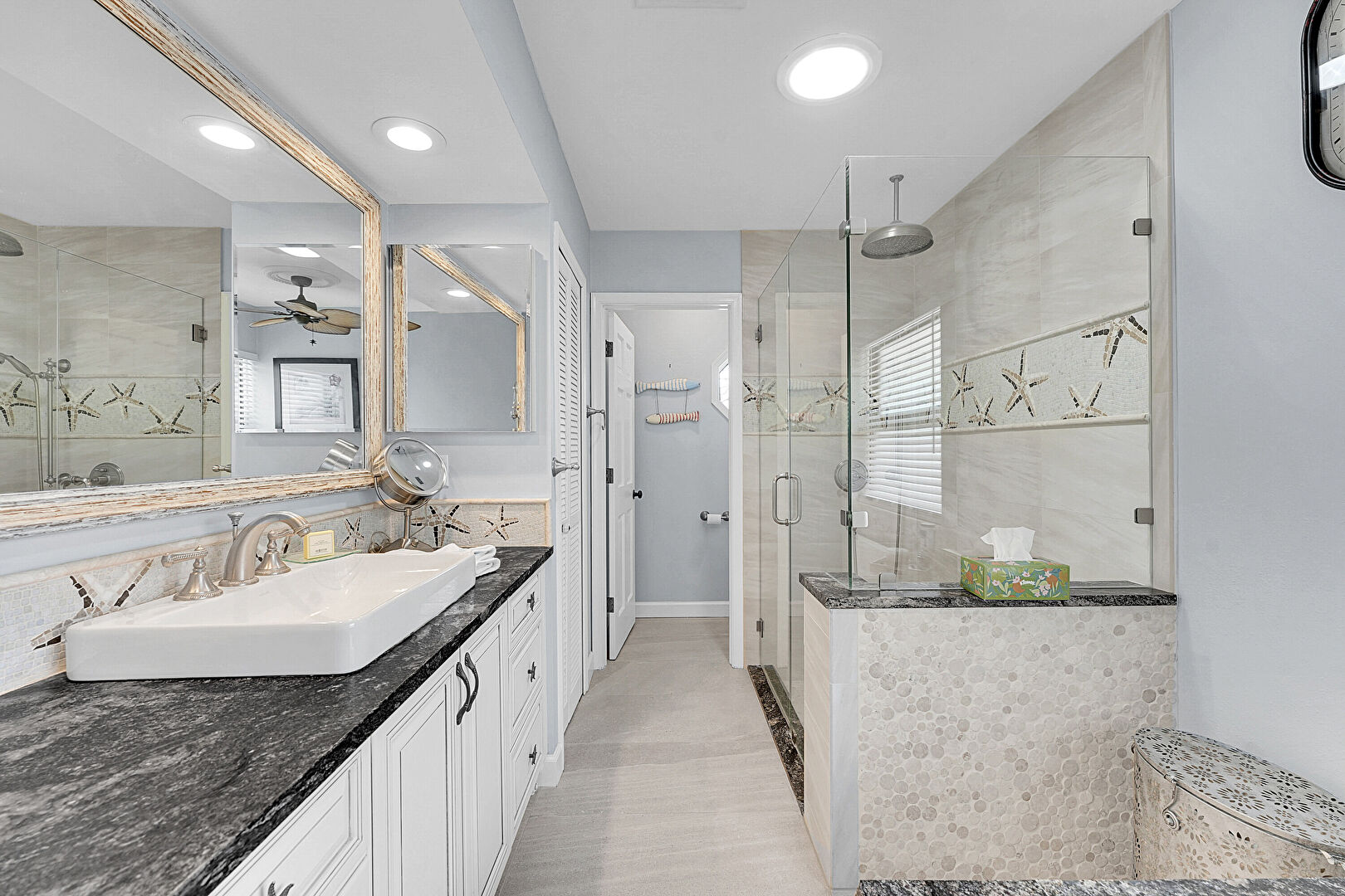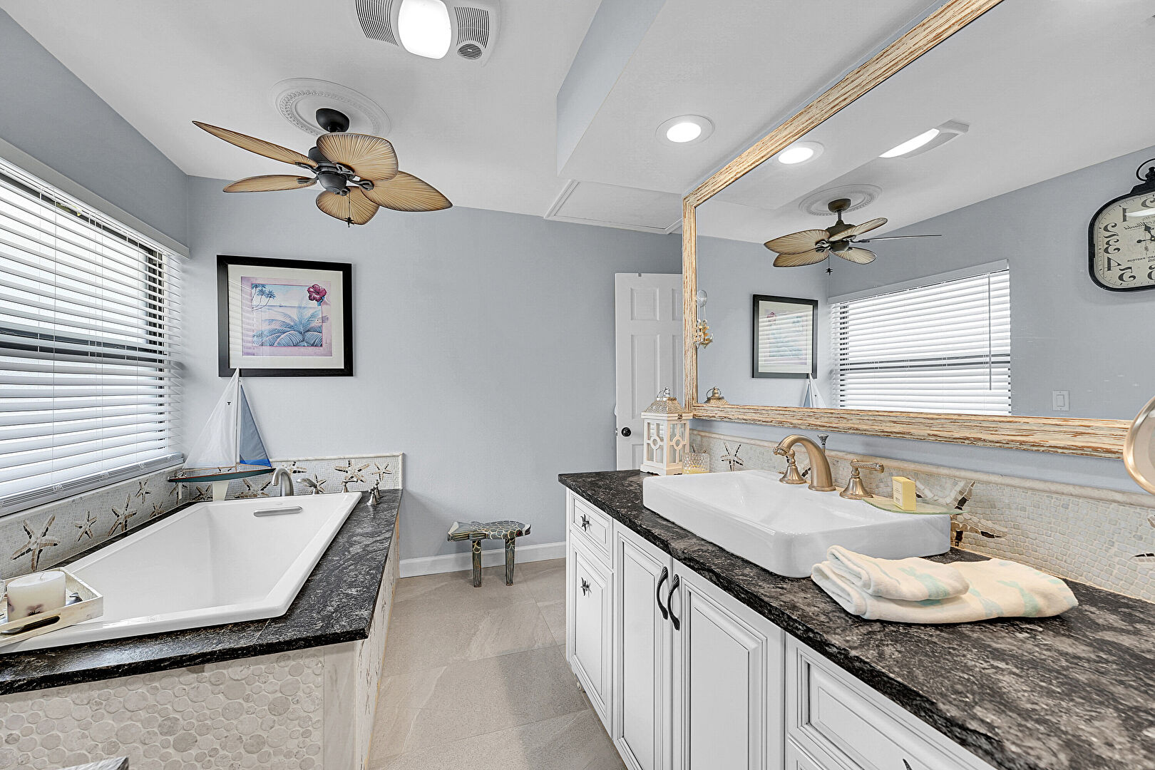 Baseboards Wall, Ceiling Fan, Drywall, Full Bathroom, Natural Light, Recessed Lighting, Tile Floor, Vanity, Vent, Natural Light, Tile Floor, Vanity