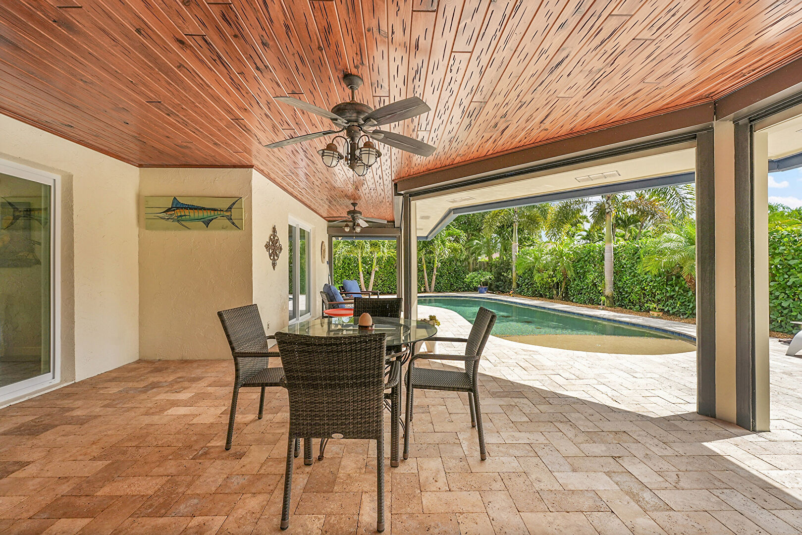 Ceiling Fan, Fence, Outdoor Dining Area, Outdoor Living Space, Patio, Pool, Water Slide, Ceiling Fan, Fence, Outdoor Dining Area, Patio