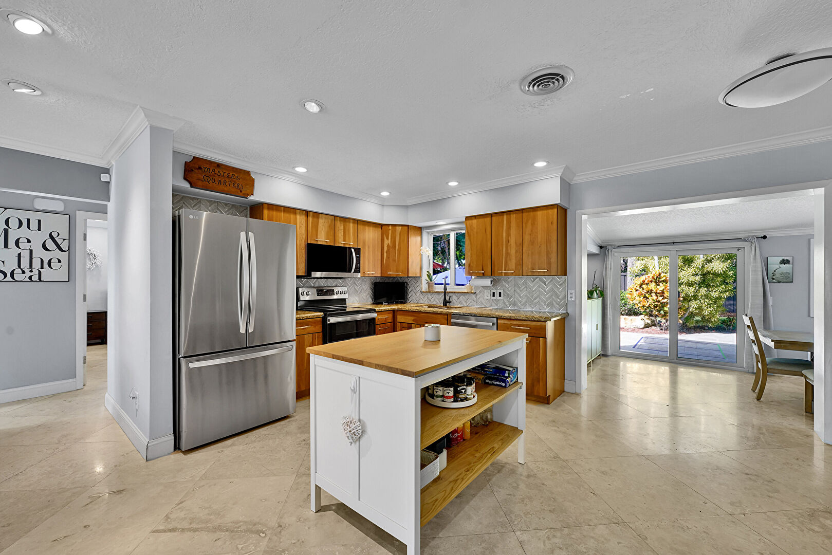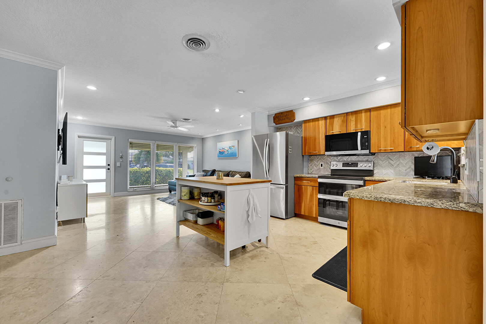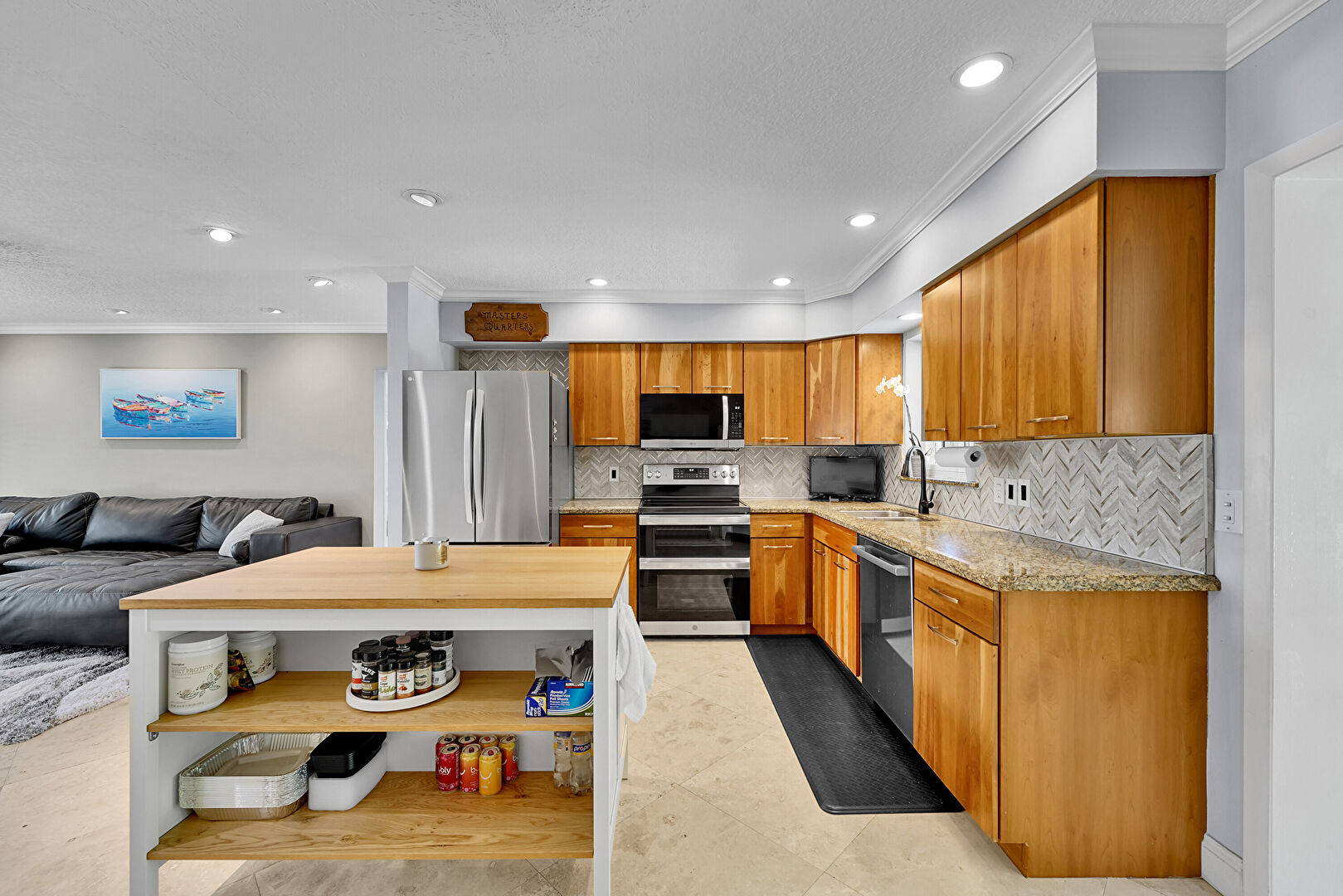 Baseboards Wall, Butcher Block Countertops, Ceiling Fan, Crown Molding, Drywall, Kitchen Bar, Kitchen Island, L Shaped Kitchen, Medium Brown Cabinets, Natural Light, Open Shelves, Opens To Living Area, Recessed Lighting, Shaker Cabinets, Stone Countertops, Textured Ceiling, Tile Floor, Toaster, Vent, Butcher Block Countertops, L Shaped Kitchen, Medium Brown Cabinets, Natural Light, Recessed Lighting, Stone Countertops