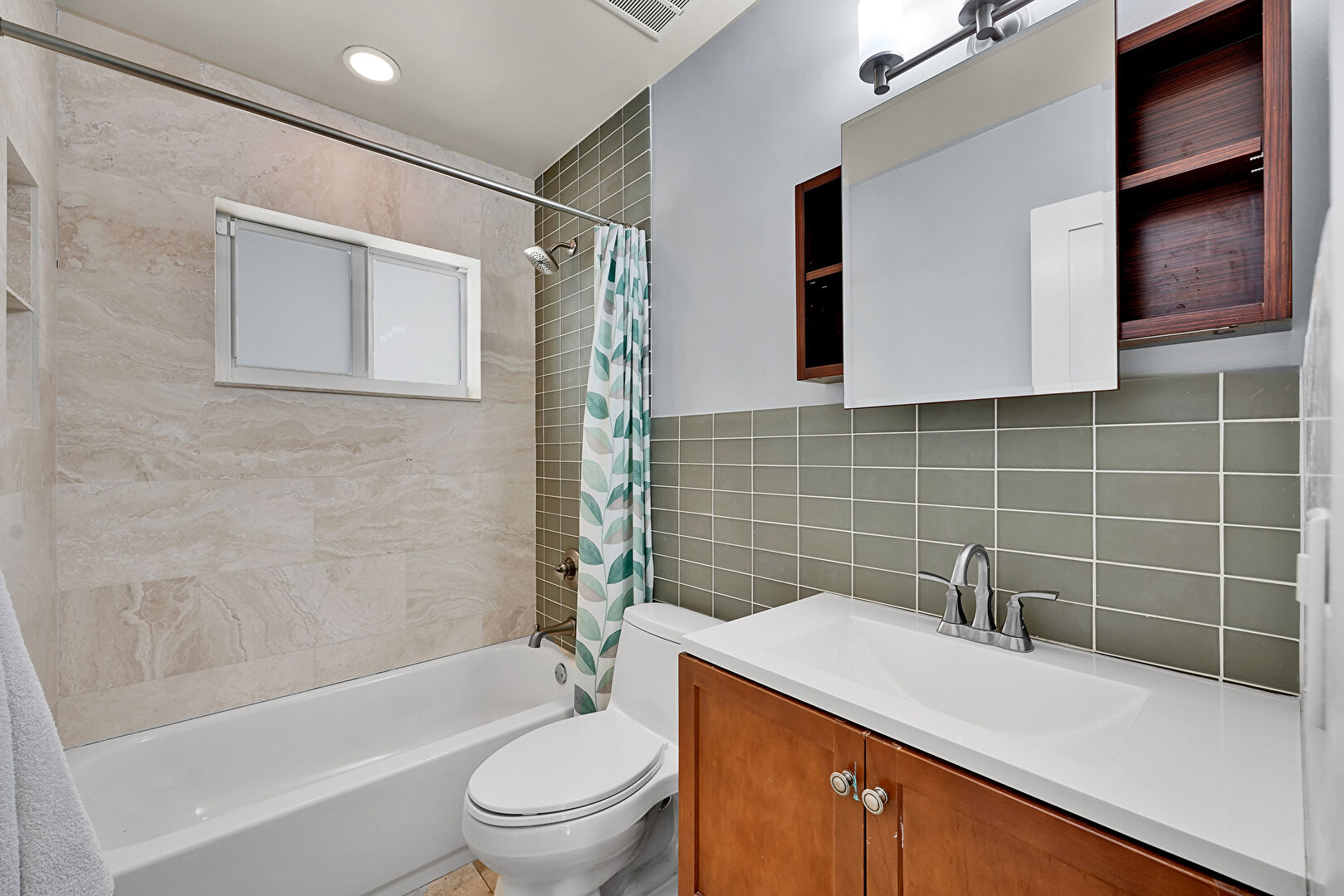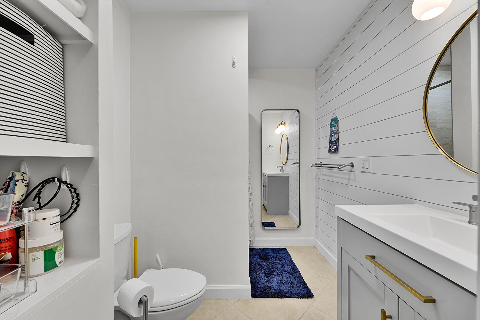 Baseboards Wall, Closet, Combined Bath Shower, Drywall, Full Bathroom, Natural Light, Recessed Lighting, Tile Floor, Tile Wall, Vanity, Vent, Wood Wall, Baseboards Wall, Drywall, Natural Light, Tile Floor, Tile Wall