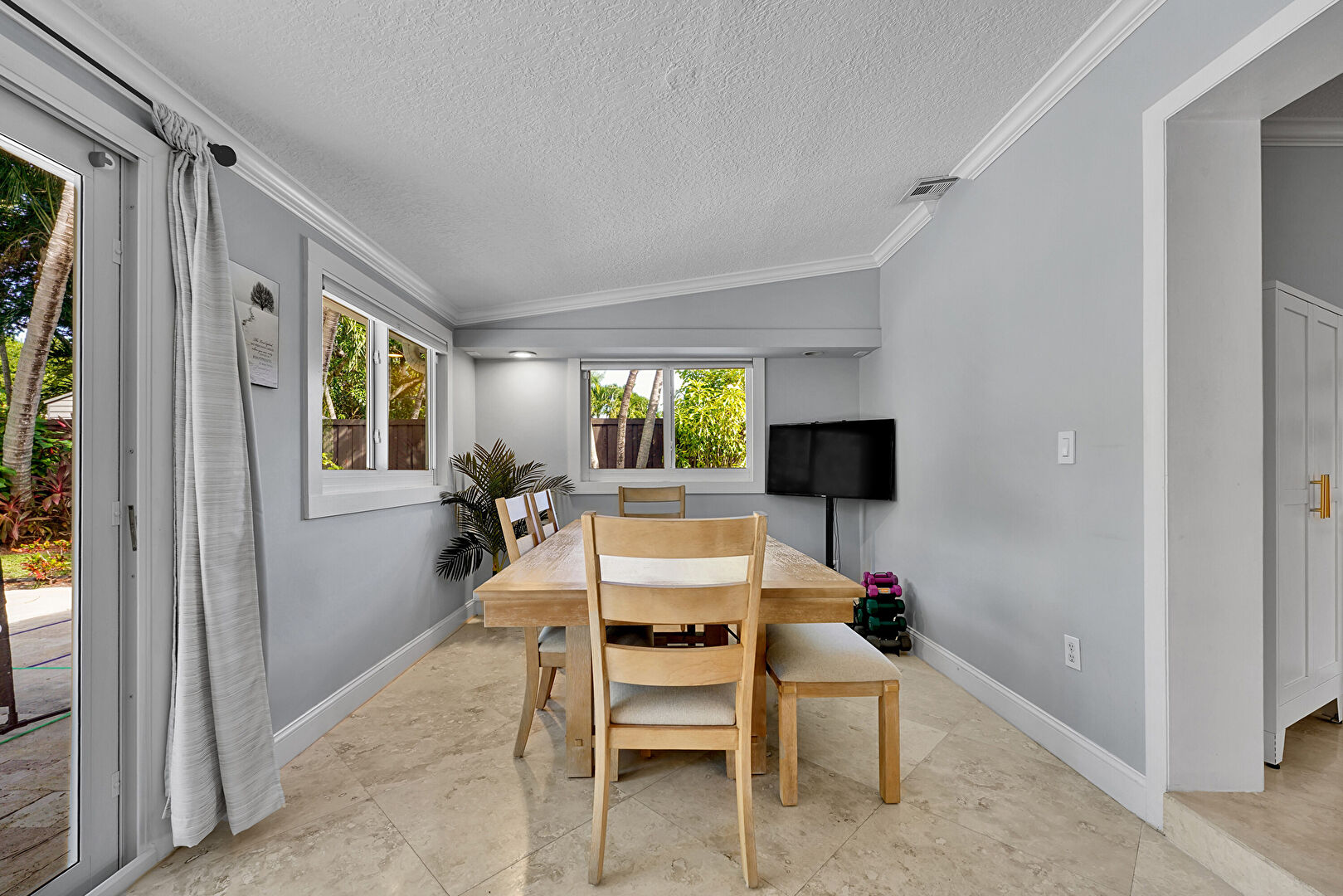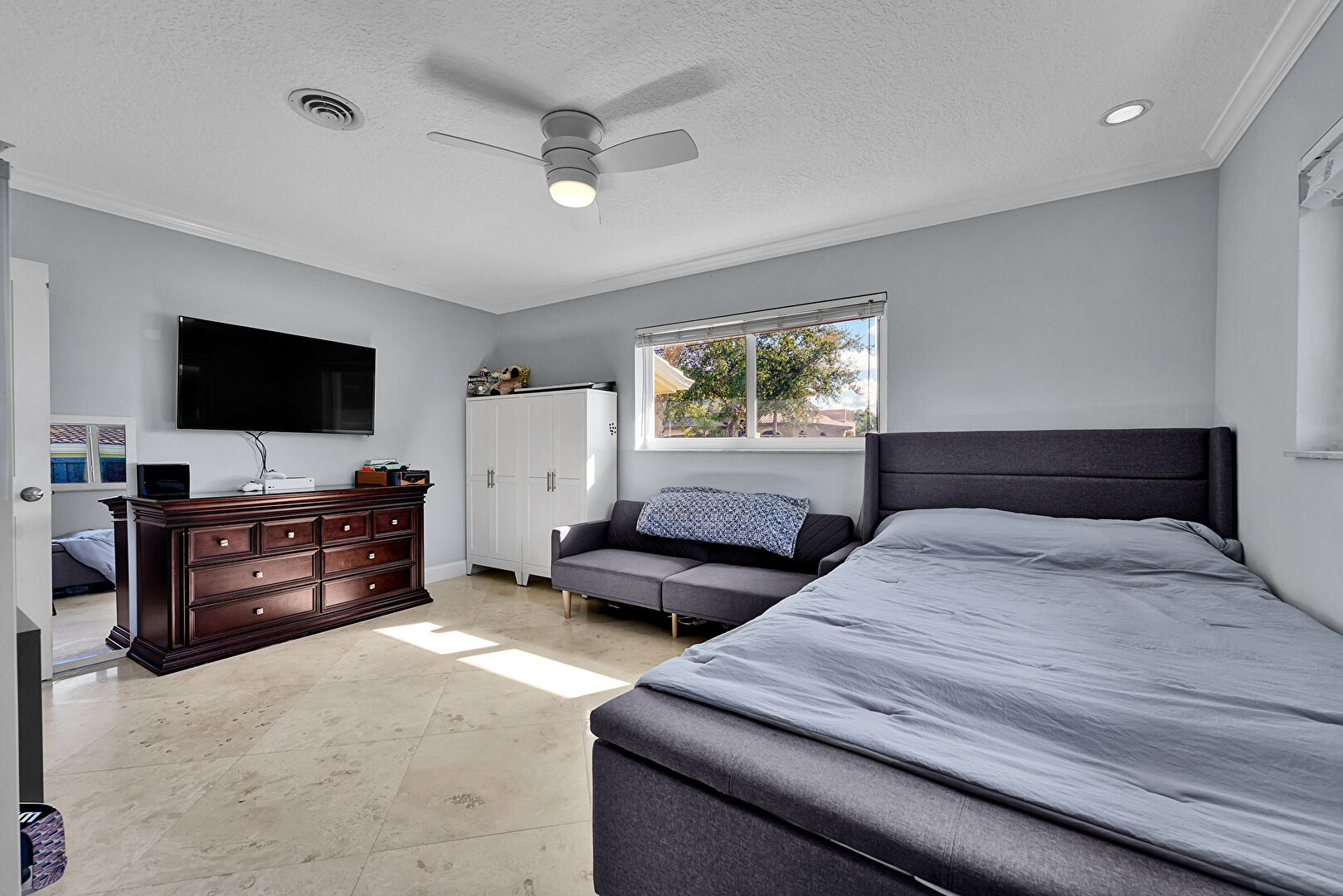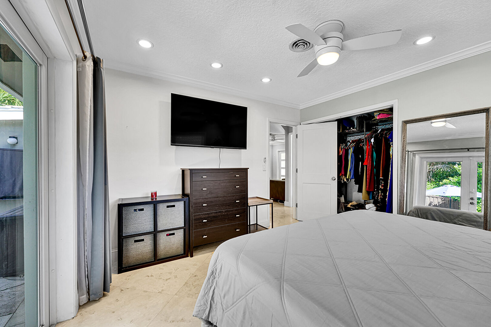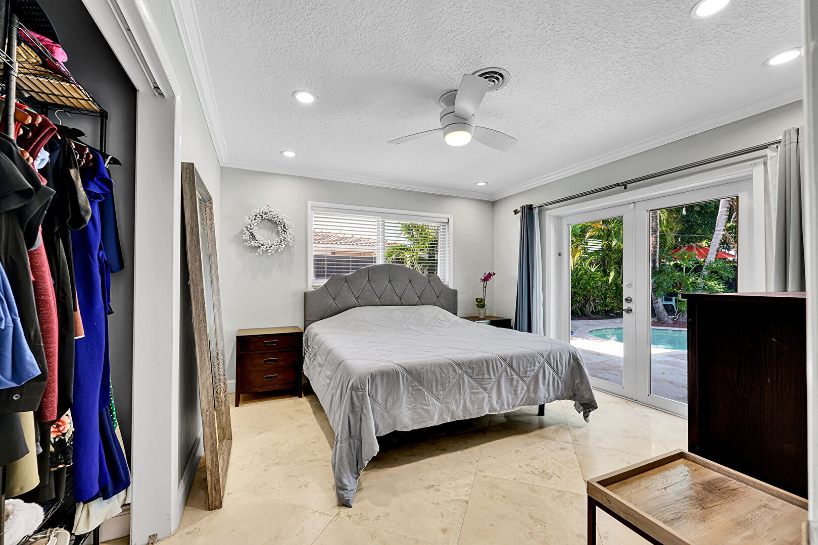 Access To Exterior, Baseboards Wall, Ceiling Fan, Closet, Crown Molding, Drywall, French Doors, Natural Light, Office Area, Pool View, Recessed Lighting, Textured Ceiling, Tile Floor, Vent, Baseboards Wall, Ceiling Fan, Crown Molding, Drywall, French Doors, Textured Ceiling, Tile Floor