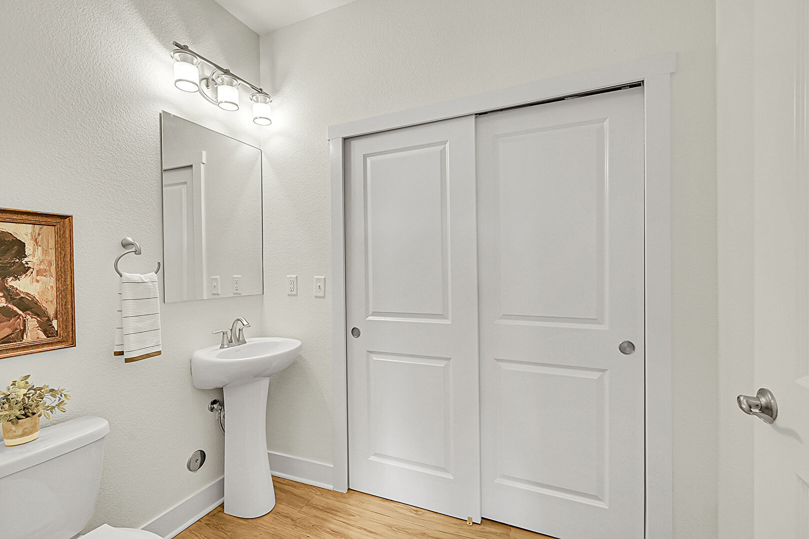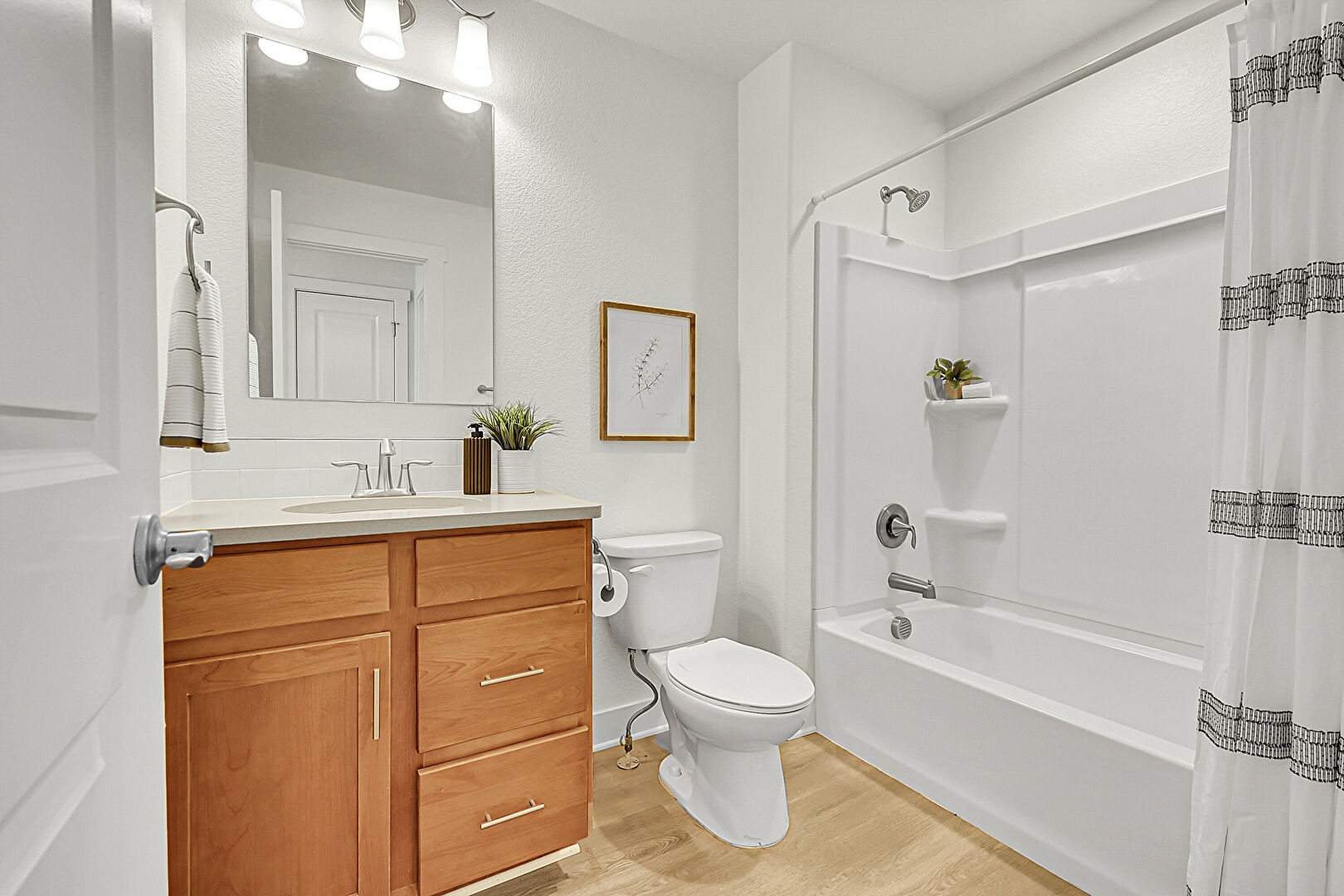 Baseboards Wall, Combined Bath Shower, Half Bathroom, Textured Wall, Vanity, Wood Finish Floor, Full Bathroom, Wood Finish Floor