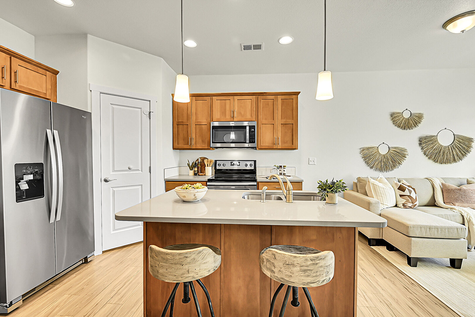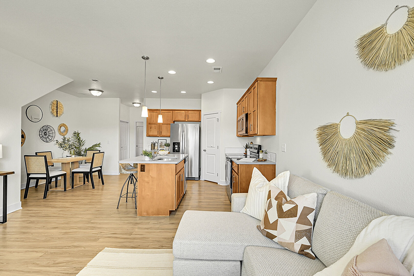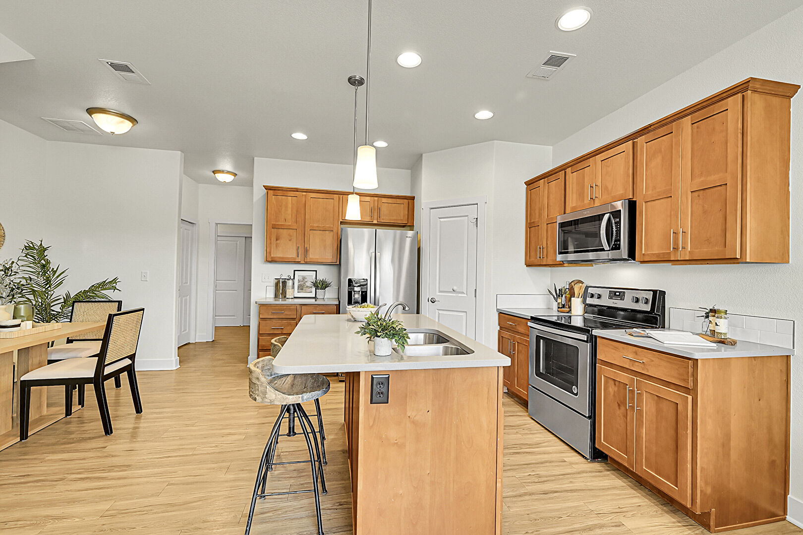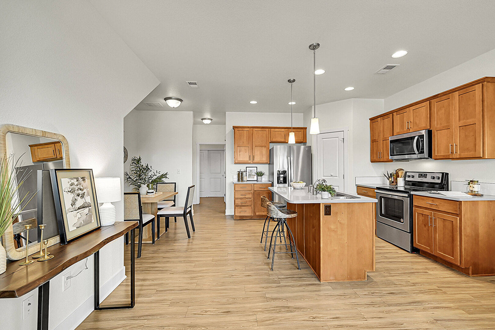 Baseboards Wall, Crown Molding Cabinets, Drywall, Kitchen Bar, Kitchen Island, L Shaped Kitchen, Natural Light, Opens To Living Area, Pendant Lighting, Recessed Lighting, Shaker Cabinets, Vent, Wood Finish Floor, Drywall, Vent
