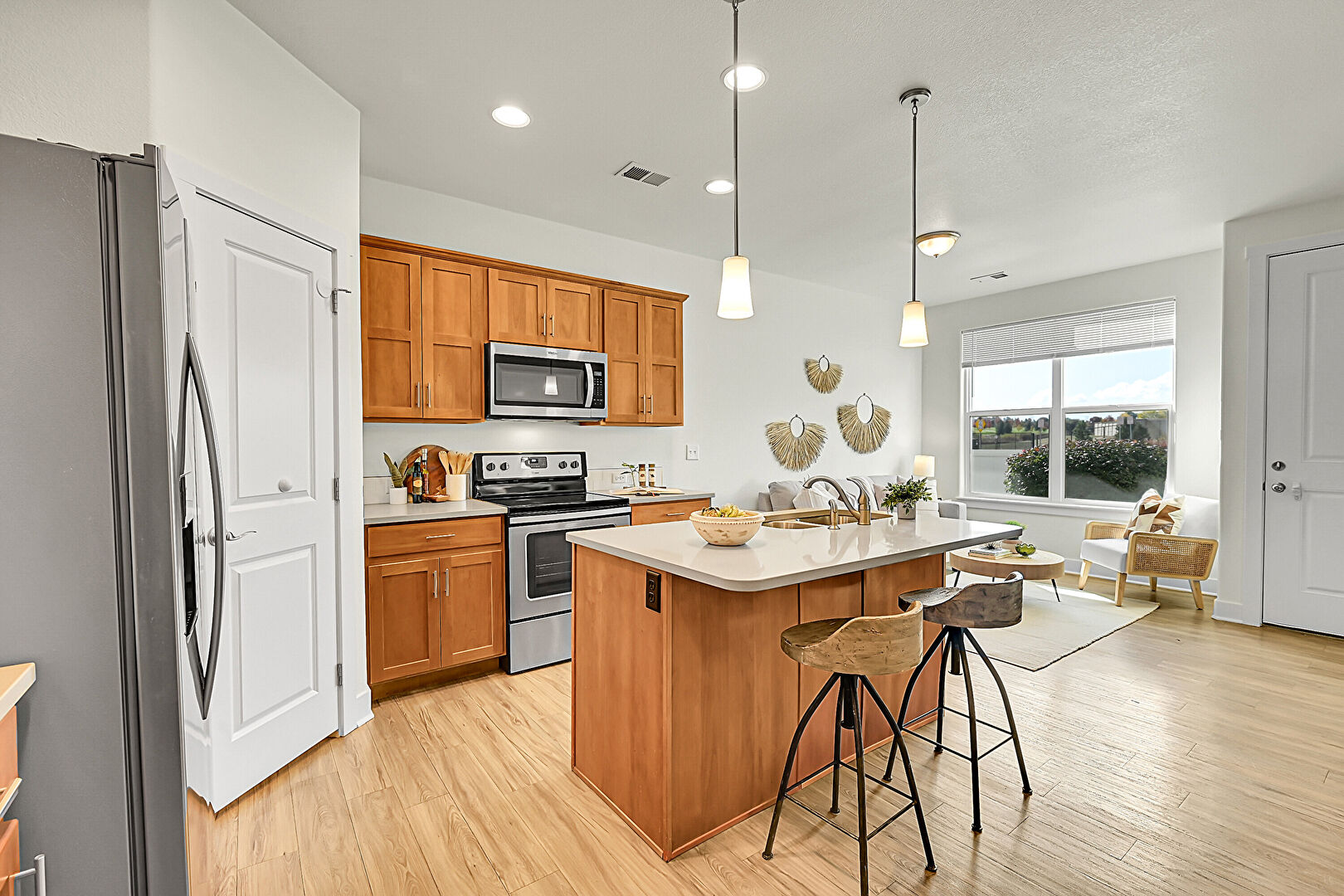 Baseboards Wall, Crown Molding Cabinets, Drywall, Kitchen Bar, Kitchen Island, L Shaped Kitchen, Medium Brown Cabinets, Natural Light, Opens To Living Area, Pendant Lighting, Recessed Lighting, Shaker Cabinets, Stone Countertops, Vent, Wood Finish Floor, Kitchen Island, Shaker Cabinets, Stone Countertops