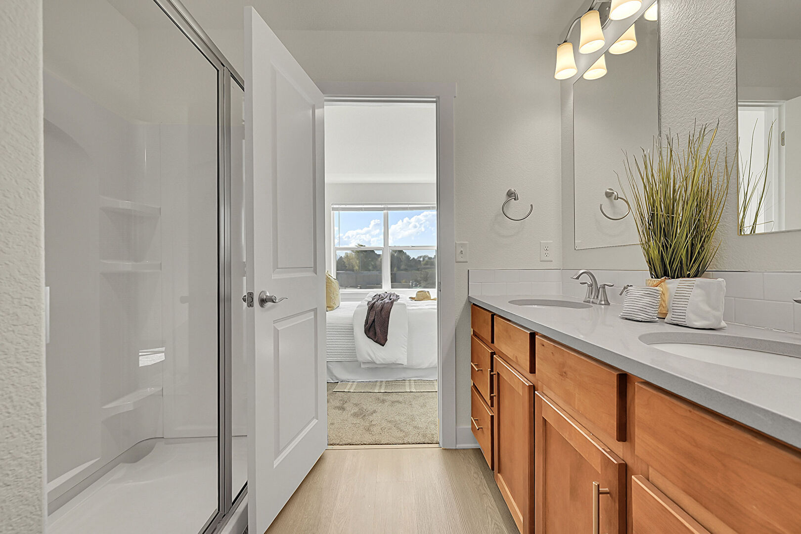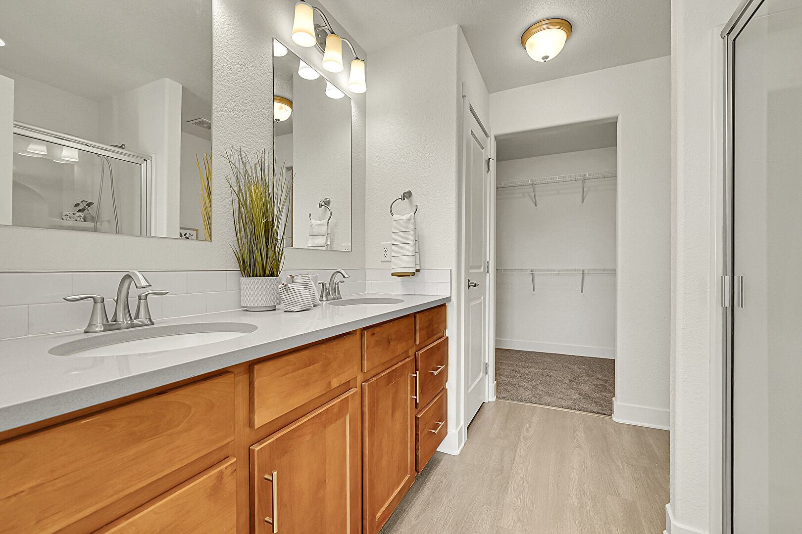 Baseboards Wall, Double Vanity, Drywall, Walk In Closet, Wood Finish Floor, Full Bathroom