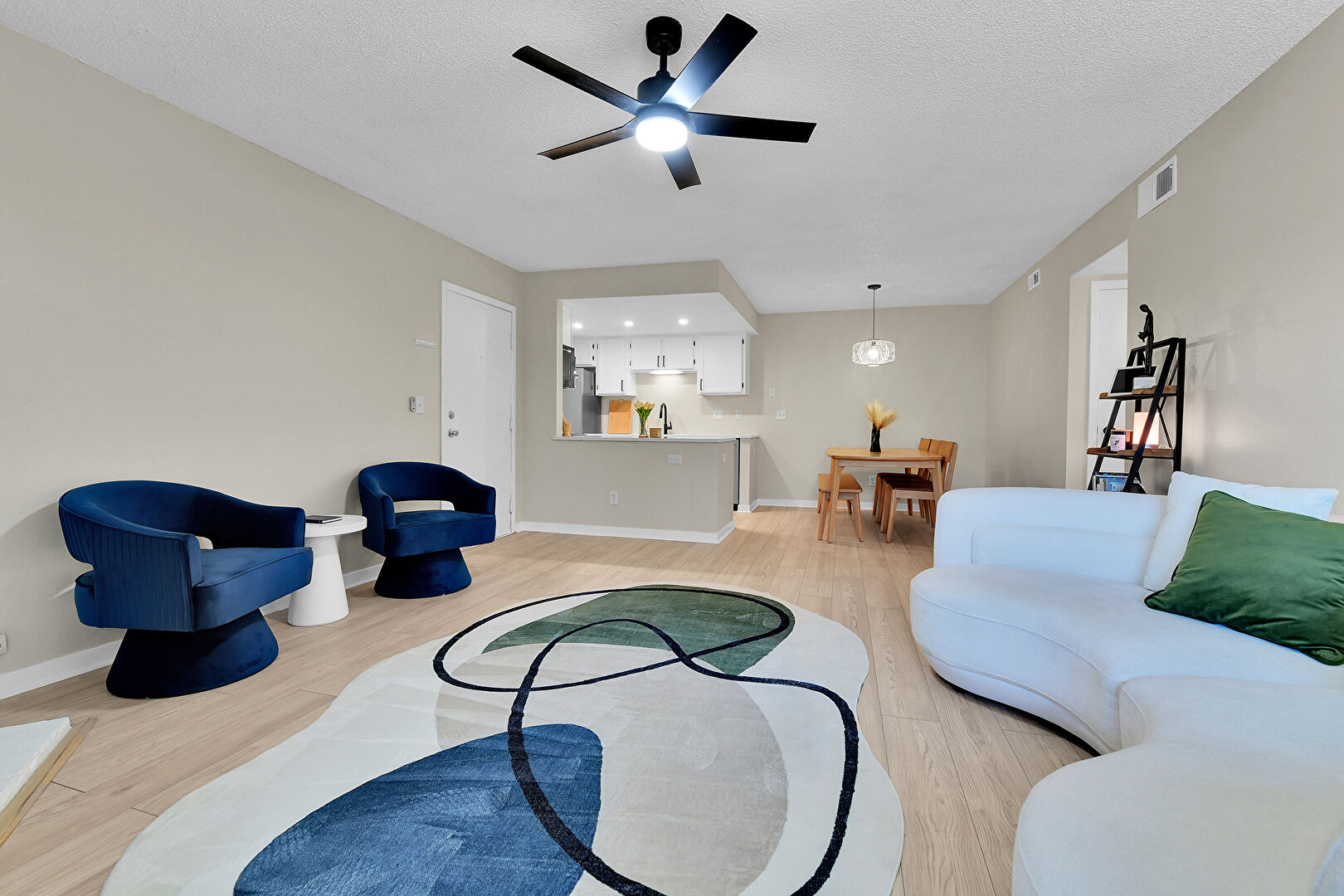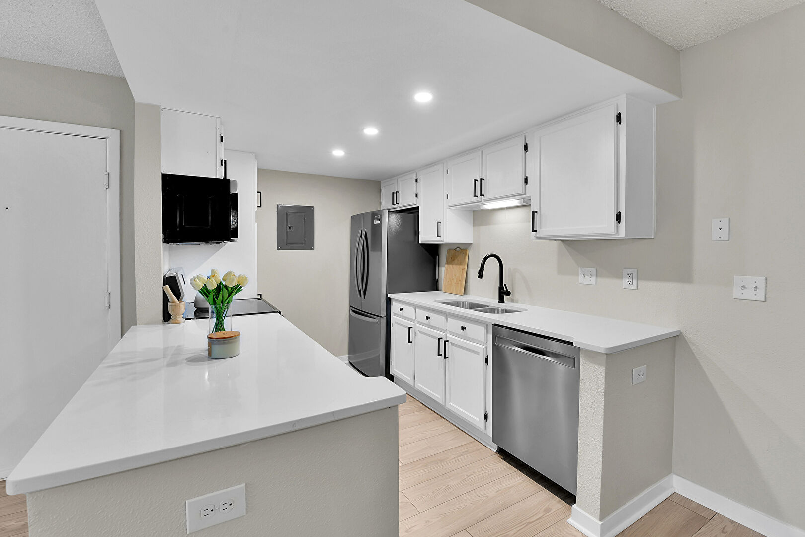 Baseboards Wall, Ceiling Fan, Drywall, Electric Panel, Galley Kitchen, Kitchen Peninsula, Natural Light, Opens To Living Area, Pendant Lighting, Recessed Lighting, Shaker Cabinets, Stone Countertops, Textured Ceiling, Vent, Visible Hinge Cabinets, Wood Finish Floor, Electric Panel, Notable Chandelier, Shaker Cabinets, Textured Ceiling, Visible Hinge Cabinets