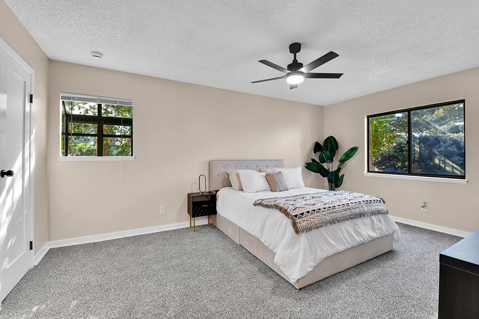 Baseboards Wall, Carpet, Ceiling Fan, Drywall, Ensuite Bathroom, Natural Light, Textured Ceiling, Vent, Baseboards Wall, Drywall, Natural Light