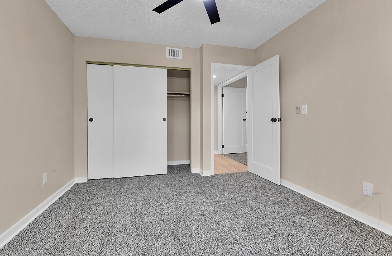 Baseboards Wall, Carpet, Ceiling Fan, Closet, Drywall, Textured Ceiling, Vent, Carpet, Natural Light