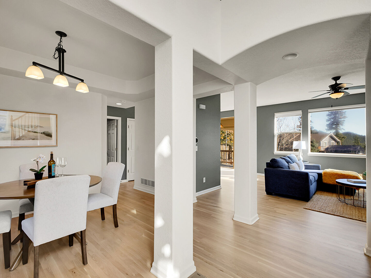 Arched Walkways,  Baseboards Wall,  Built In Shelves,  Ceiling Fan,  Drywall,  Fireplace,  L Shaped Kitchen,  Natural Light,  Recessed Lighting,  Stairs,  Vent,  Wood Finish Floor, Drywall, Stairs, Wood Finish Floor