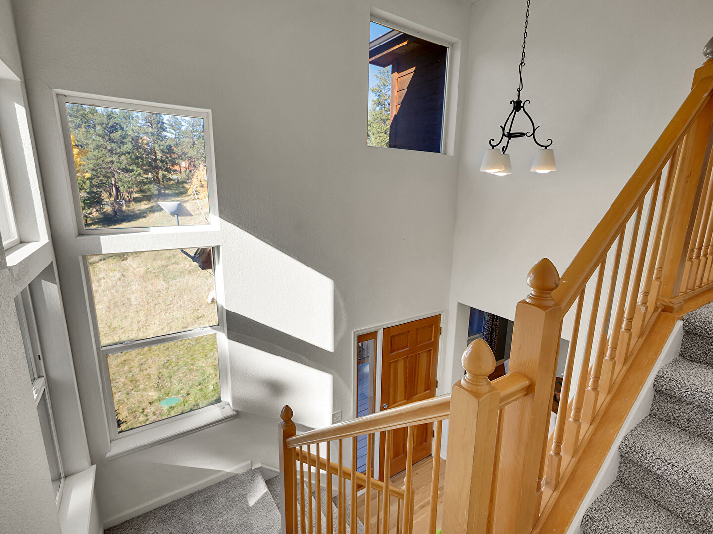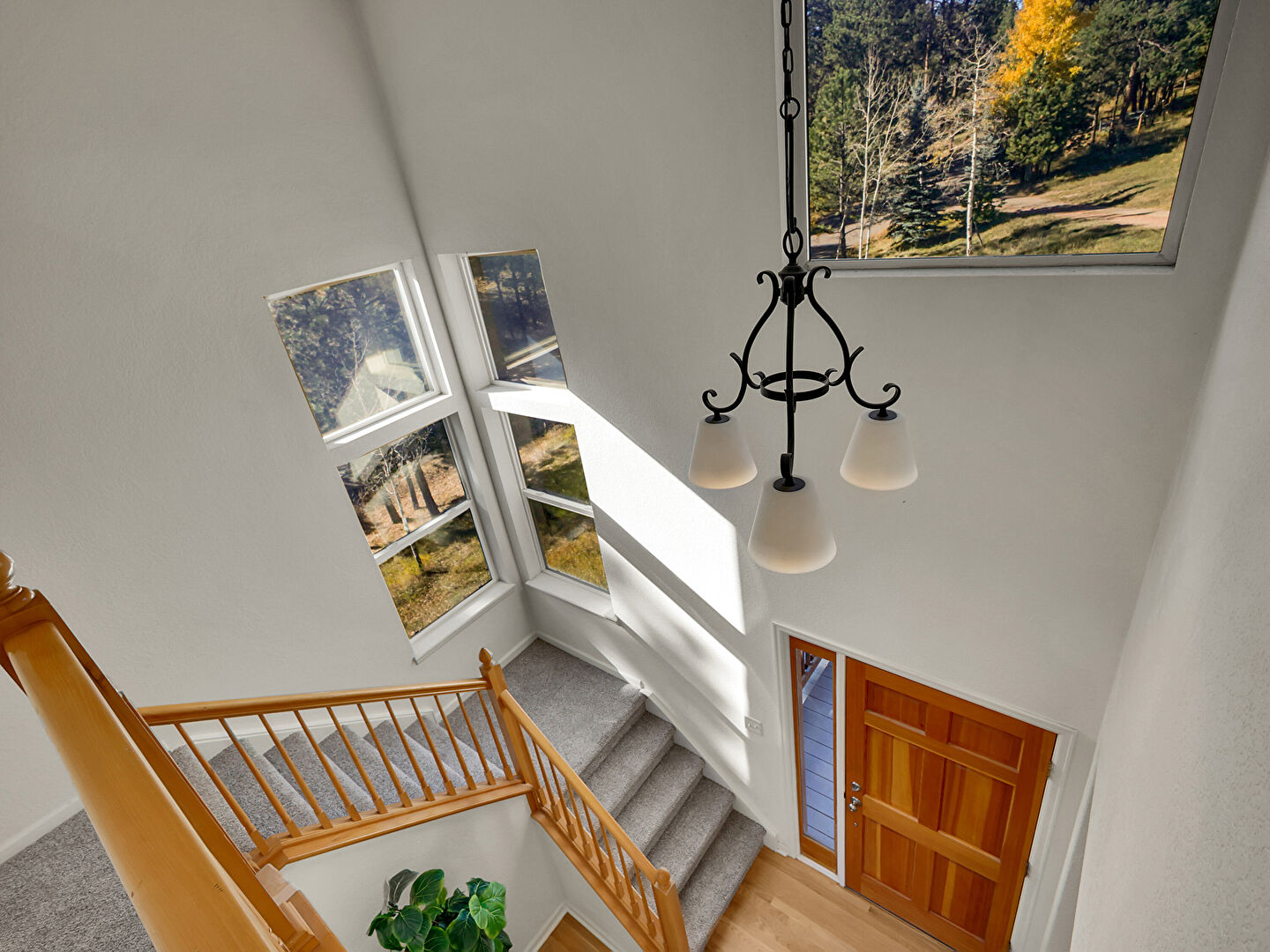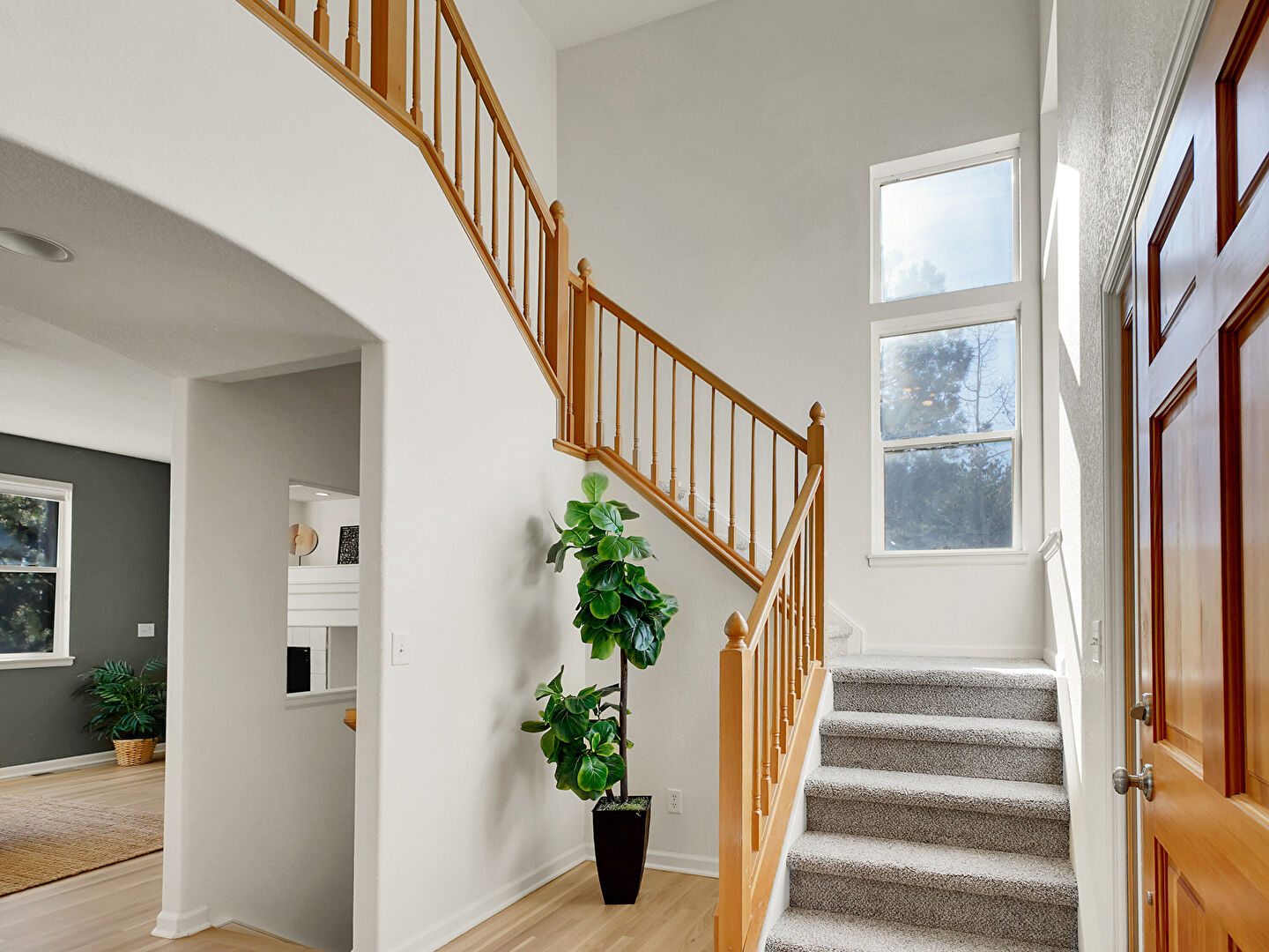 Baseboards Wall,  Drywall,  High Ceiling,  Natural Light,  Stairs, Wood Finish Floor