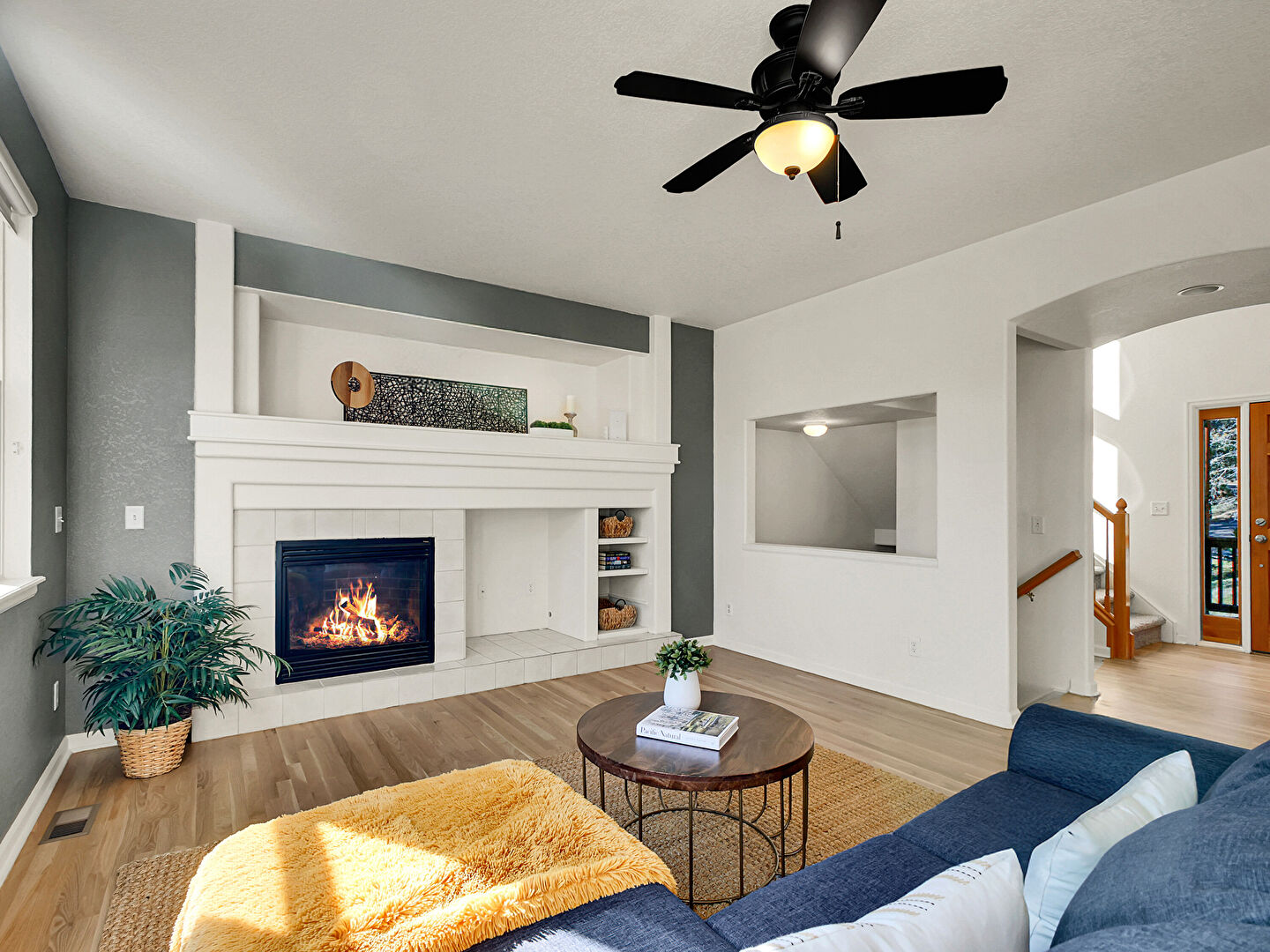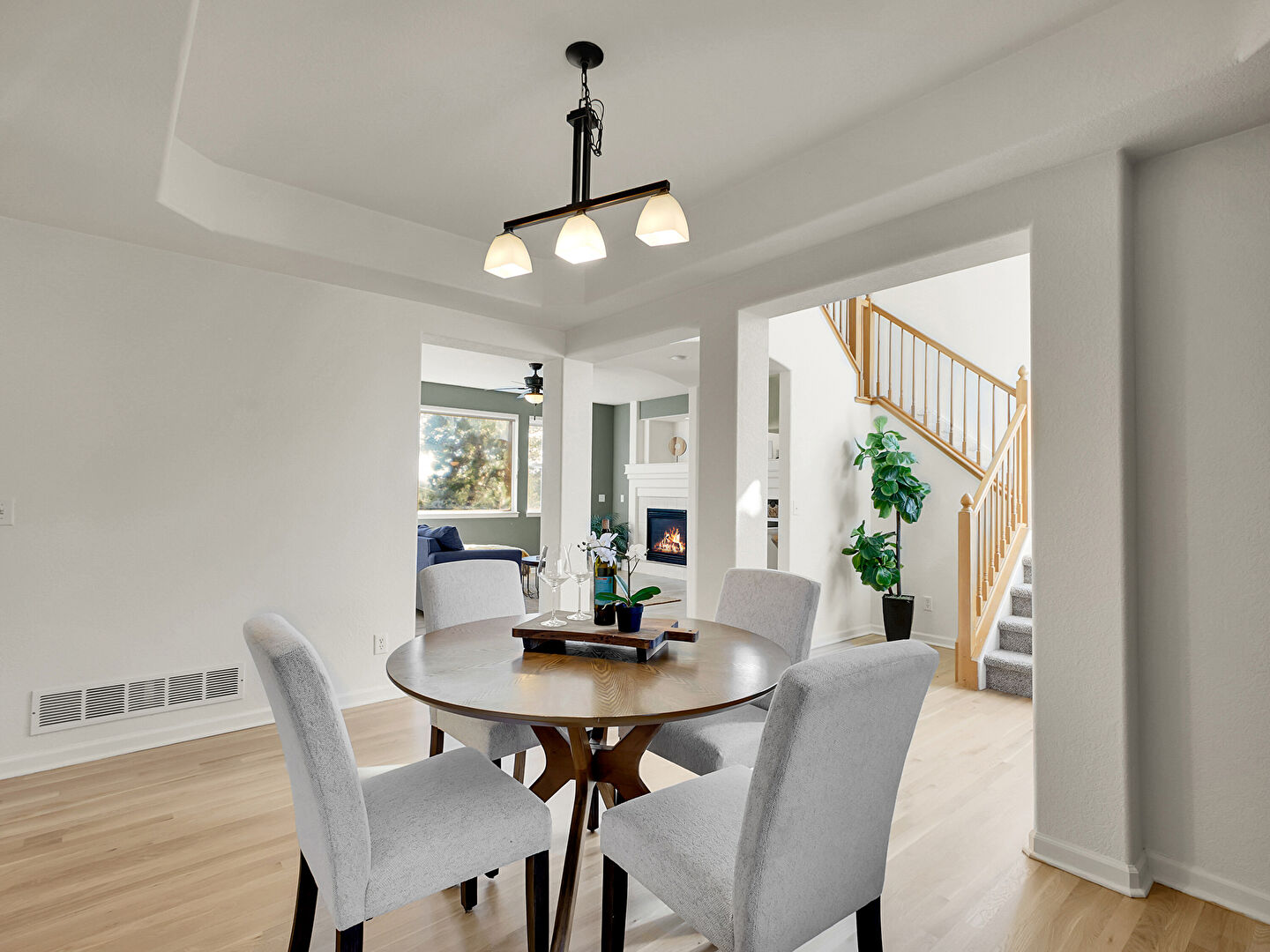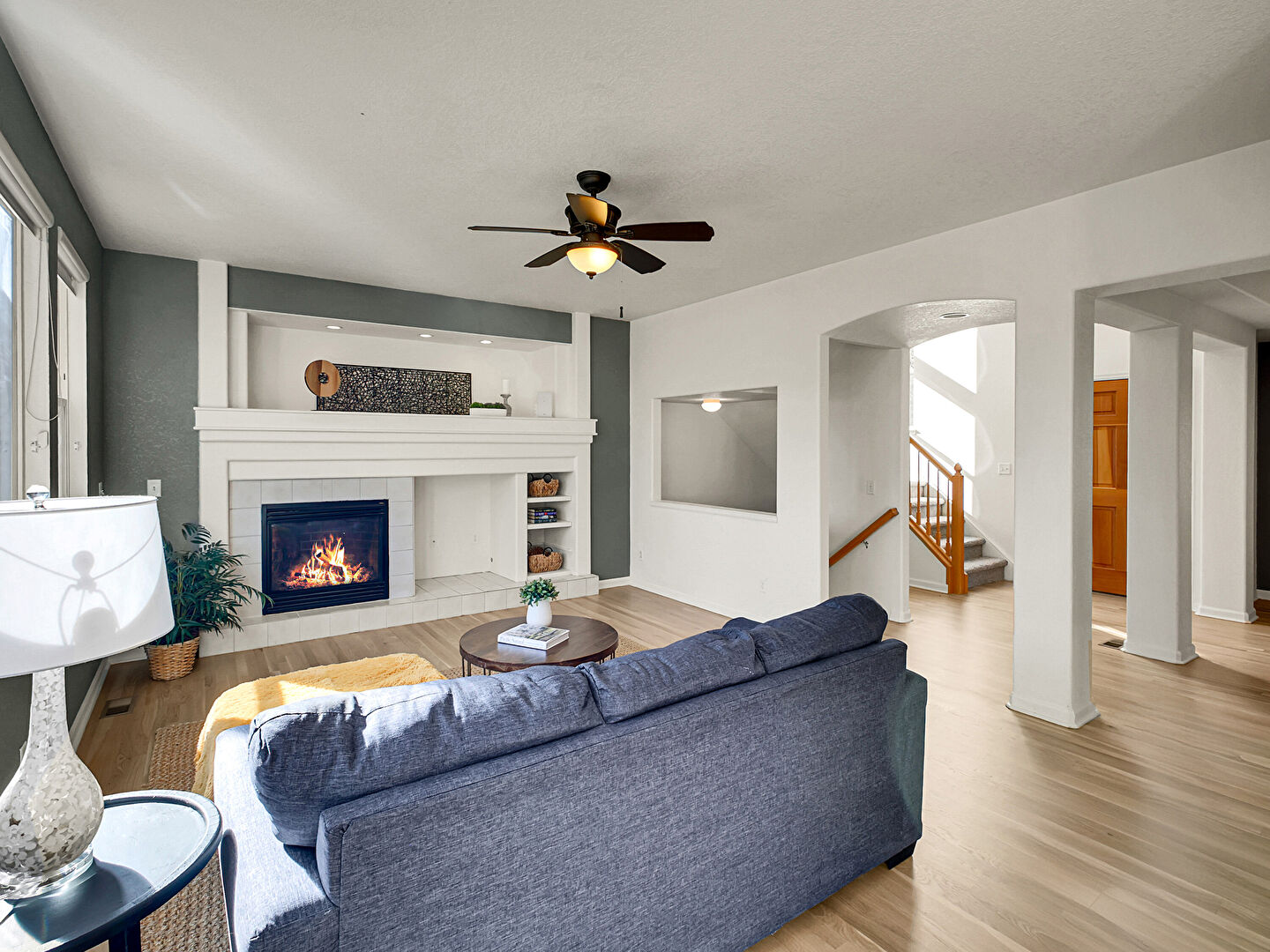 Baseboards Wall,  Ceiling Fan,  Drywall,  Fireplace,  Natural Light,  Recessed Lighting,  Stairs,  Tray Ceiling,  Vent,  Wood Finish Floor, Baseboards Wall, Ceiling Fan, Stairs, Tray Ceiling