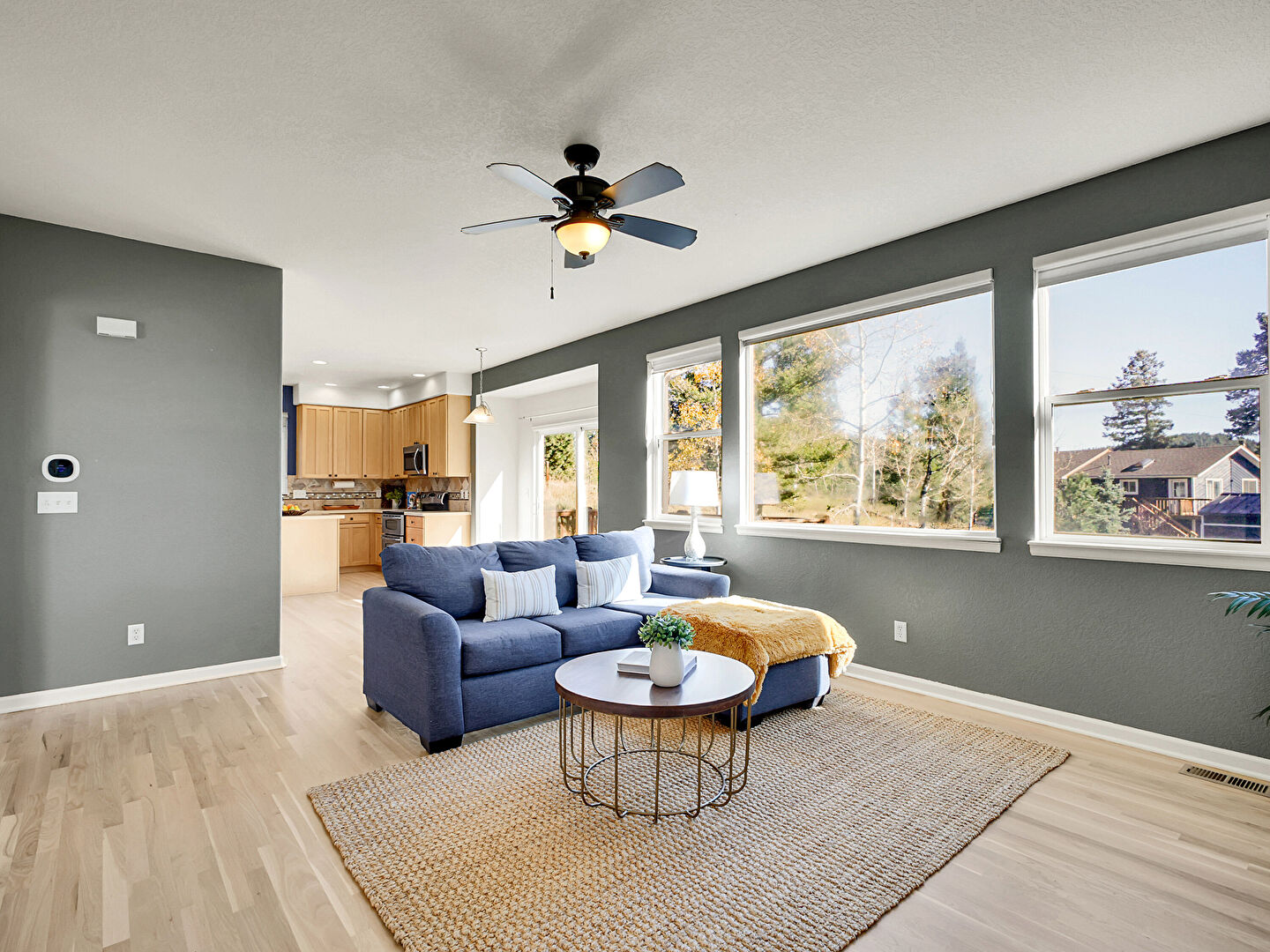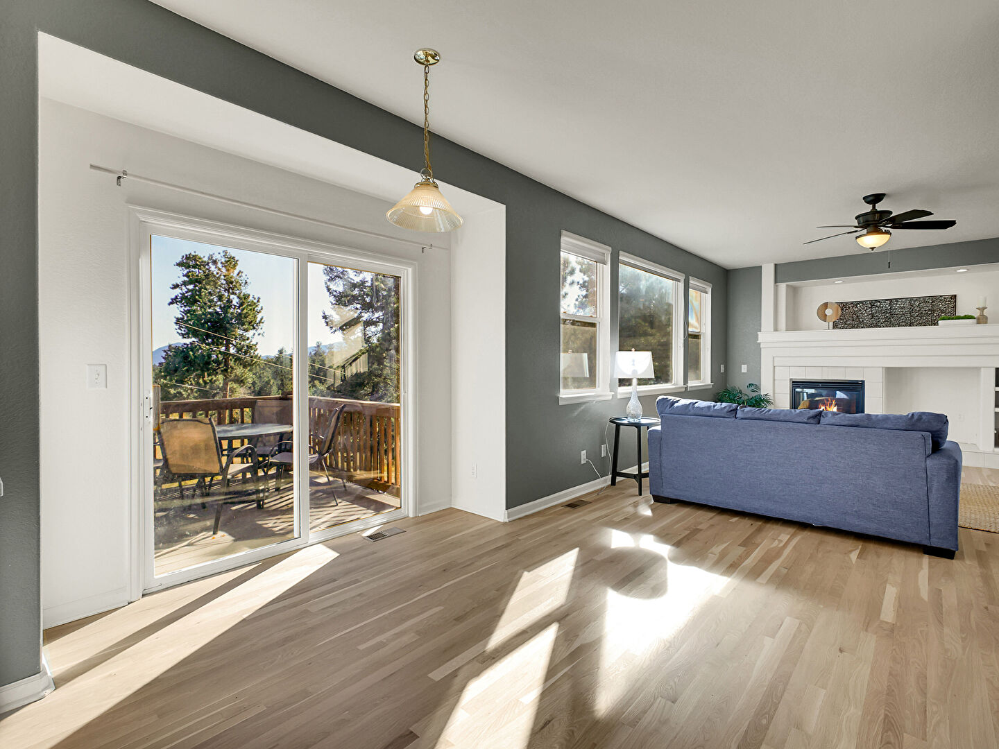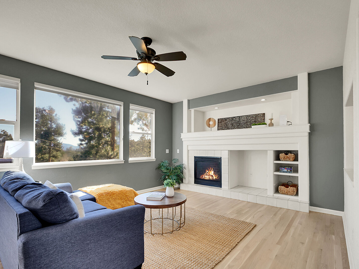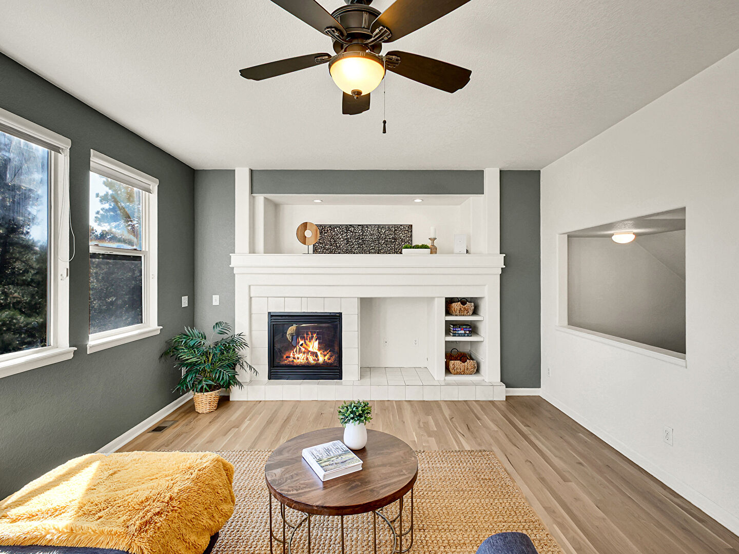 Baseboards Wall,  Ceiling Fan,  Drywall,  Fireplace,  Natural Light,  Recessed Lighting,  Stairs,  Tray Ceiling,  Vent,  Wood Finish Floor, Baseboards Wall, Ceiling Fan, Stairs, Tray Ceiling