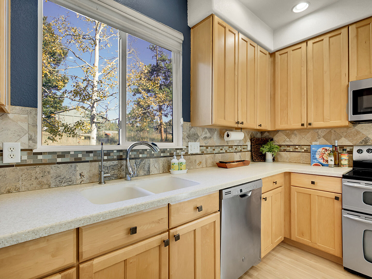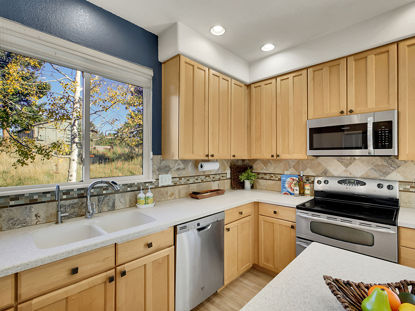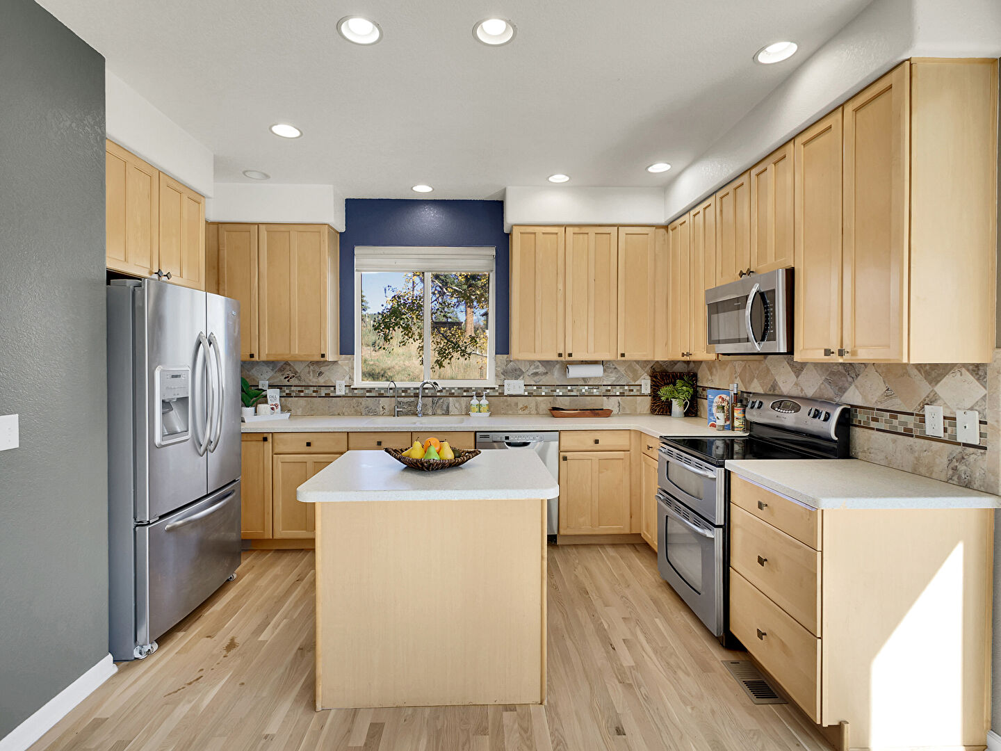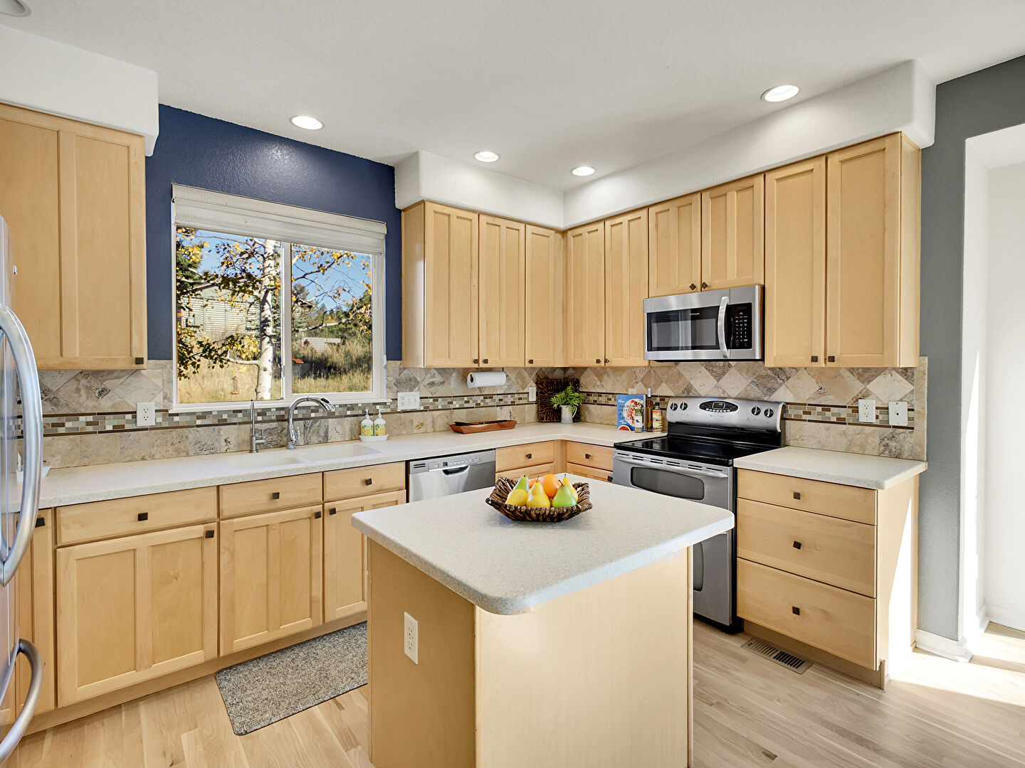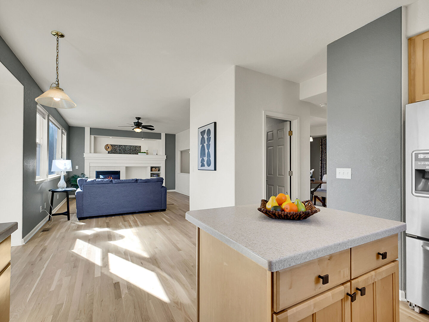 Baseboards Wall,  Ceiling Fan,  Drywall,  Fireplace,  Kitchen Island,  Natural Light,  Opens To Living Area,  Pendant Lighting,  Recessed Lighting,  Shaker Cabinets,  Stone Countertops,  U Shaped Kitchen,  Vent,  Wood Finish Floor, Baseboards Wall, Kitchen Island, Natural Light, Pendant Lighting, Recessed Lighting, Stone Countertops, U Shaped Kitchen