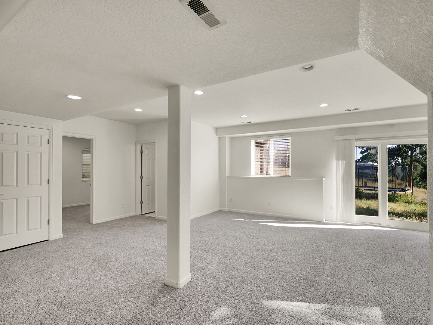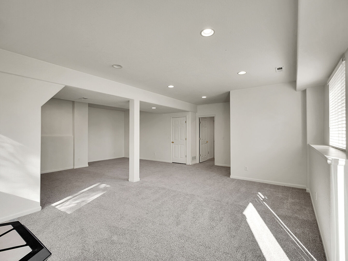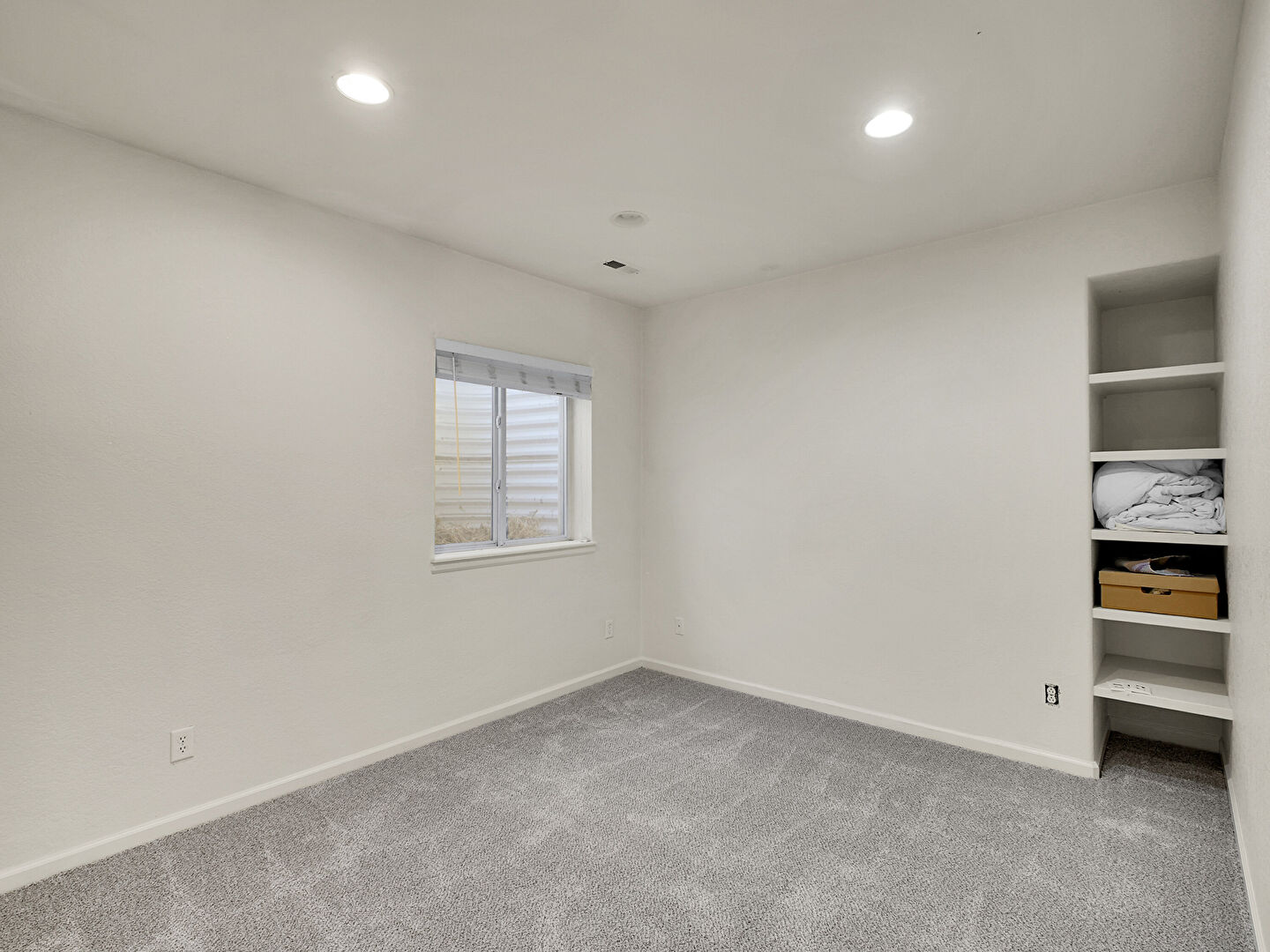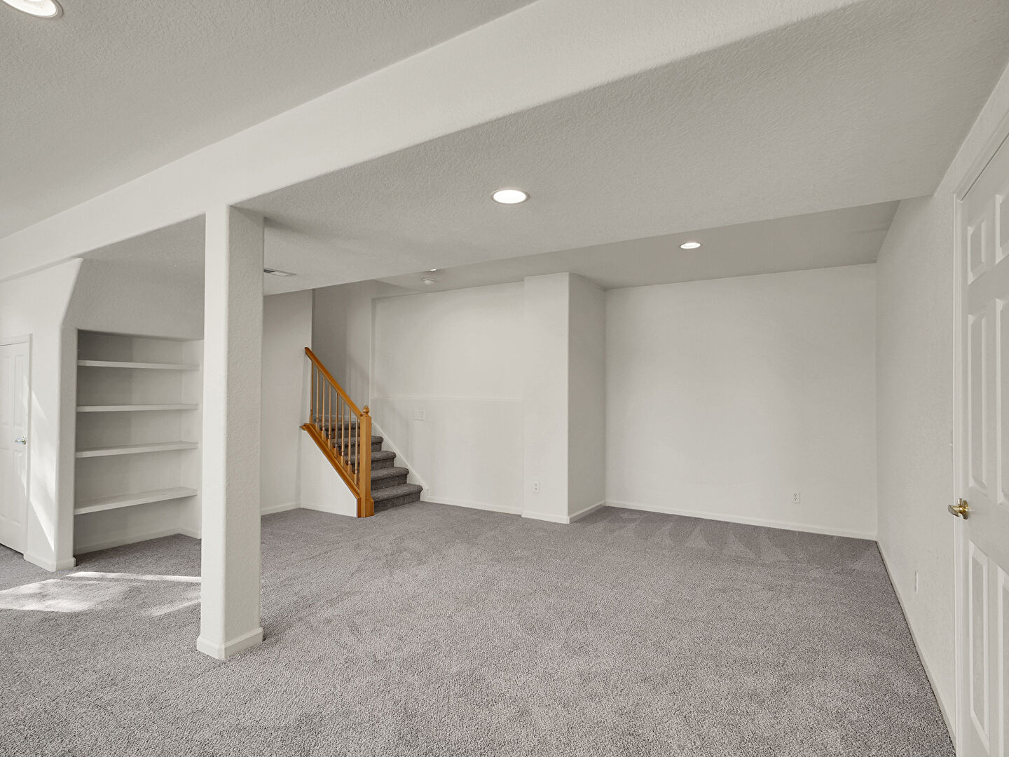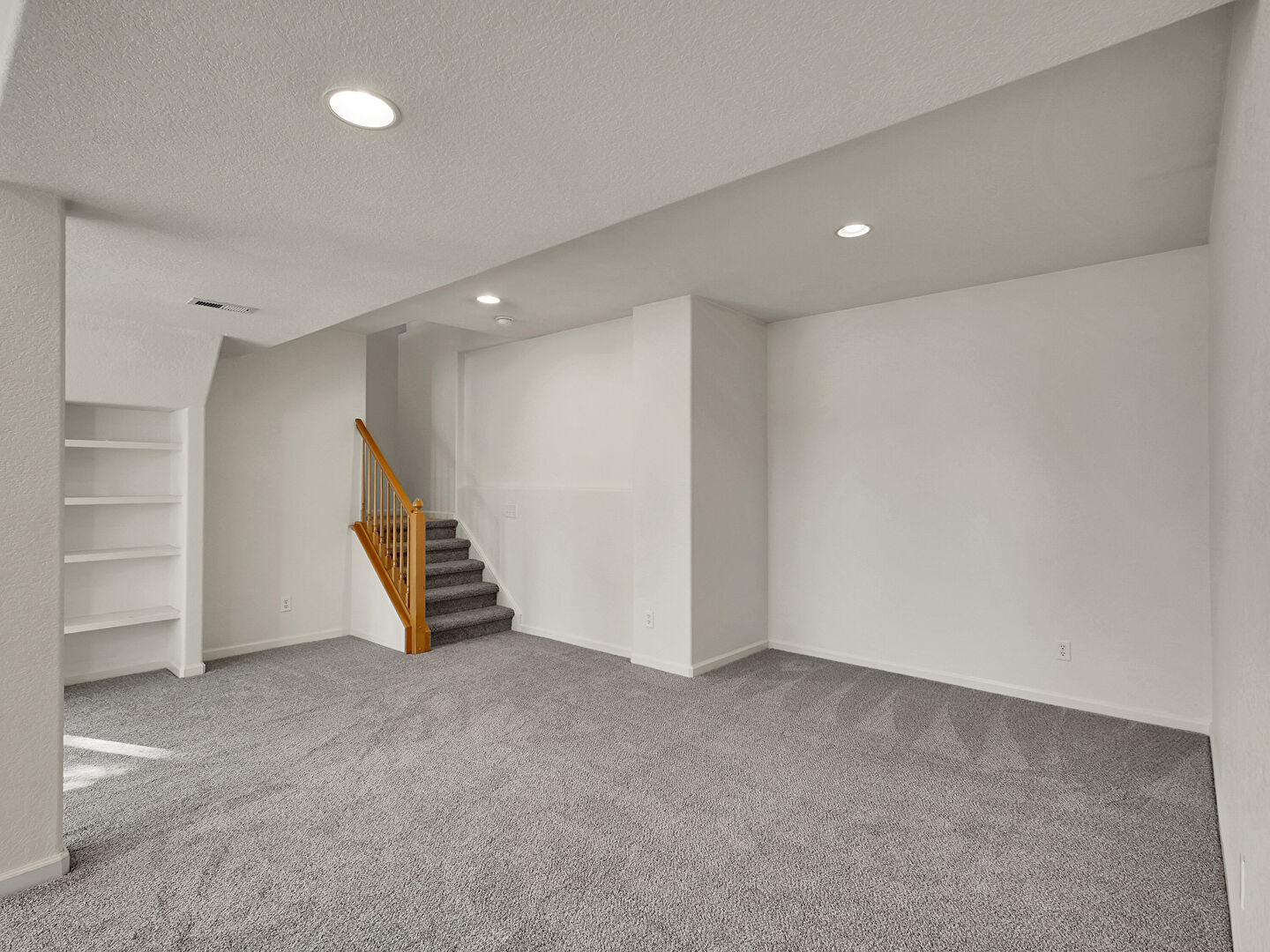 Baseboards Wall,  Basement,  Built In Shelves,  Carpet,  Drywall,  Natural Light,  Recessed Lighting,  Stairs,  Textured Ceiling,  Vent, Baseboards Wall, Basement, Drywall, Stairs