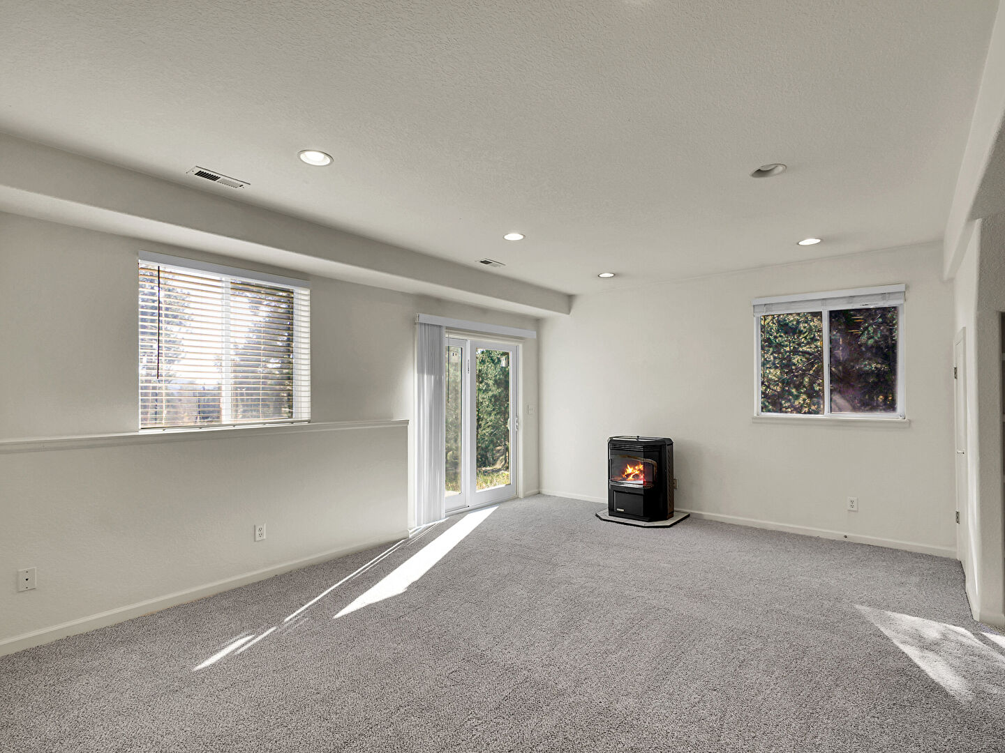 Baseboards Wall,  Drywall,  Natural Light,  Recessed Lighting,  Vent,  Wood Stove, Carpet