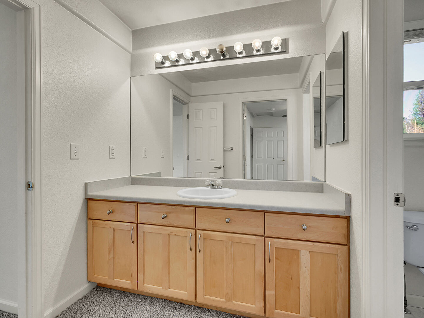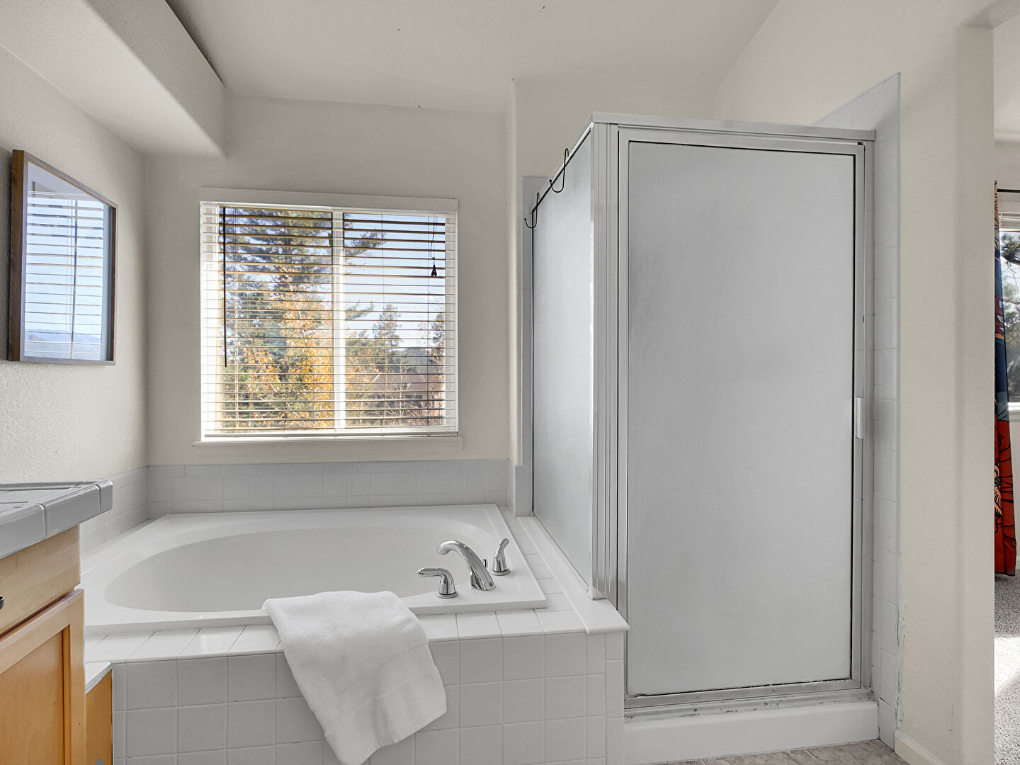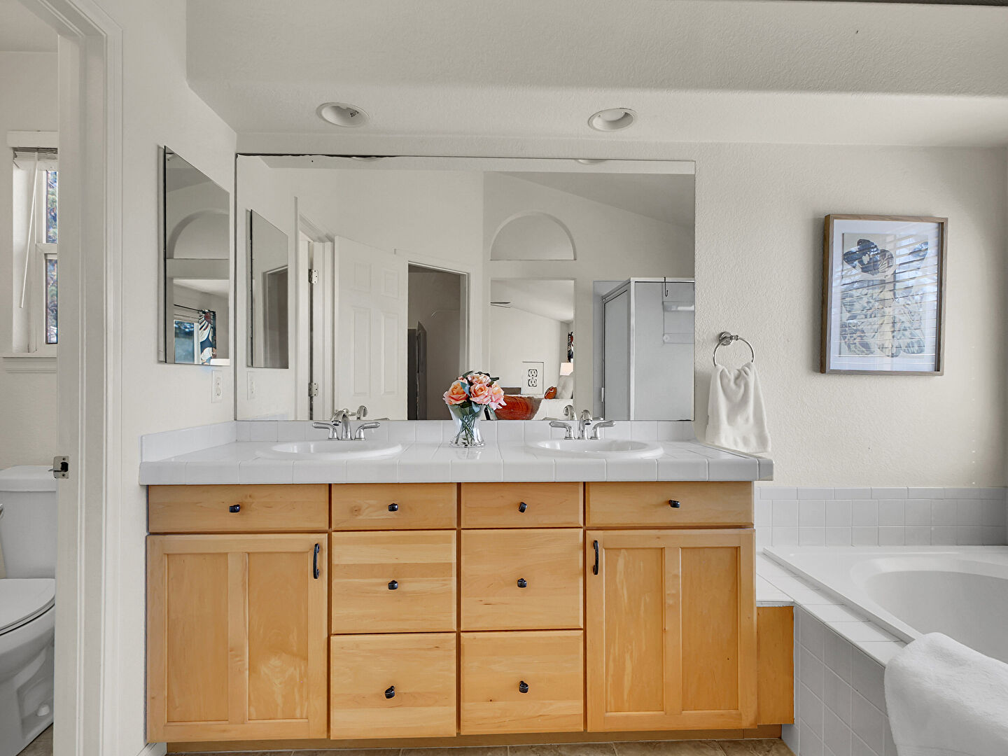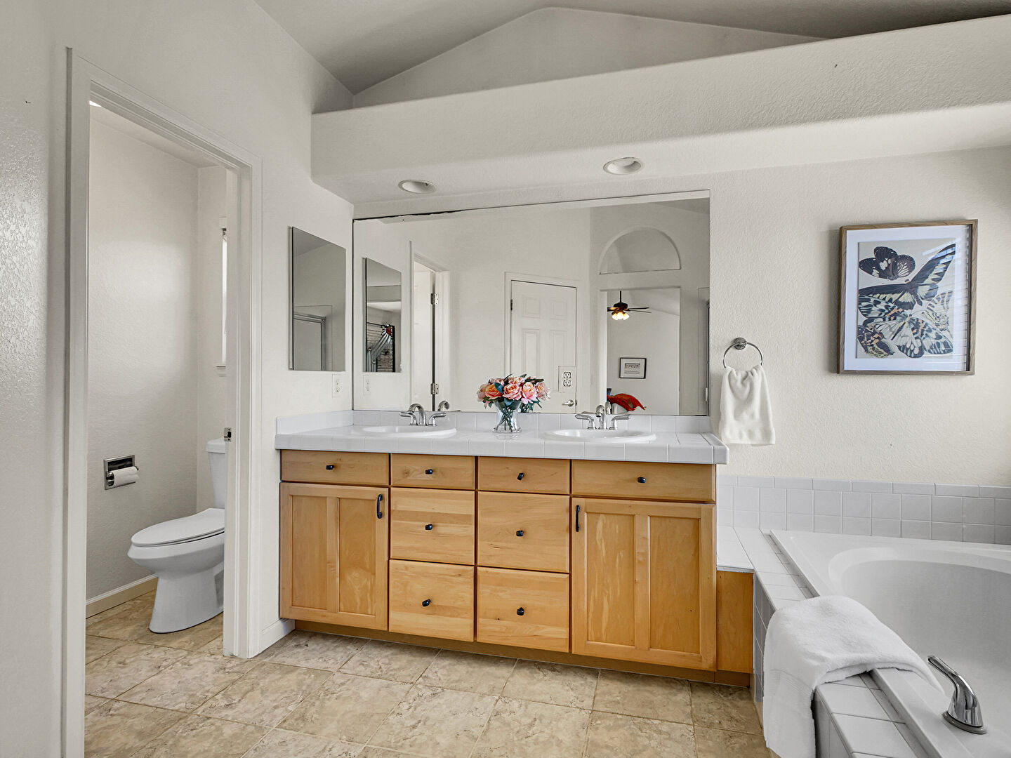 Baseboards Wall,  Carpet,  Ceiling Fan,  Combined Bath Shower,  Double Vanity,  Drywall,  Full Bathroom,  Half Bathroom,  Natural Light,  Recessed Lighting,  Textured Wall,  Tile Floor,  Vanity,  Vaulted Ceiling,  Water Closet,  Wood Finish Floor, Baseboards Wall, Carpet, Combined Bath Shower, Double Vanity, Full Bathroom, Half Bathroom, Tile Floor, Vaulted Ceiling, Vent, Water Closet