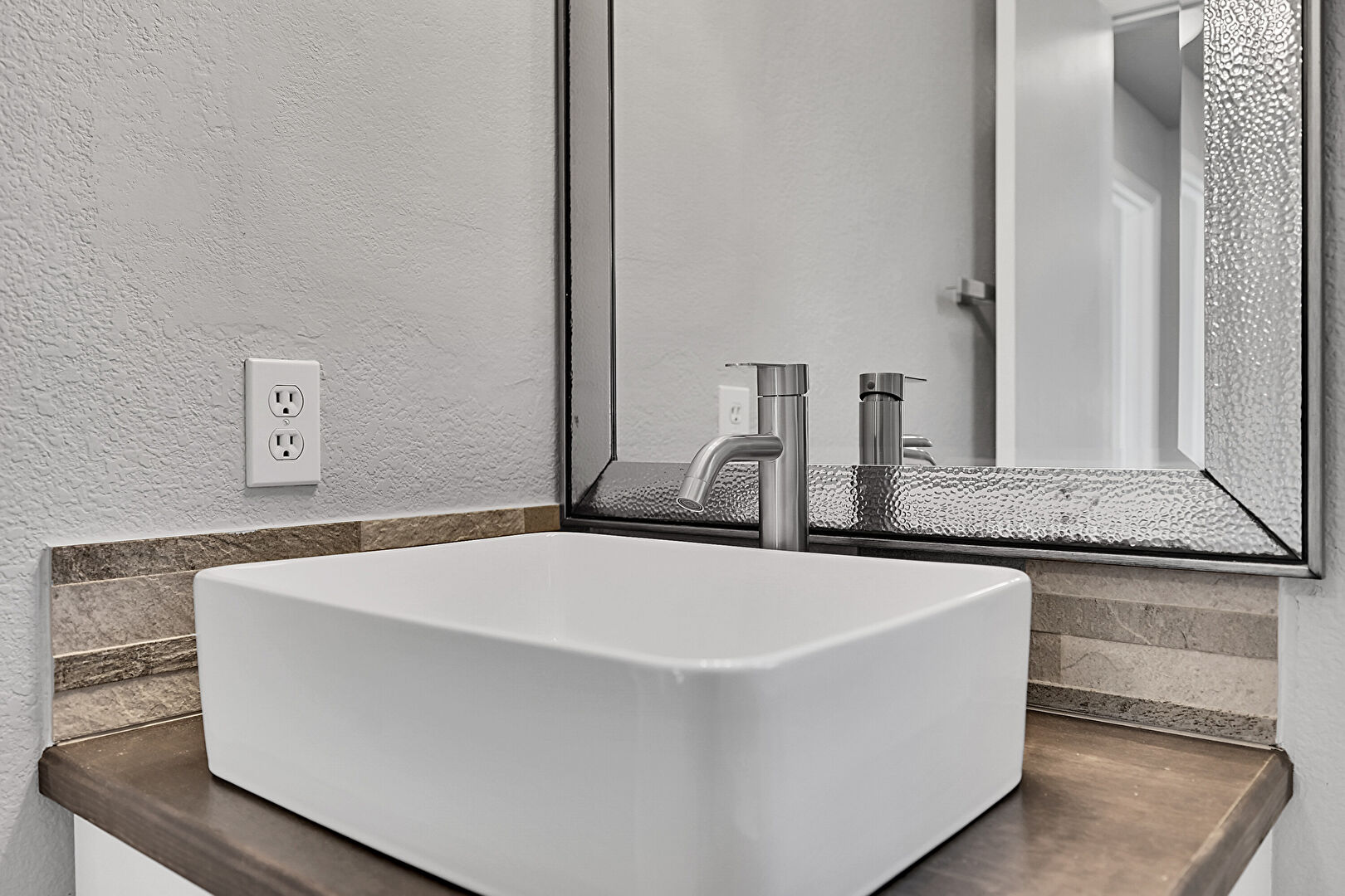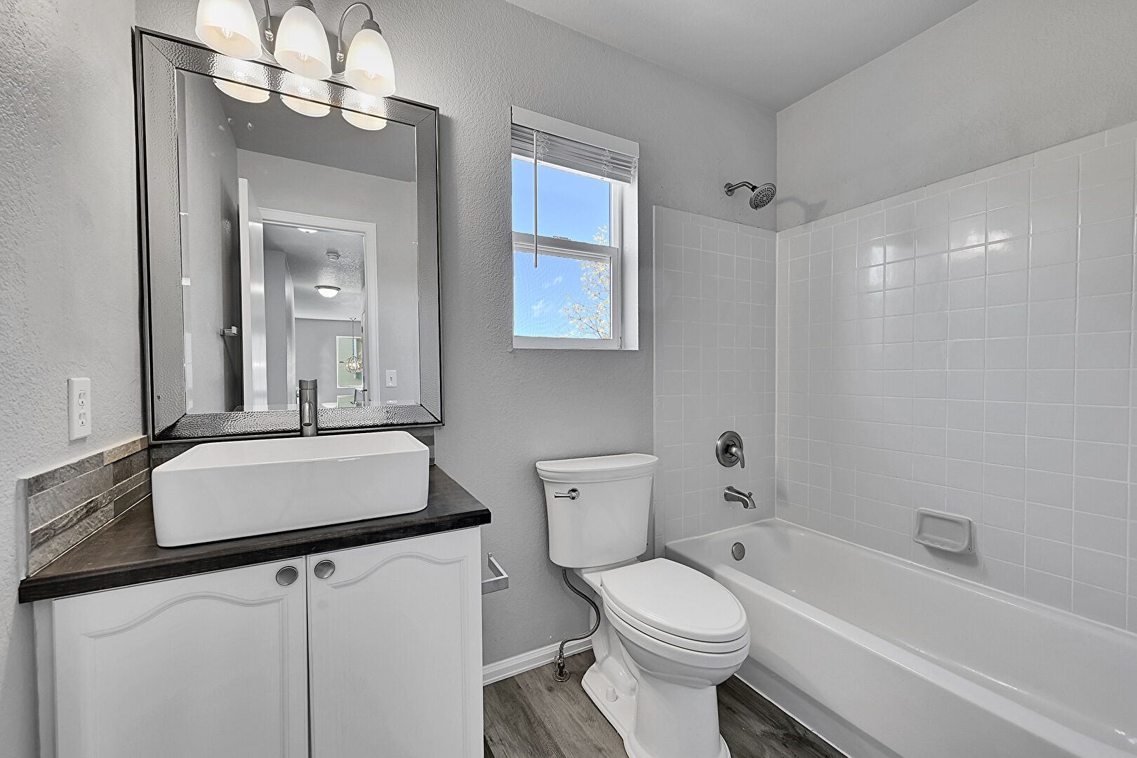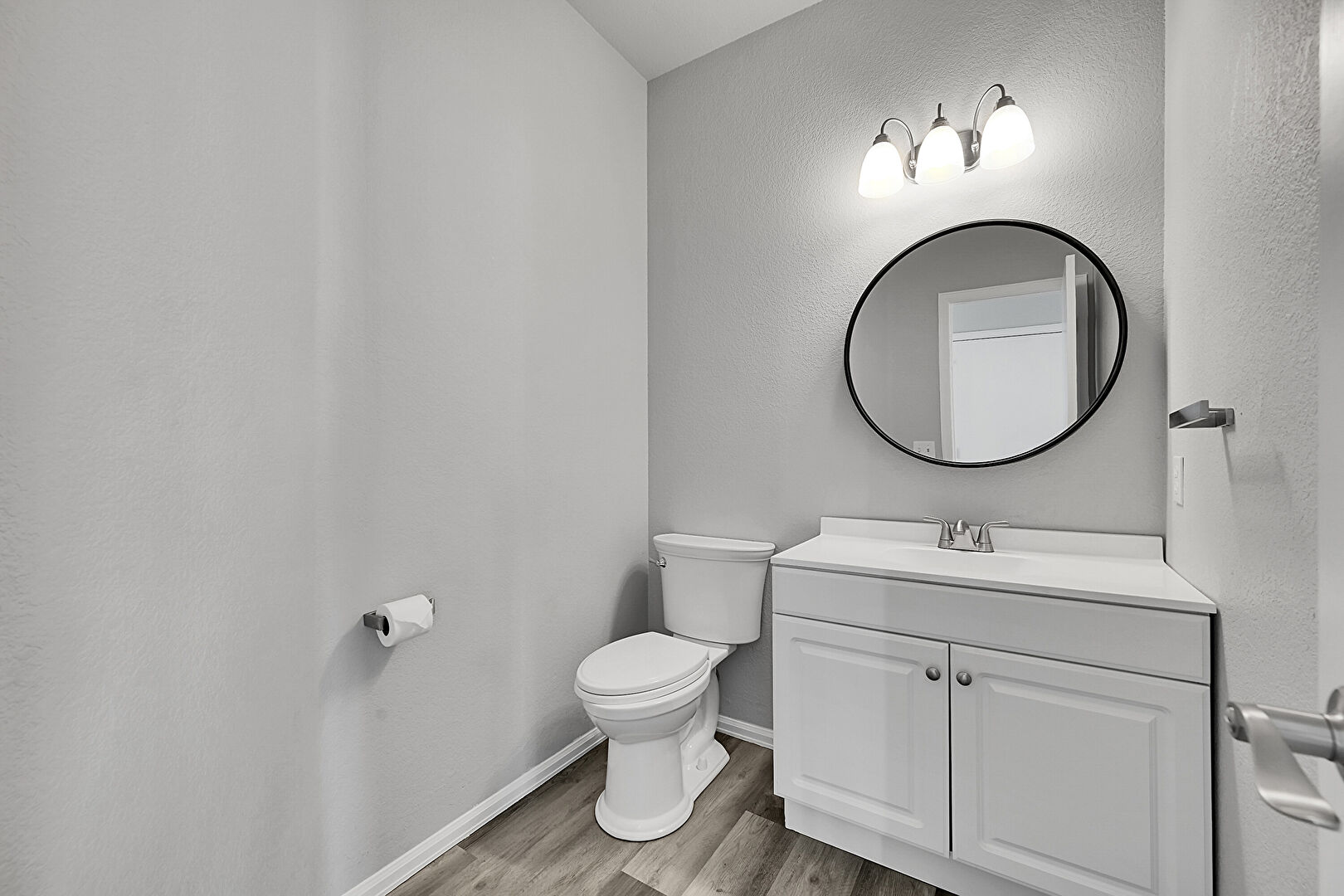 Baseboards Wall, Combined Bath Shower, Full Bathroom, Half Bathroom, Natural Light, Notable Chandelier, Textured Wall, Vanity, Wood Finish Floor, Baseboards Wall, Full Bathroom, Natural Light