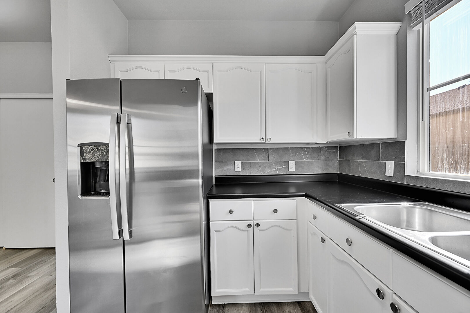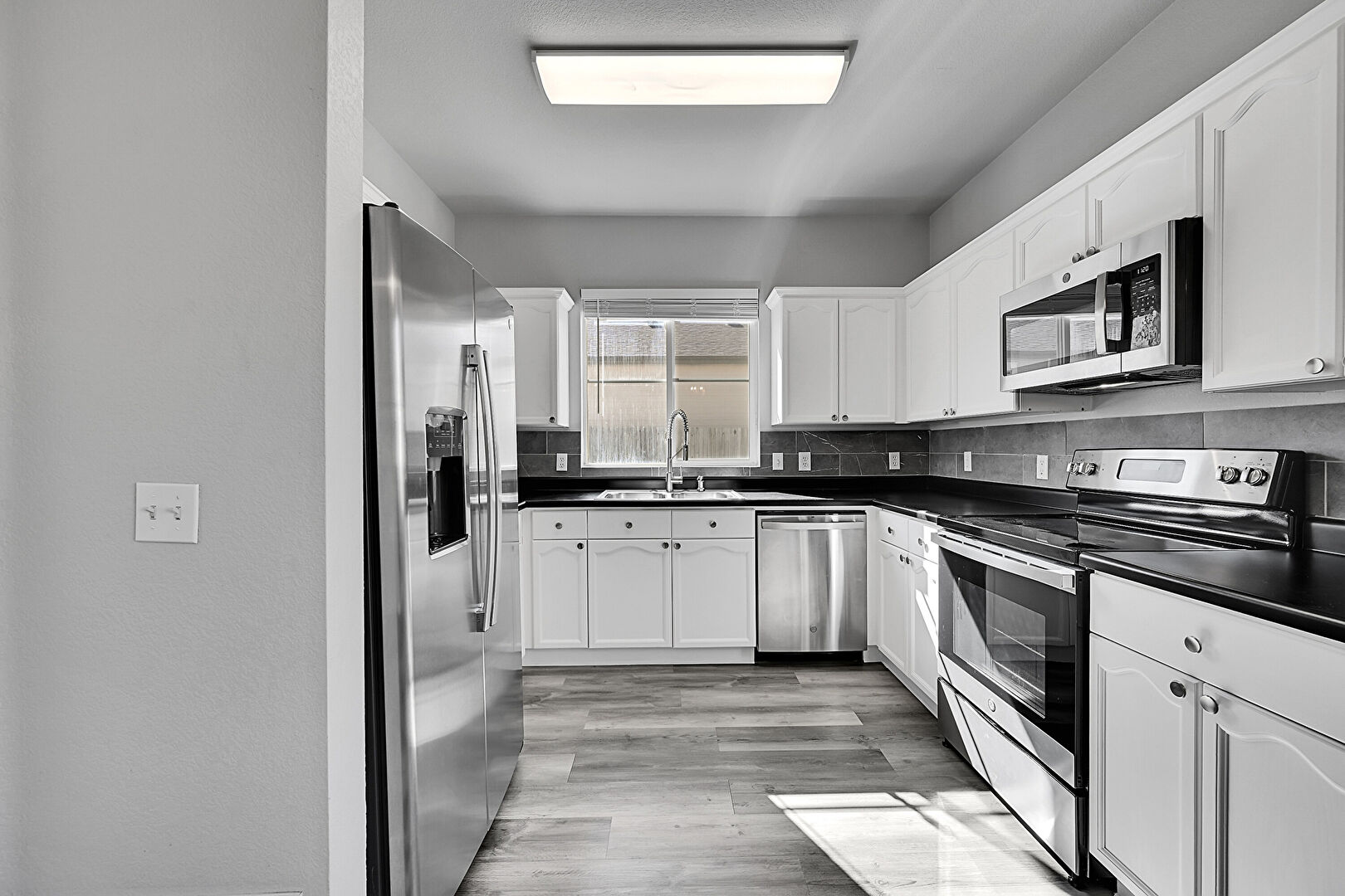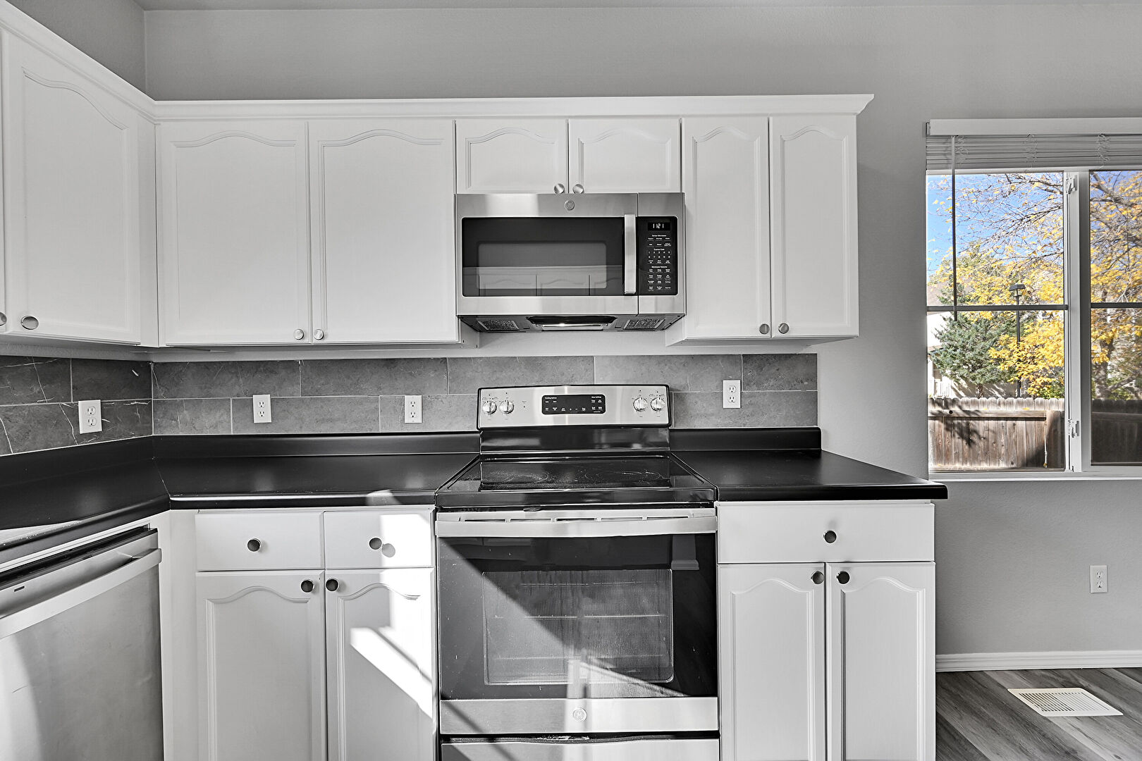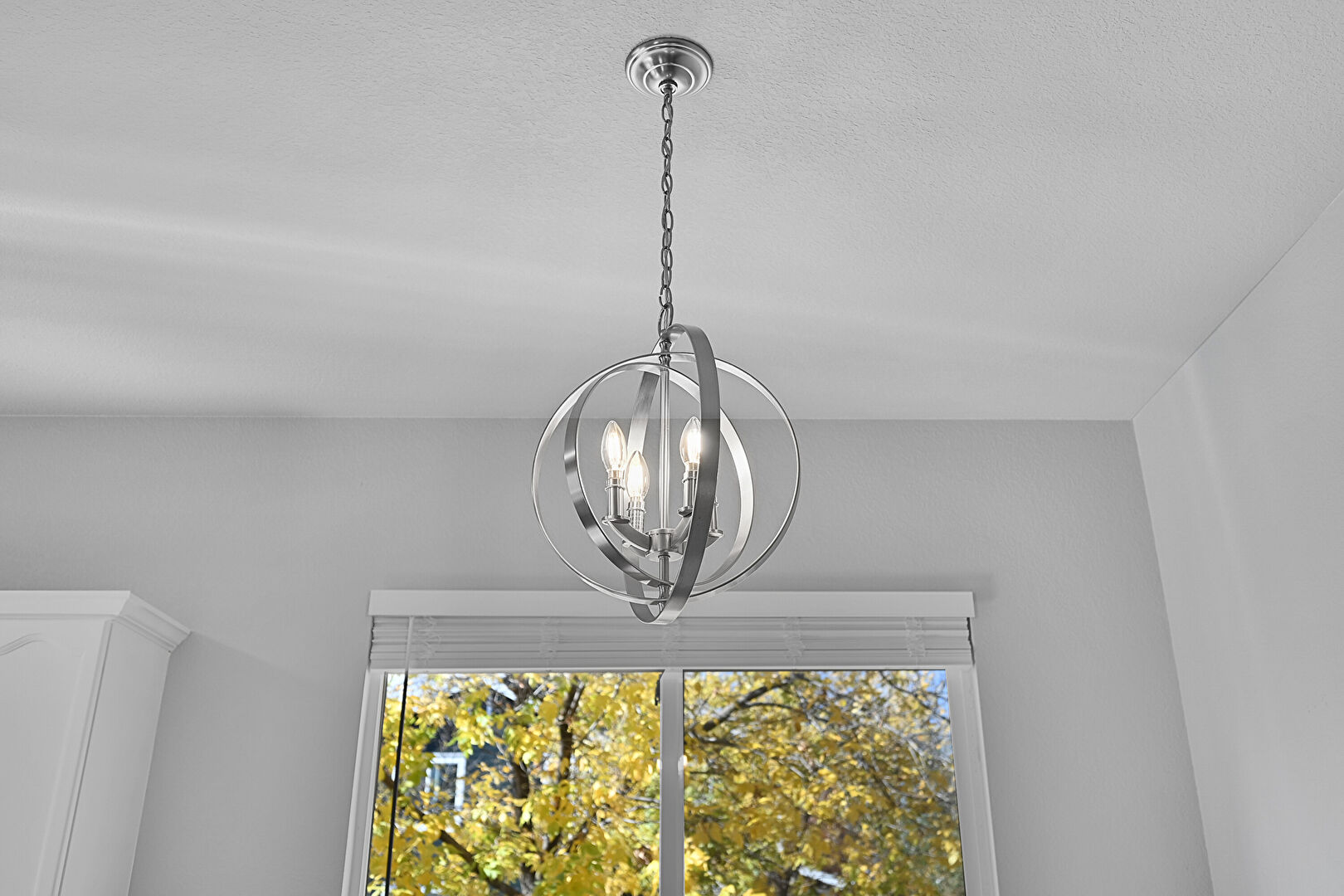 Arched Cabinets, Baseboards Wall, Crown Molding Cabinets, Drywall, Natural Light, Notable Chandelier, Shaker Cabinets, Textured Wall, Vent, Wood Finish Floor, Drywall, Natural Light, Pendant Lighting, Wood Finish Floor