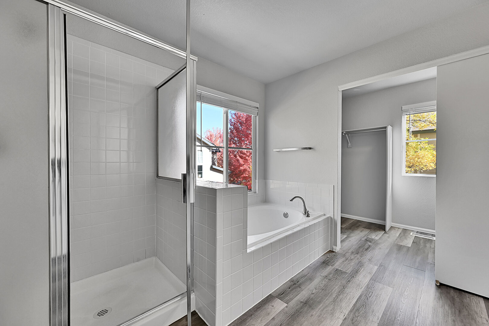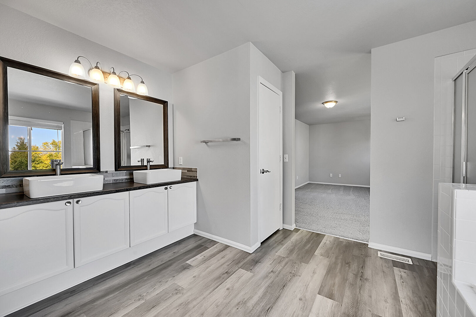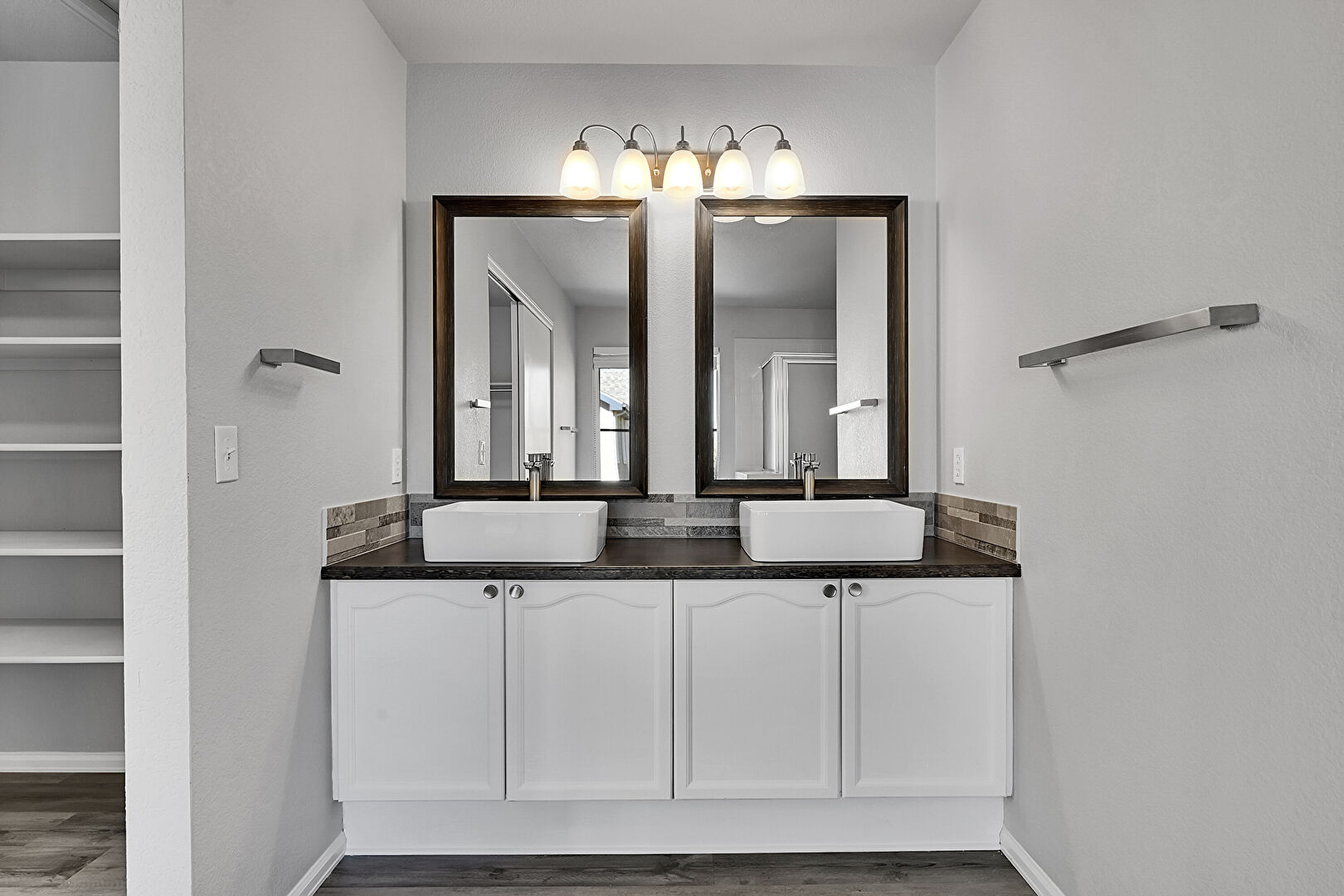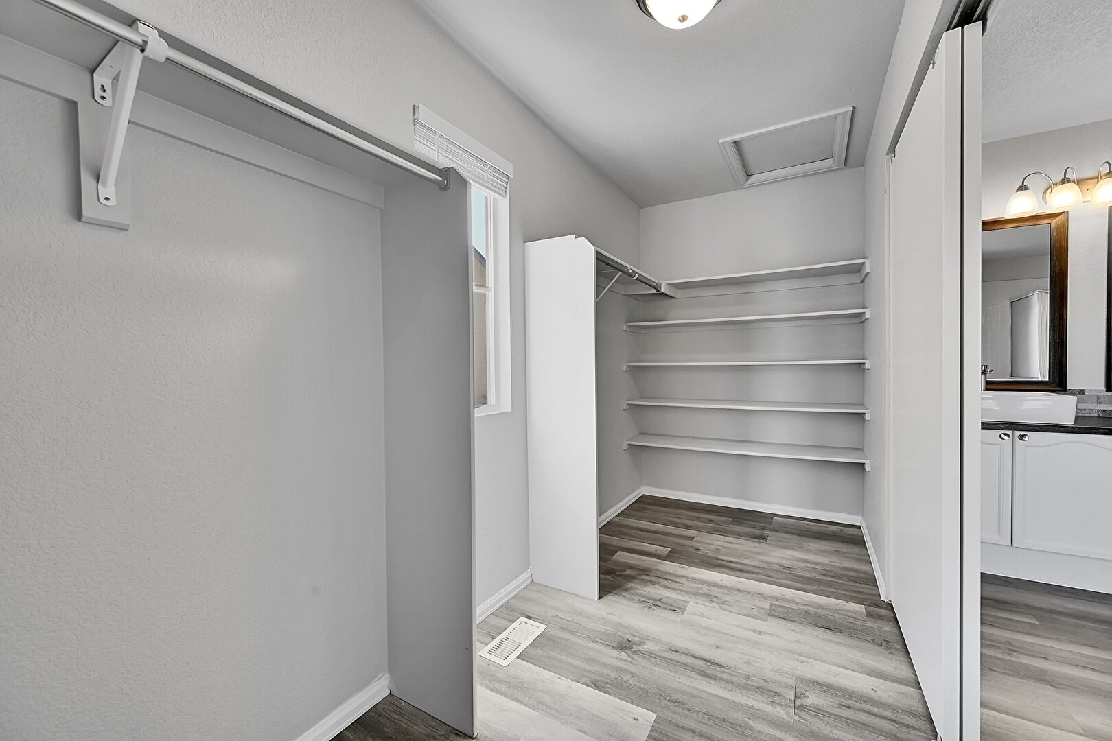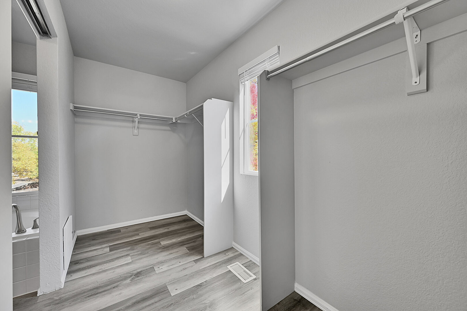 Baseboards Wall, Double Vanity, Drywall, Full Bathroom, Natural Light, Textured Wall, Vent, Walk In Closet, Wood Finish Floor, Double Vanity, Drywall, Natural Light, Textured Wall