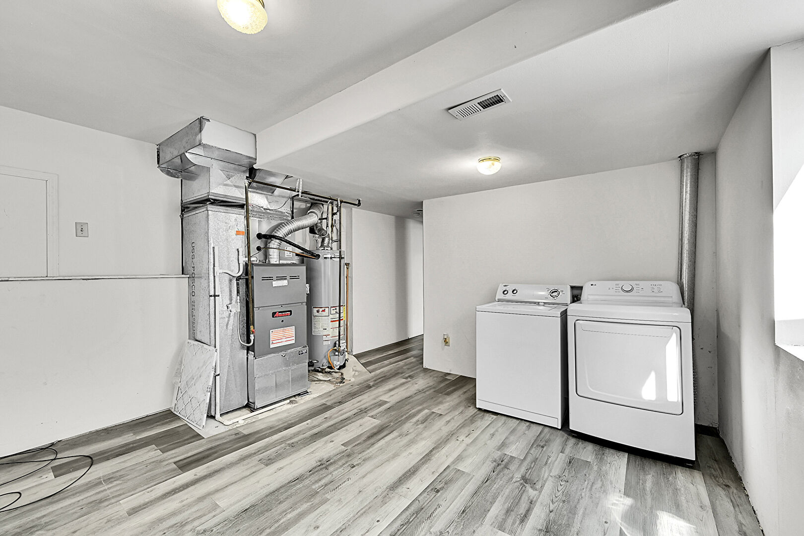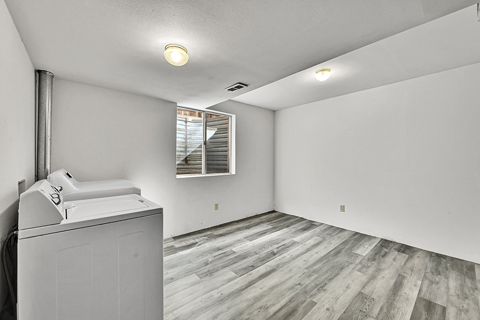 Basement, Drywall, Furnace, Natural Light, Textured Ceiling, Vent, Water Heater, Wood Finish Floor, Laundry