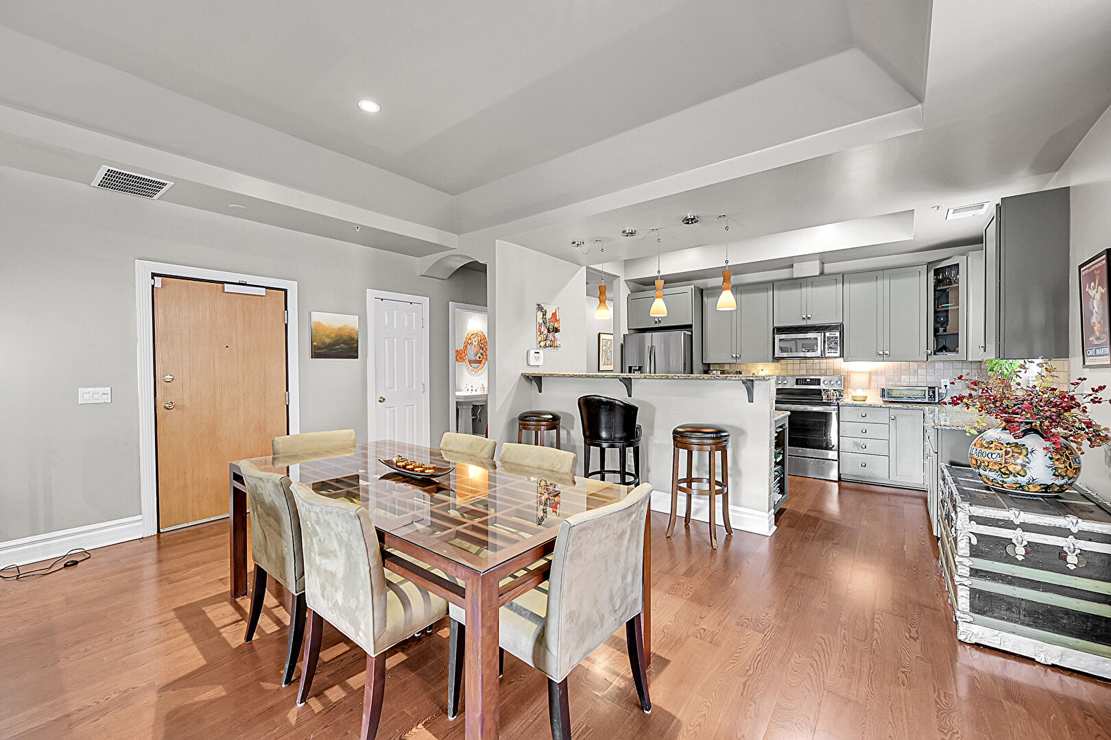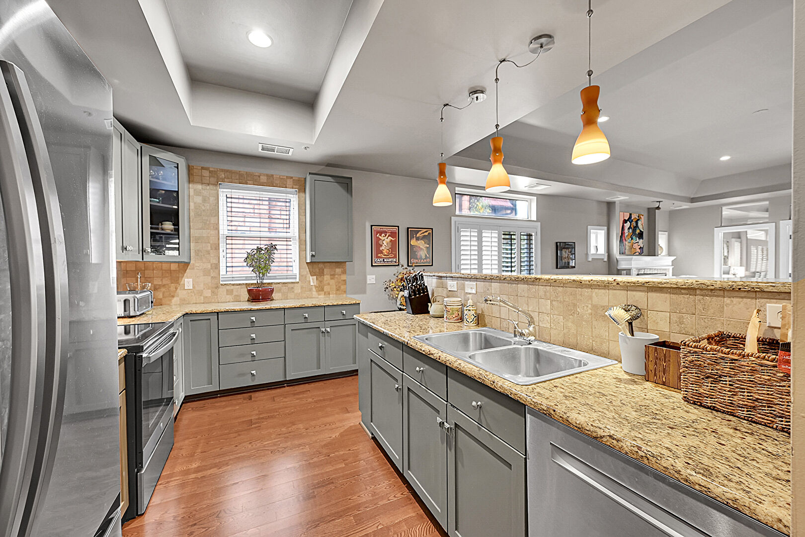 Baseboards Wall, Drywall, Glass Insert Cabinets, Gray Cabinets, Kitchen Bar, Kitchen Peninsula, L Shaped Kitchen, Natural Light, Pendant Lighting, Recessed Lighting, Shaker Cabinets, Stone Countertops, Toaster, Tray Ceiling, U Shaped Kitchen, Vent, Wood Finish Floor, Glass Insert Cabinets, Gray Cabinets, Stone Countertops