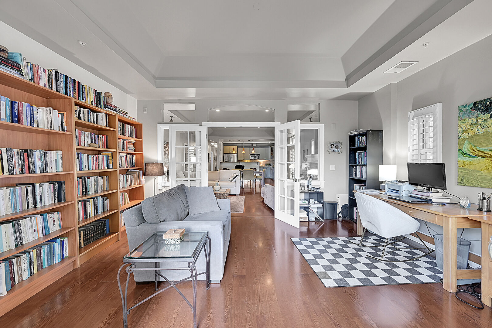 Arched Walkways, Baseboards Wall, Drywall, French Doors, Natural Light, Office Area, Tray Ceiling, Vent, Wood Finish Floor, Drywall, French Doors, Tray Ceiling, Vent