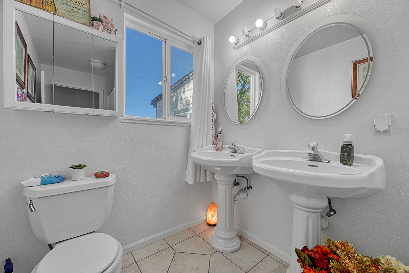 Baseboards Wall, Half Bathroom, Natural Light, Textured Wall, Two Single Sinks, Tile Floor