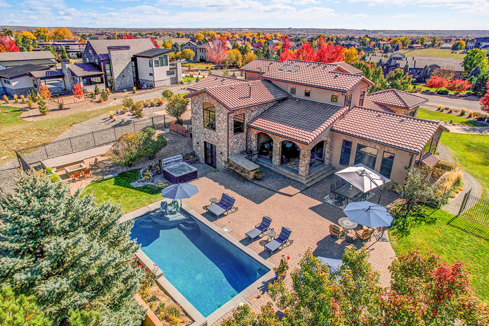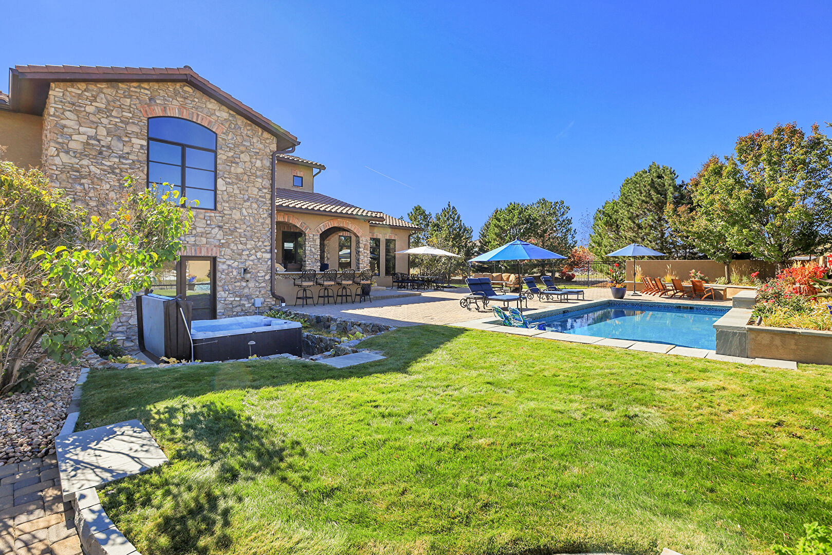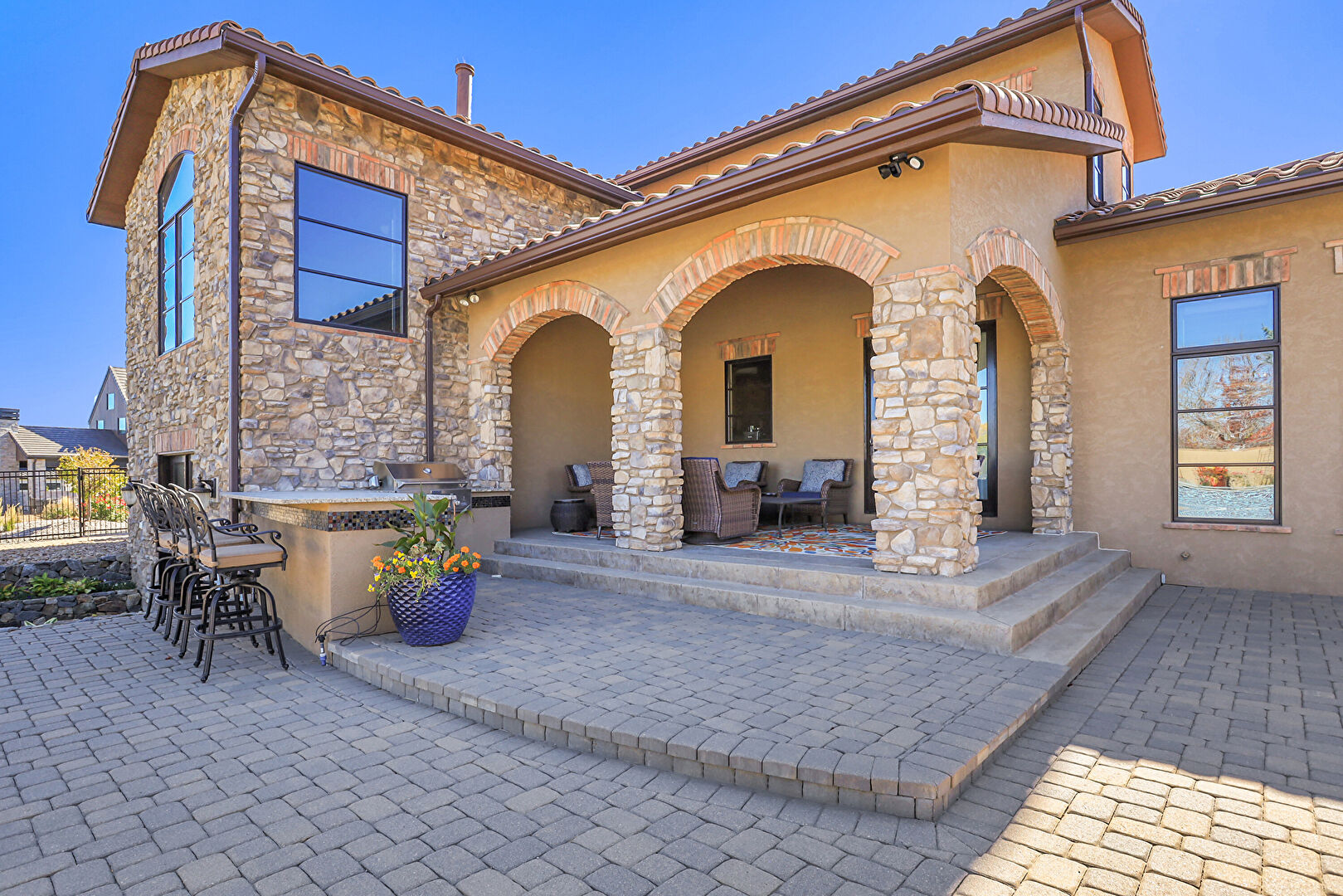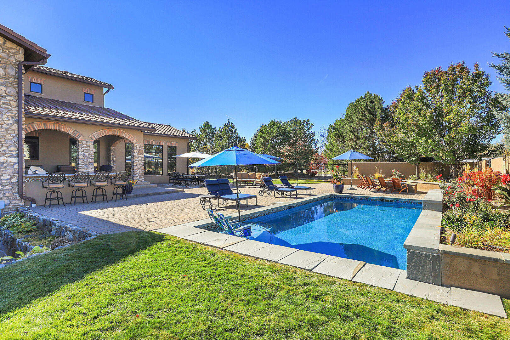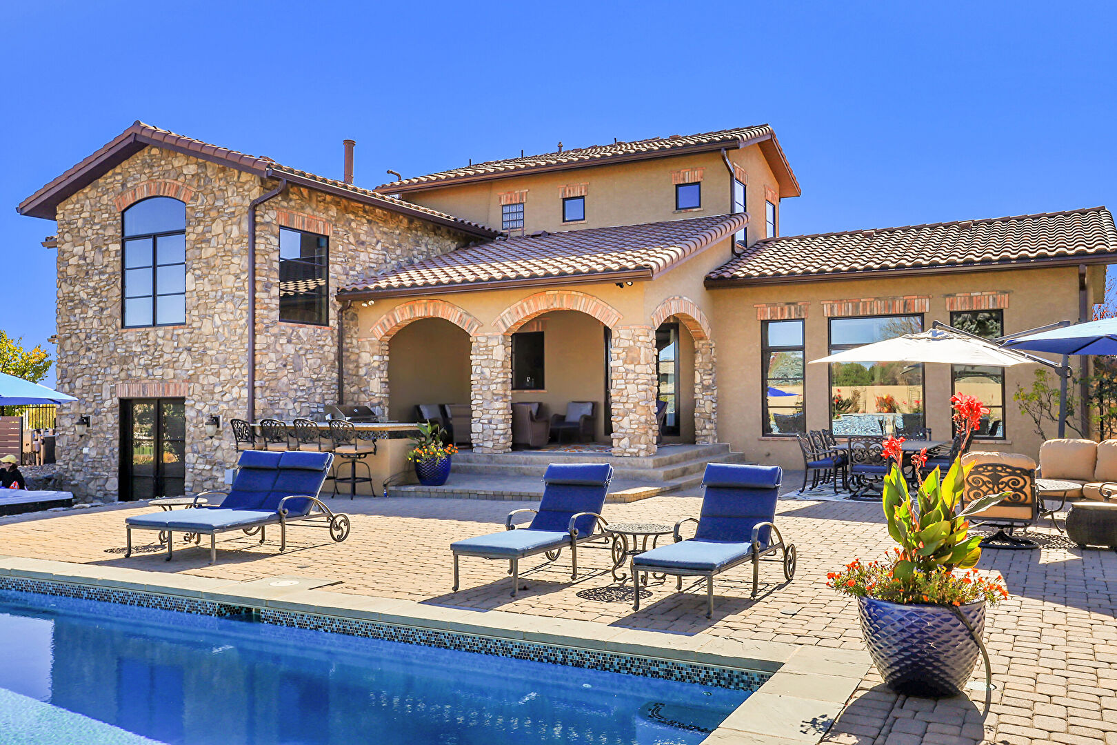 Downspout, Fence, Grill, Lawn, Outdoor Bar, Outdoor Dining Area, Outdoor Living Space, Patio, Pool, Stone Siding, Stucco Siding, Tile Roof, Fence, Gutters, Outdoor Kitchen, Outdoor Living Space, Patio, Pool