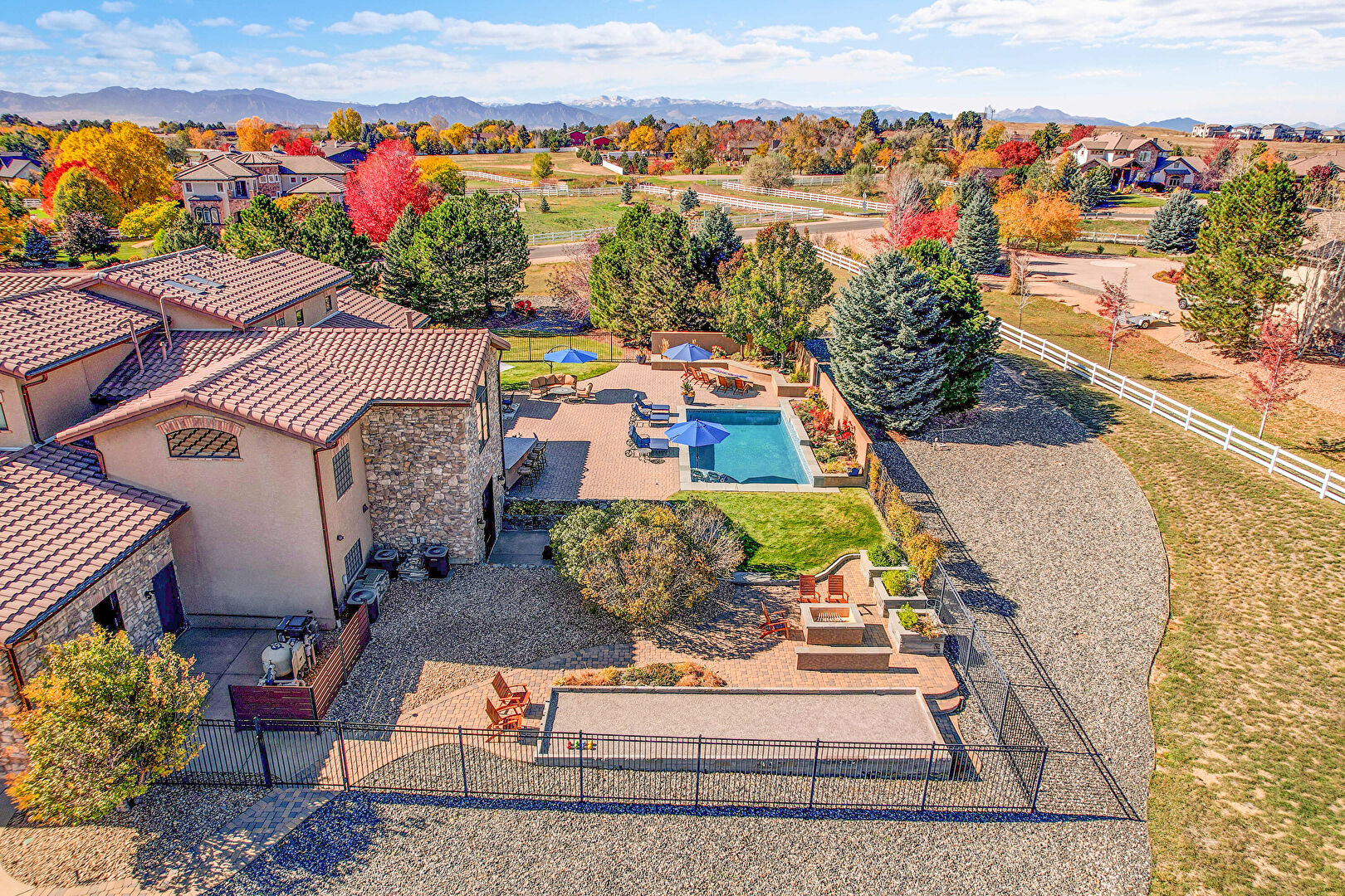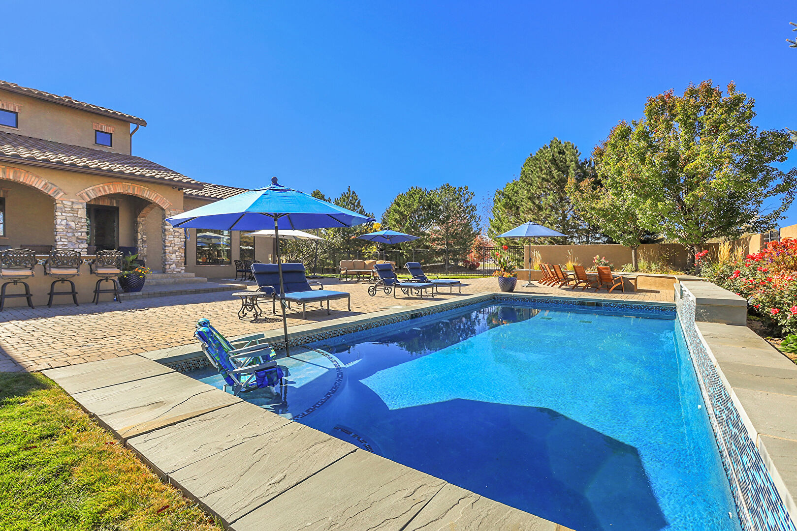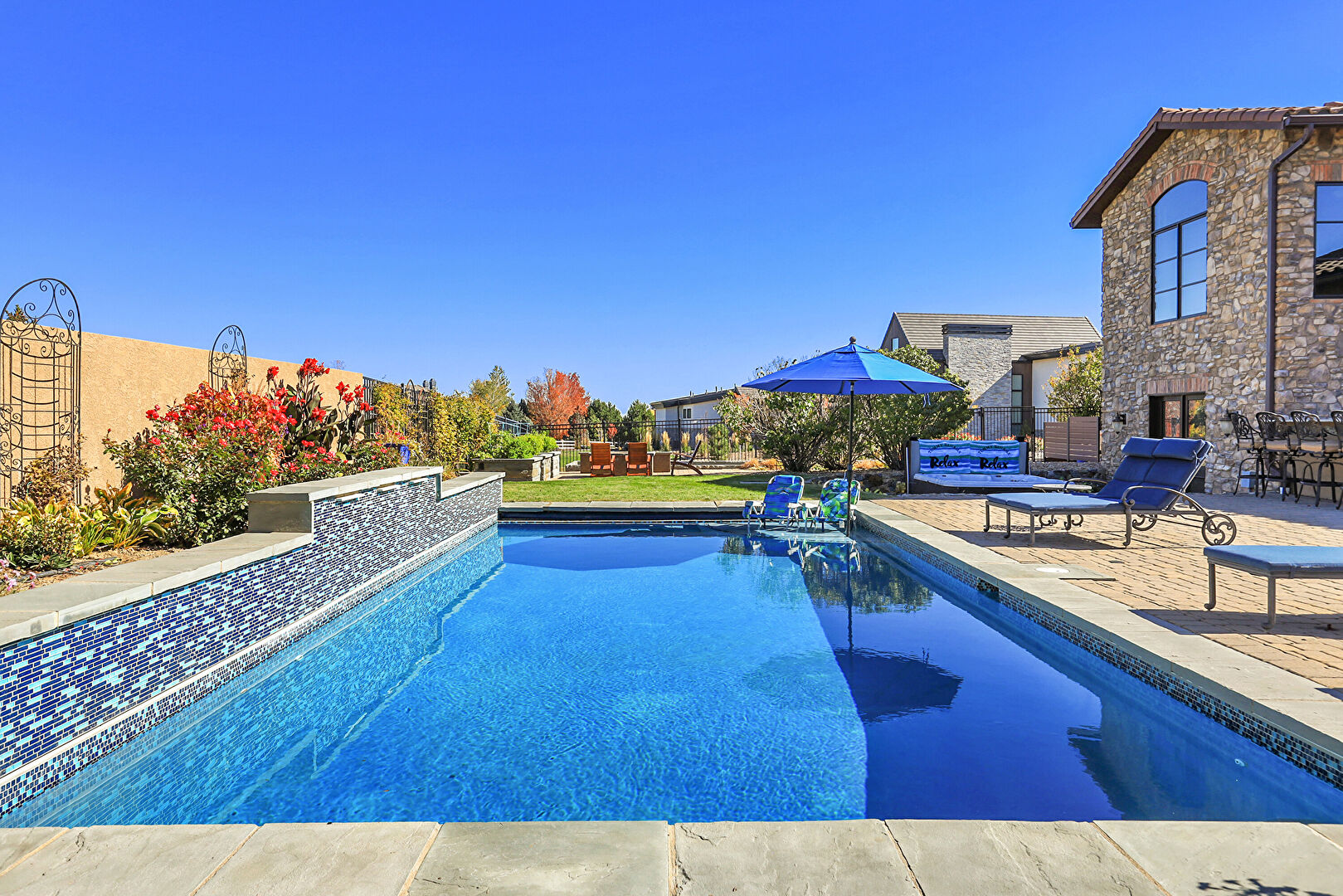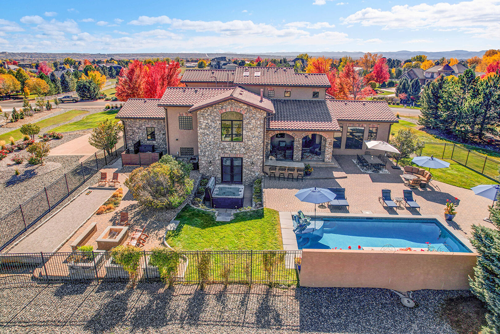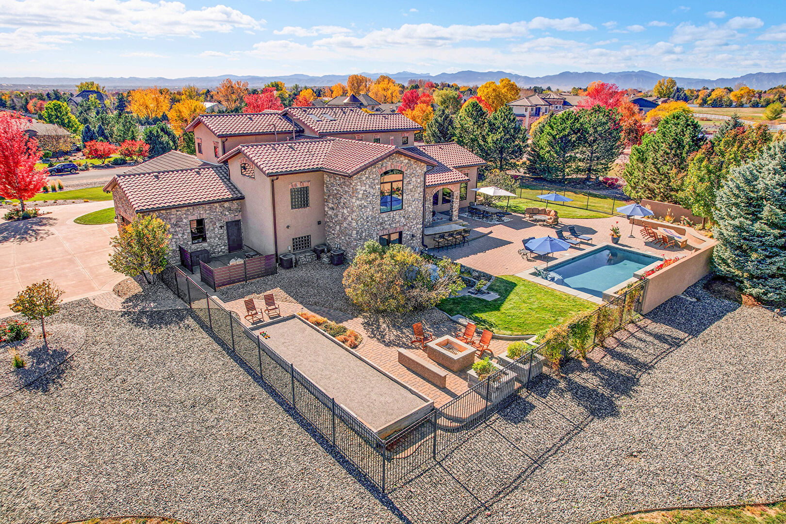 Downspout, Fence, Grill, Lawn, Outdoor Bar, Outdoor Dining Area, Outdoor Living Space, Patio, Pool, Stone Siding, Stucco Siding, Tile Roof, Fence, Gutters, Outdoor Kitchen, Outdoor Living Space, Patio, Pool